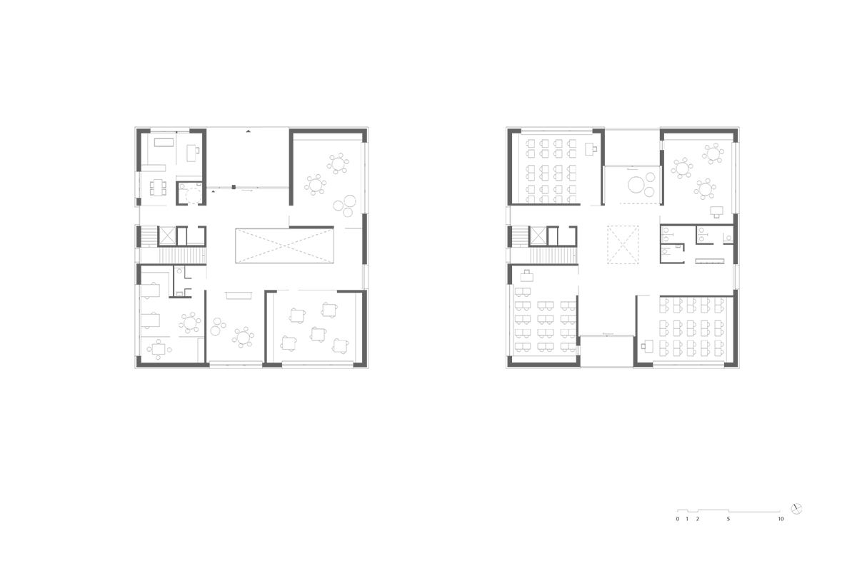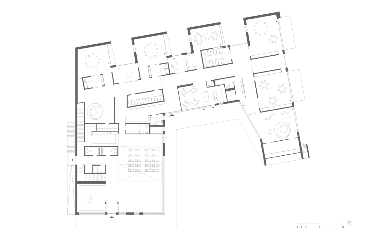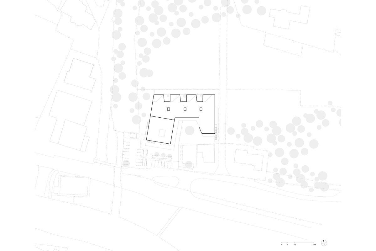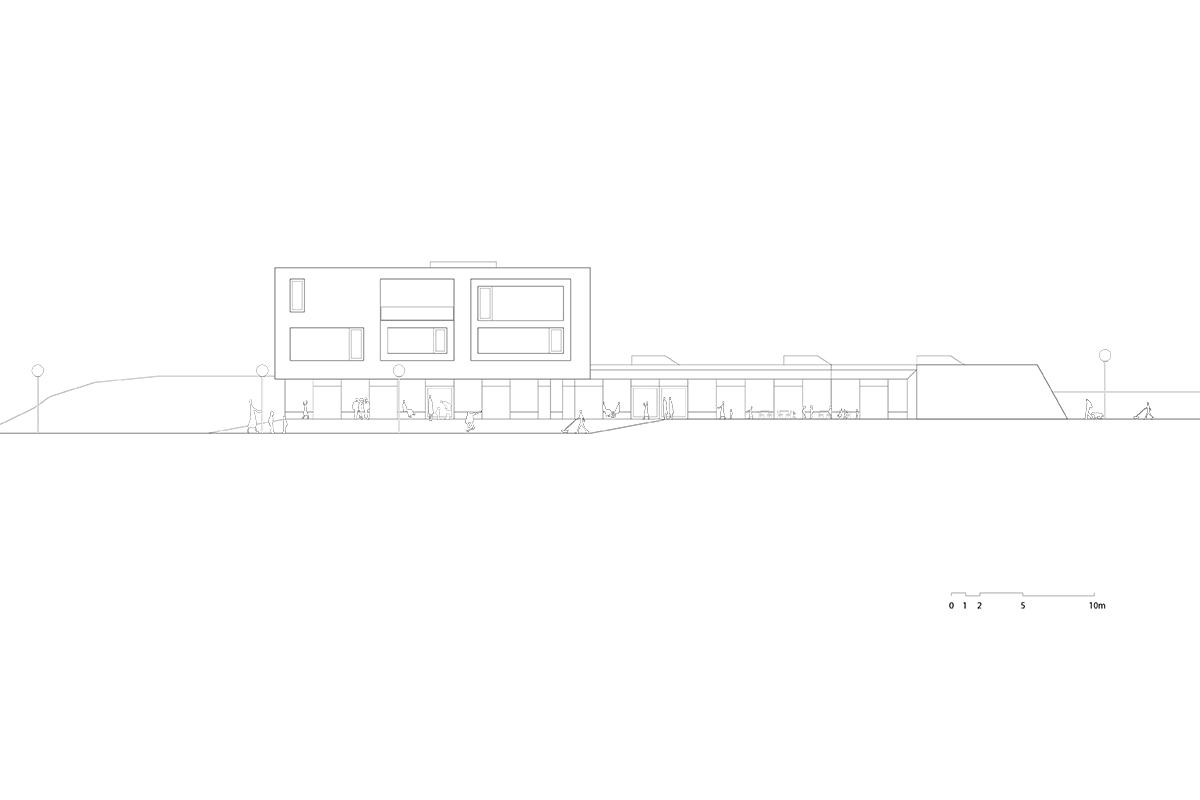Výsledné architektonické a priestorové riešenie definuje trojica prevádzkovo nezávislých celkov. Čiastočne zapustené segmenty materskej školy a jaslí splývajú s okolitým terénom a vytvárajú zelenú podnož pre dominantný blok základnej školy. Štvorica tried, určených pre predškolákov, vystupuje nad líniu lúky a terasy, pričom vymedzujú chránené exteriérové herne.