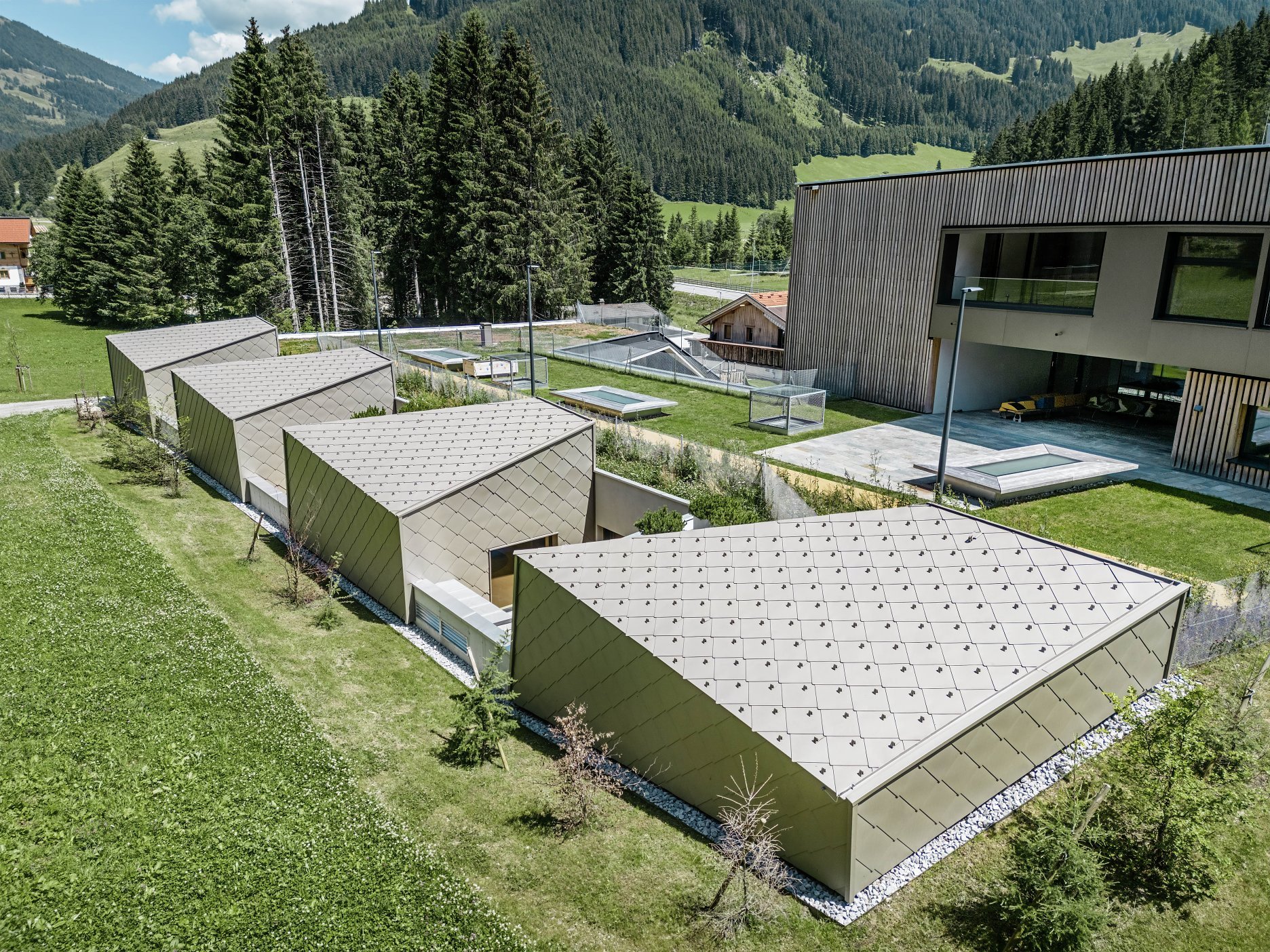 Použité materiály a riešenia: hliníkové strešné šablóny PREFA 44 × 44 a fasádne šablóny PREFA 44 × 44 v bronzovej farbe.