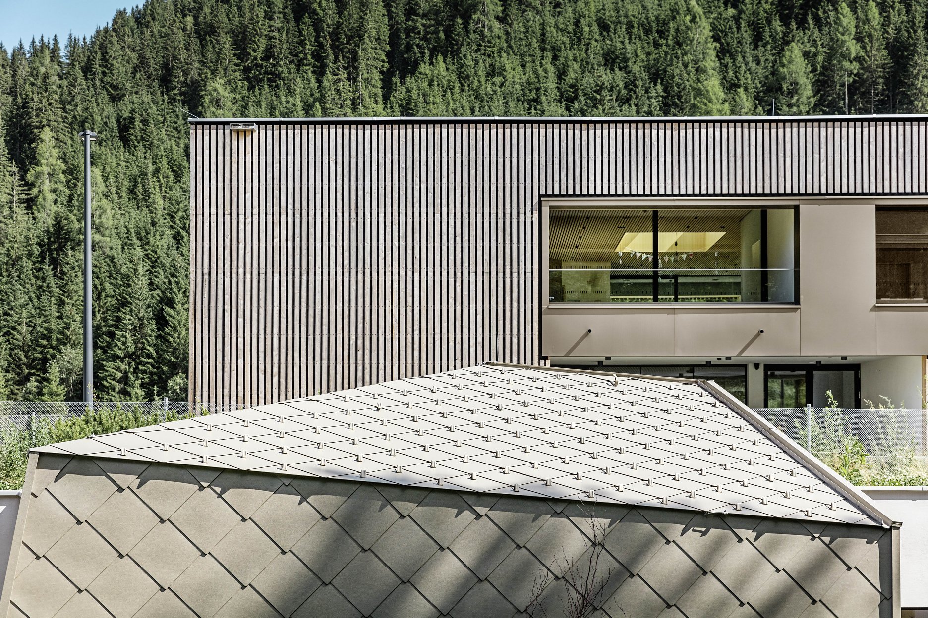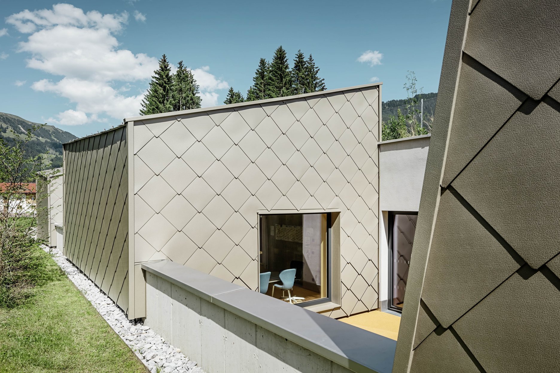 Materiálové riešenie ortogonálneho bloku školy charakterizuje drevený obklad, rozsiahle presklenie a pohľadový betón, prechádzajúci aj do interiéru. Protiklad ku klasickému stvárneniu ústredného bloku tvorí spomínaná štvorica tried pre predškolákov. Kryštalické hmoty, s rôznymi uhlami skosenia, sú opláštené strešnými a fasádnymi šablónami PREFA s rozmermi 44 × 44 cm. Zjednotené povrchy s jemnými detailmi prispievajú k zjednoteniu objemov a ich solitérnemu vyzneniu. Architekti siahli po trvácnej hliníkovej krytine aj vzhľadom na jej preverenú odolnosť v horskom prostredí.