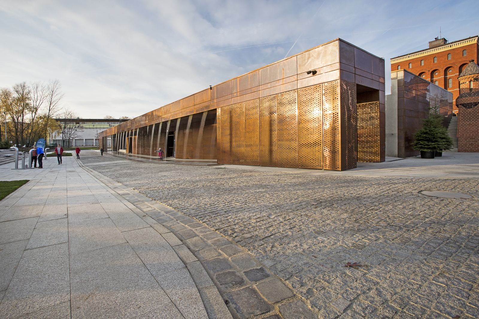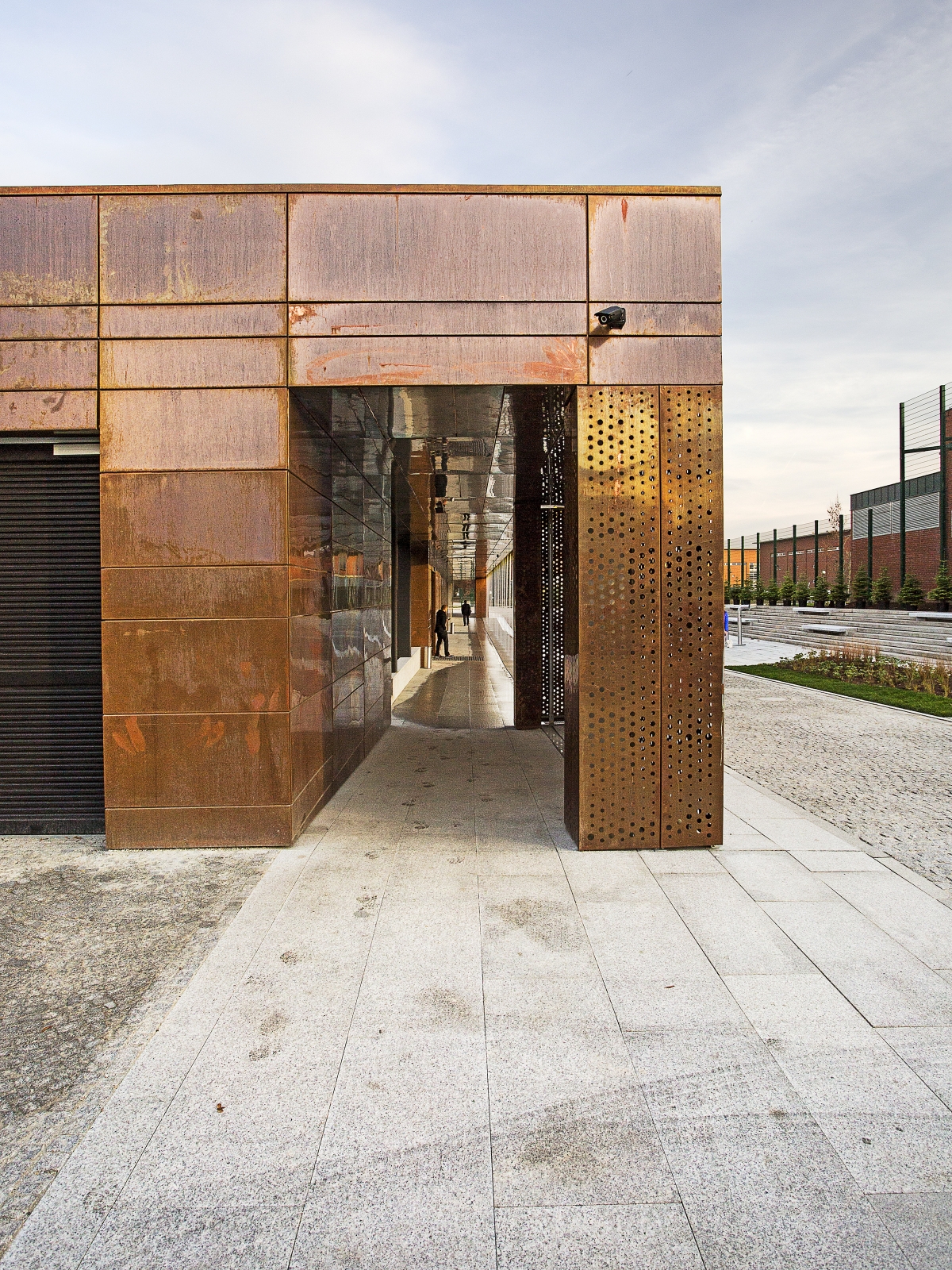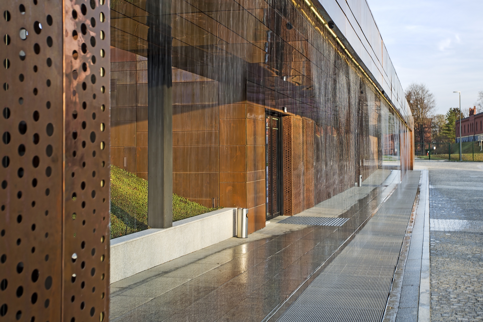 Vstupný priestor je navrhnutý ako nová budova k existujúcemu rezervoáru vody. Fasáda nových častí materiálovo ladí s neďalekou vodárenskou vežou - významnou architektonickou a technickou pamiatkou Vroclavi z 19. storočia. Pre vstupné priestory boli navrhnuté prírodné materiály ako betón, sklo a meď, ktorá bola použitá aj na pôvodných rezervoároch.