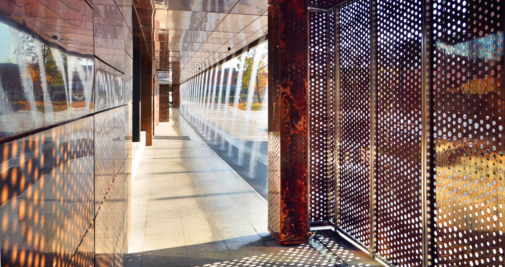 Fasády budovy sú väčšinou pokryté len hladkým alebo dierovaným medeným plechom. Na vnútorných povrchoch bola použitá predoxidovaná meď.