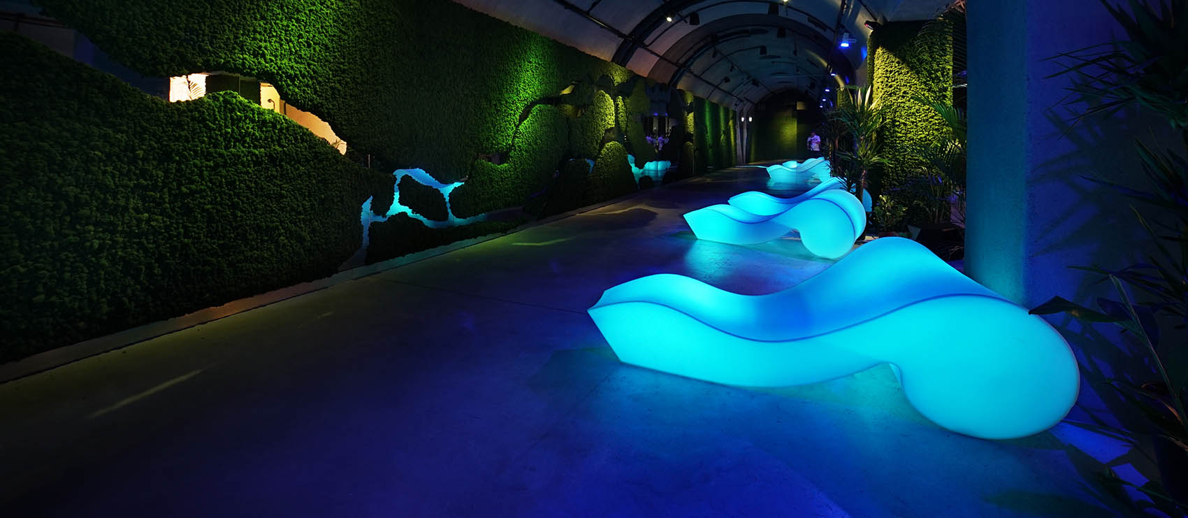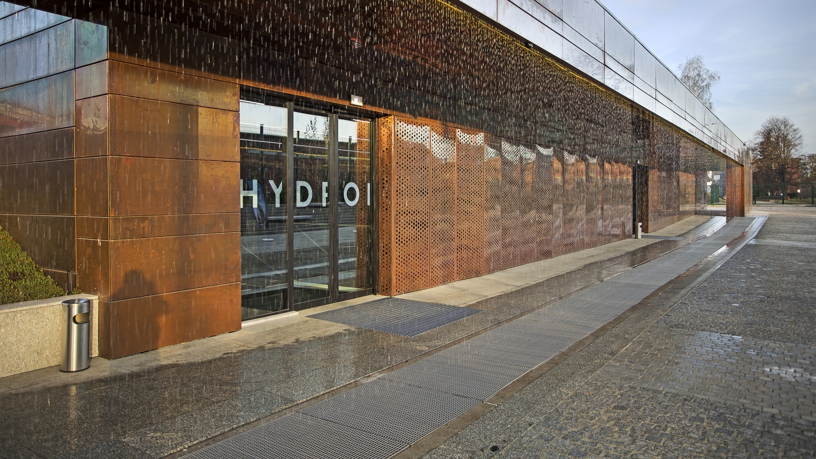Zaujímavosťou tejto stavby je fasáda vstupného priestoru, ktorá ponúka návštevníkom atrakciu v podobe 46,5m dlhej vodnej steny. Mechanizmus s tečúcou a padajúcou vodou je navrhnutý tak, že voda vytvára rôzne tvary, vzory alebo nápisy.