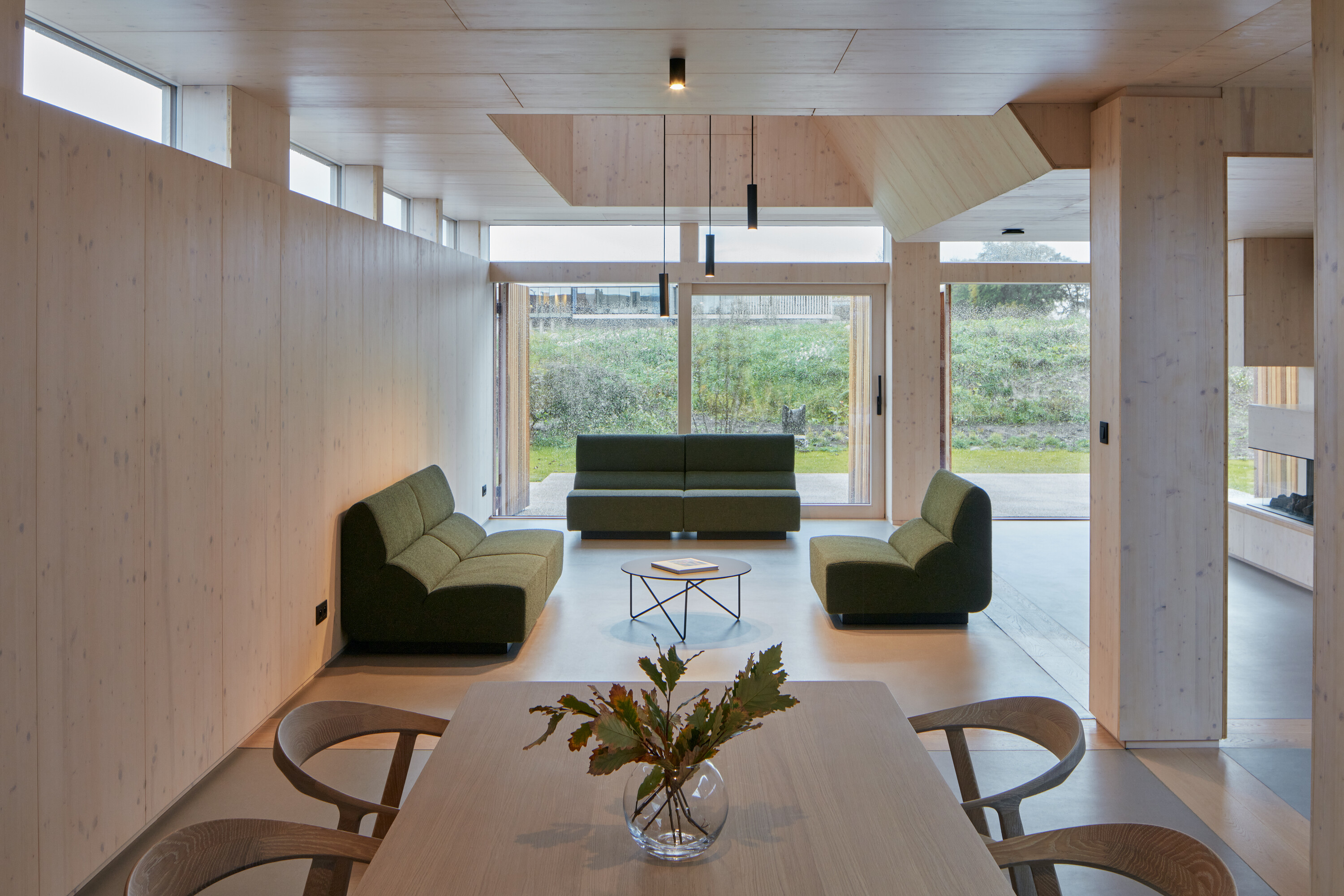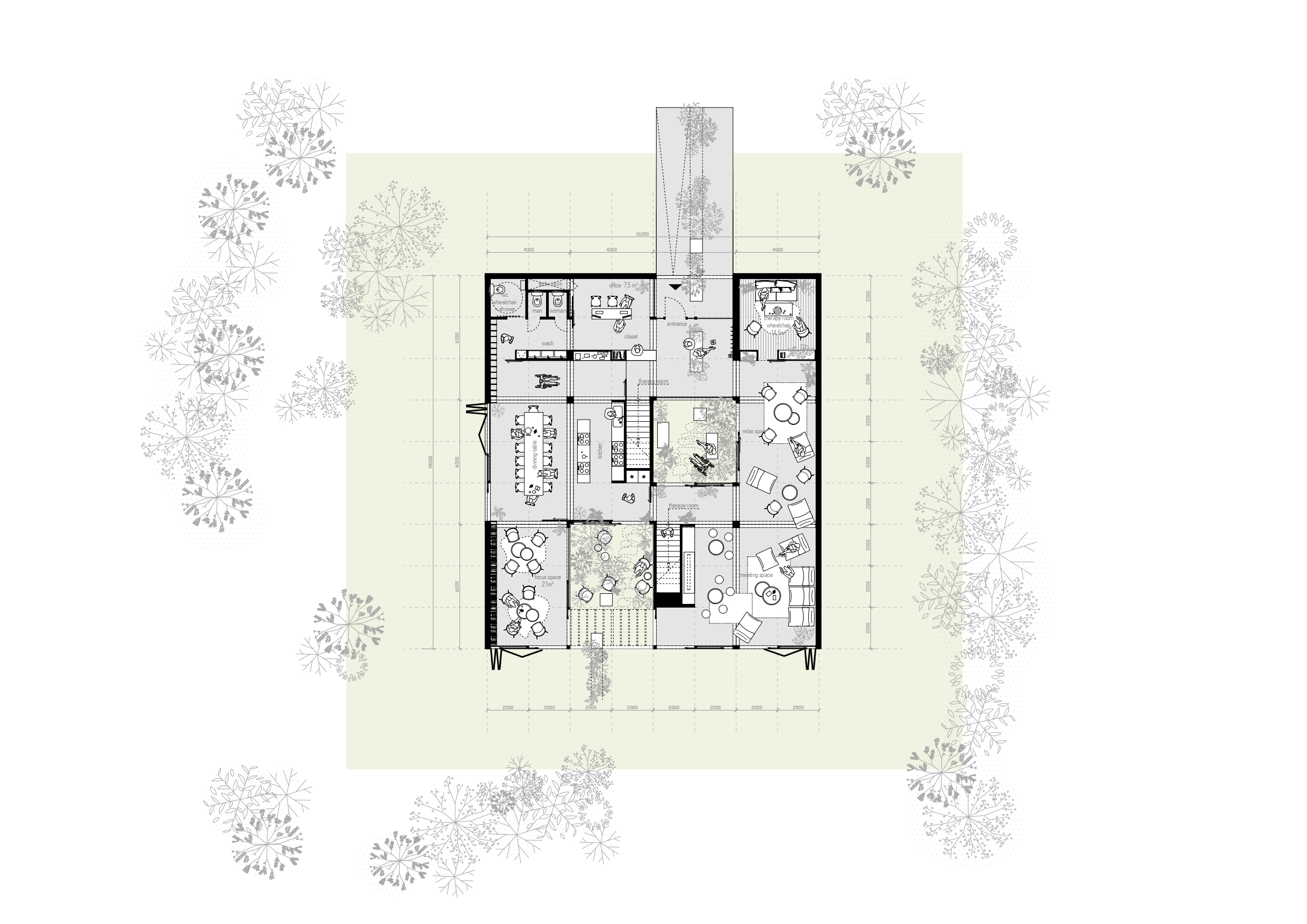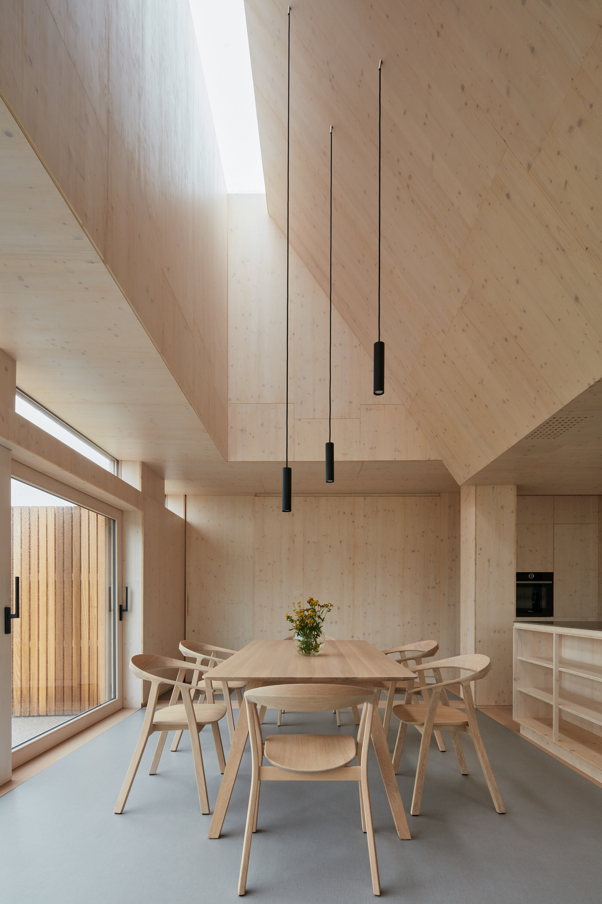 K dispozícii je teplý krb, ktorý ľudí spojí, prinesie teplo a pohodlie. Do tohto priestoru sa flexibilne zmestí rôzne usporiadanie sedadiel na pohodlné stretnutia - od jednotlivcov až po osemčlenné skupiny. Jedáleň je srdcom domu. Miesto s najväčším množstvom svetla, ktoré ponúka priestor na stretnutie pre introvertov aj extrovertov, slnko a tieň, výhľad von alebo do príjemného dvora. Chránený, ale nie uzavretý…