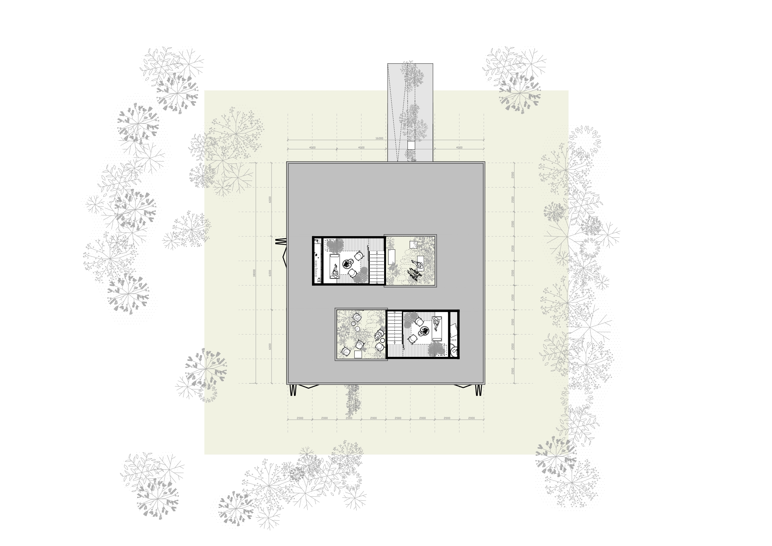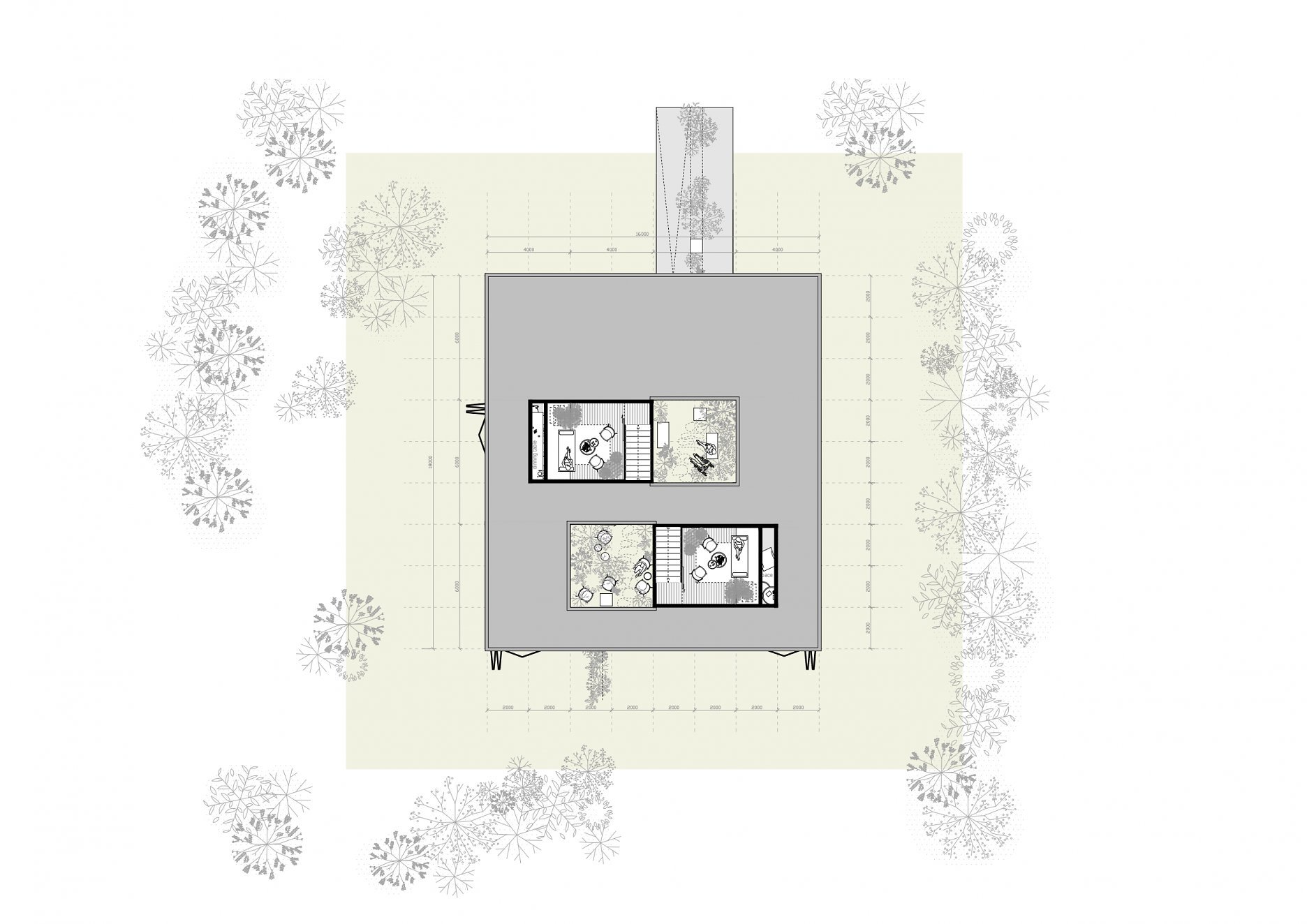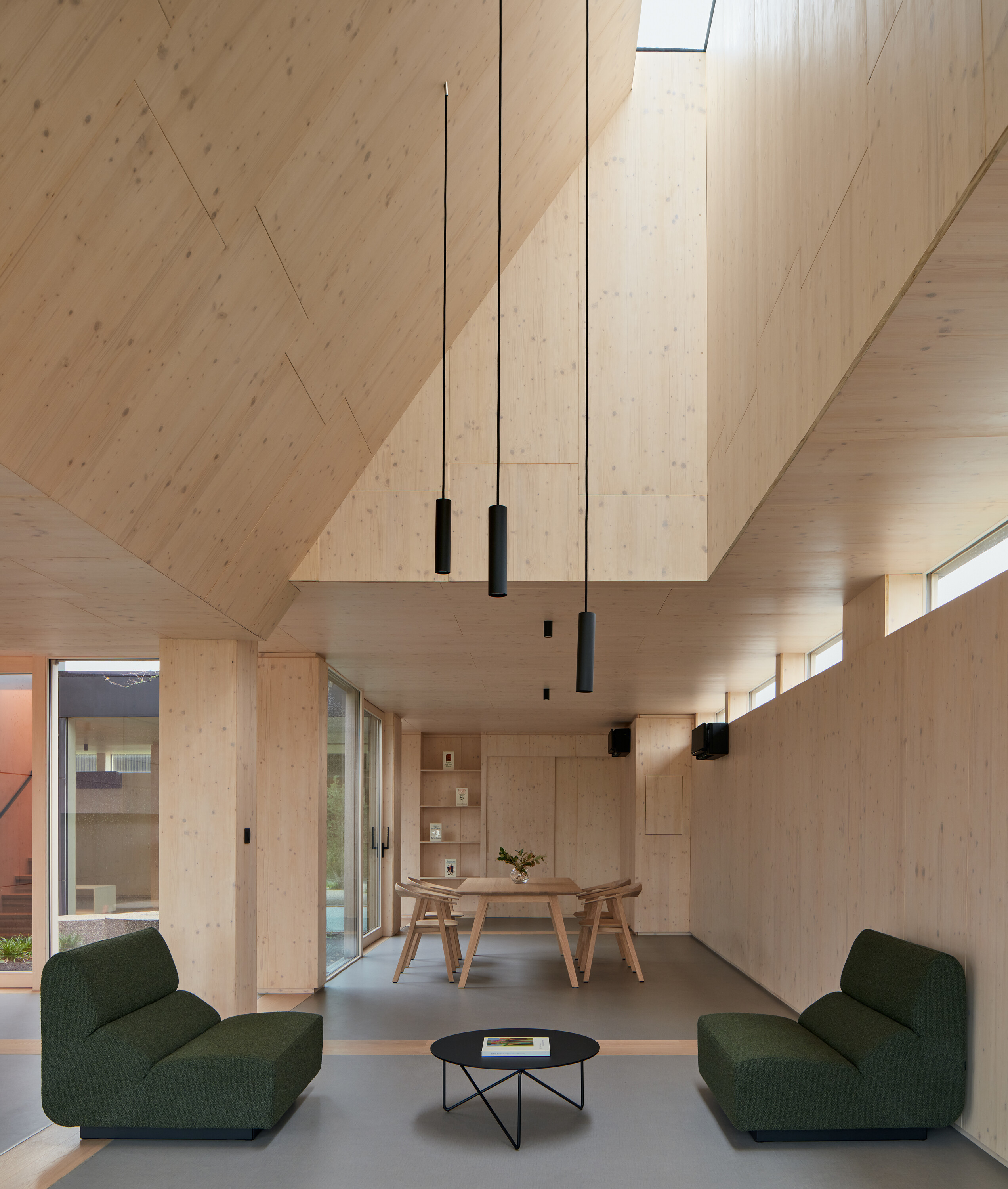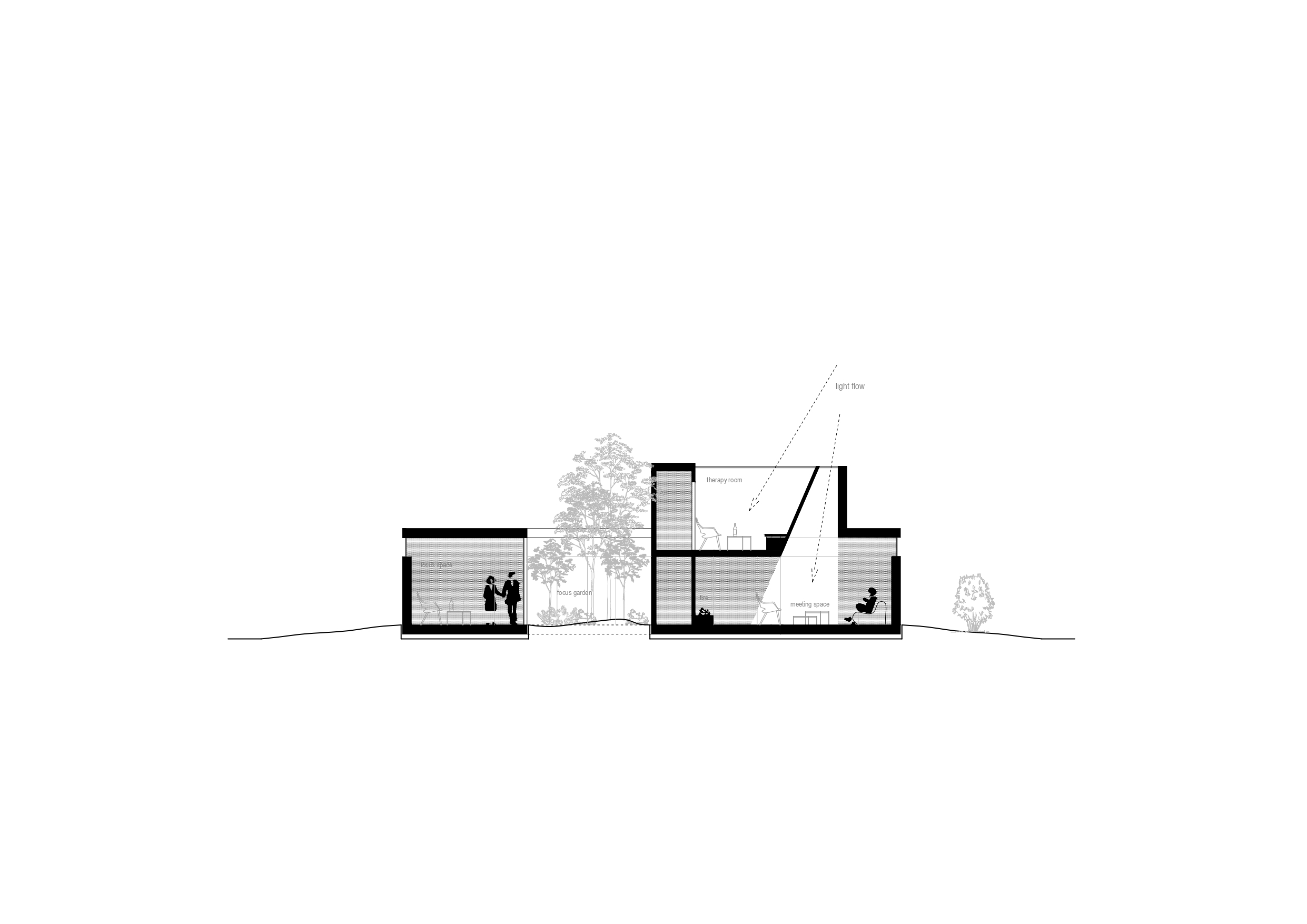 Miestnosť pre skupinovú terapiu je otvorená a prispôsobiteľná od skupinových poschodových sedení až po formálnejšie prostredie. Túto miestnosť možno využívať úplne voľne, podľa individuálnych požiadaviek. Za každých okolností je táto miestnosť naplnená svetlom, má strešné okno, aby priestor vyžaroval otvorenosť a aby sa ľudia mohli ľahšie spojiť. Terasa je chránená drevenou stenou, ktorá chráni pred vetrom alebo pohľadmi. Poskytuje bezpečie a súkromie a možnosť vychutnať si chvíľu vzduchu, nádychu či pokoja.