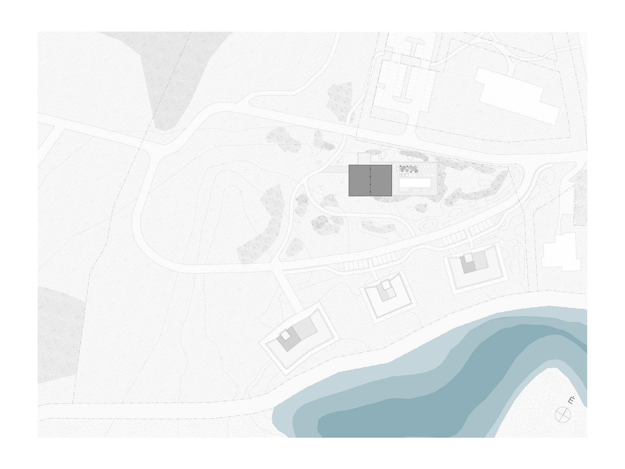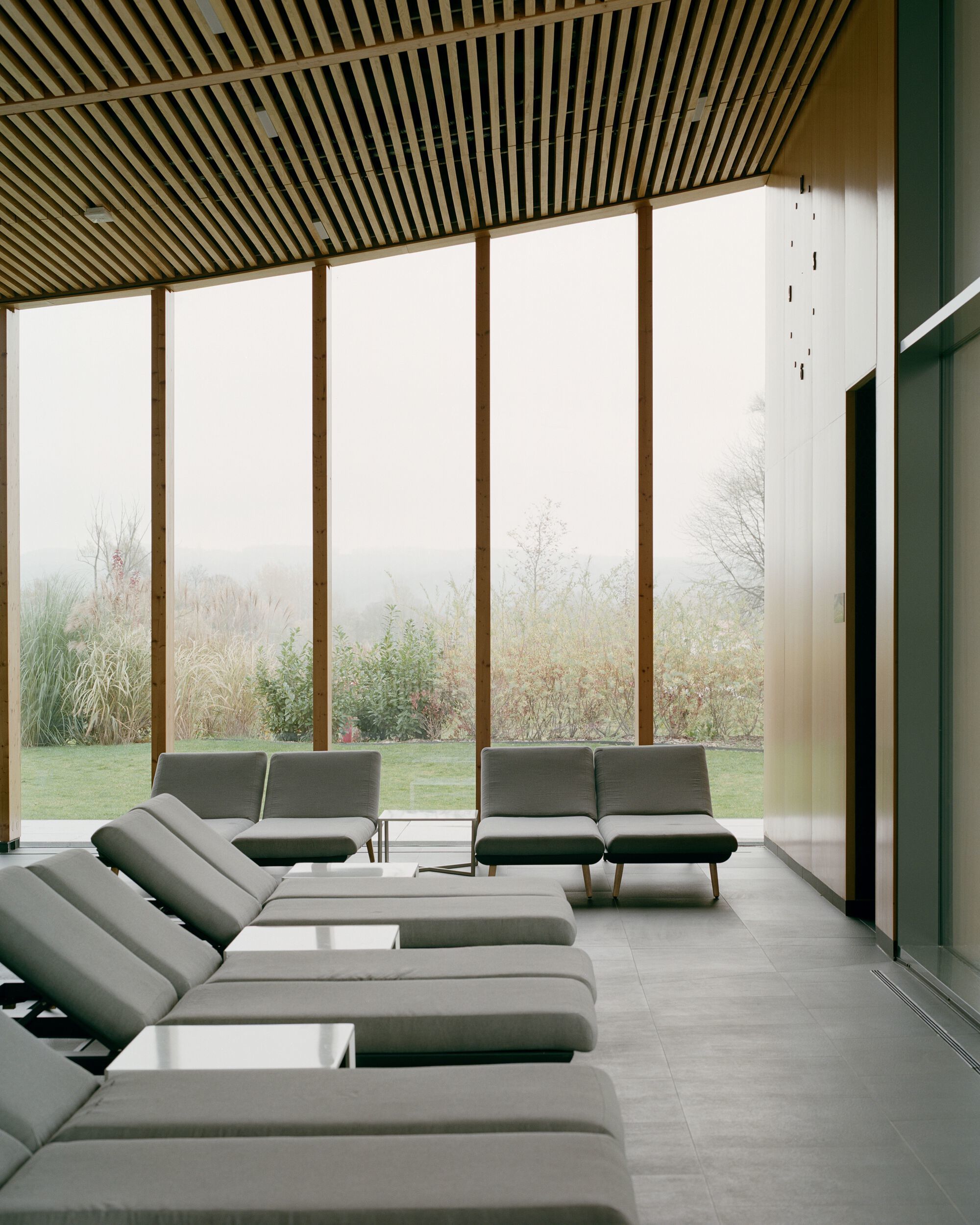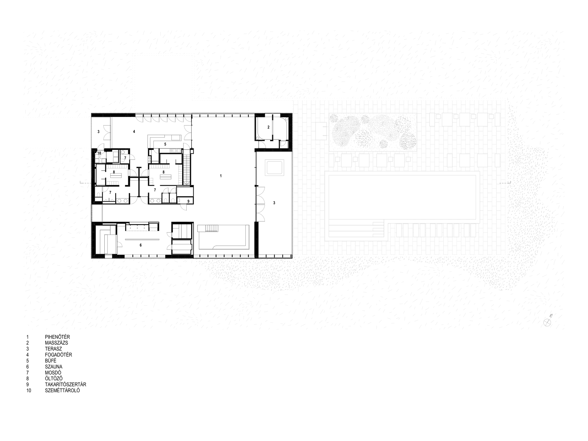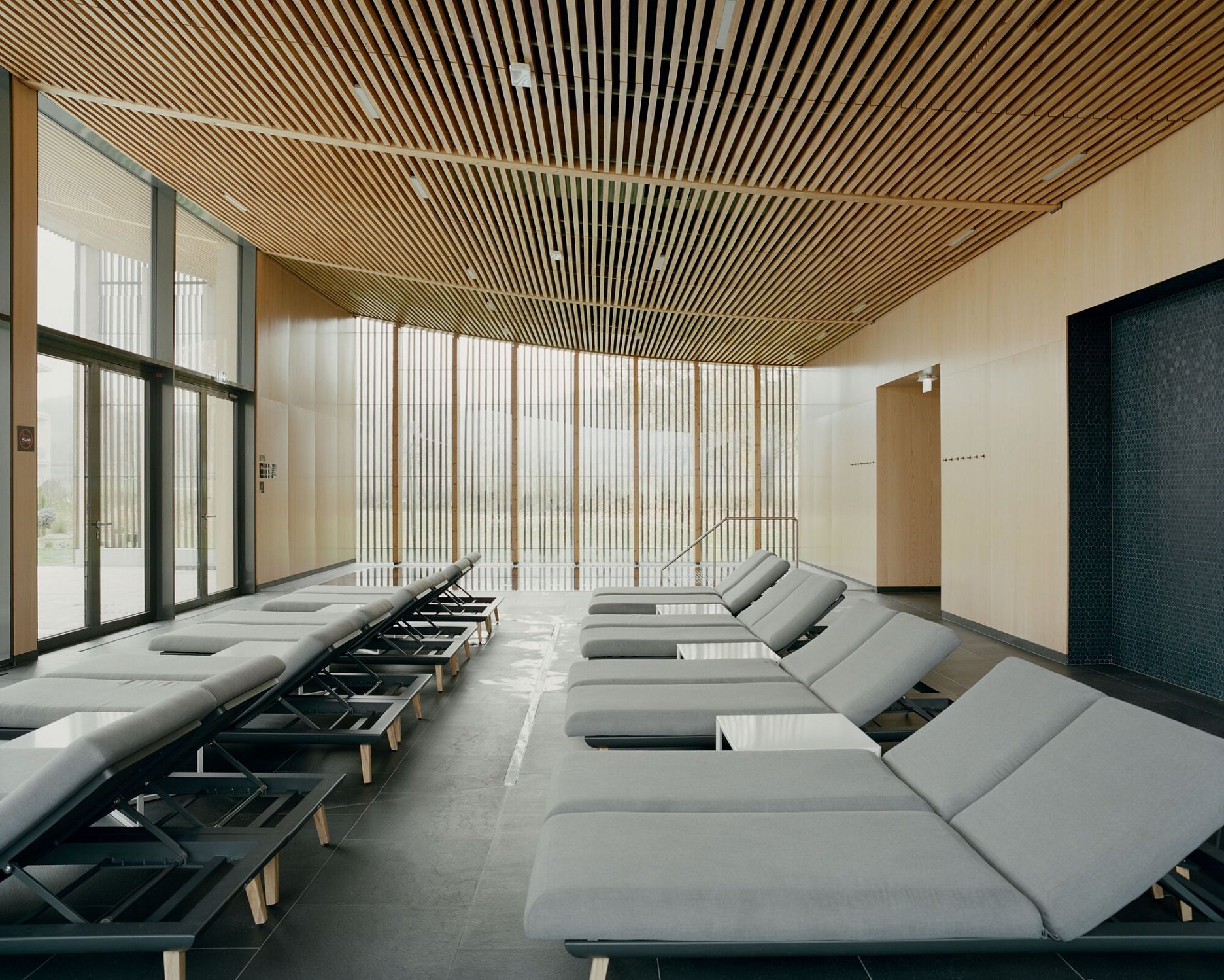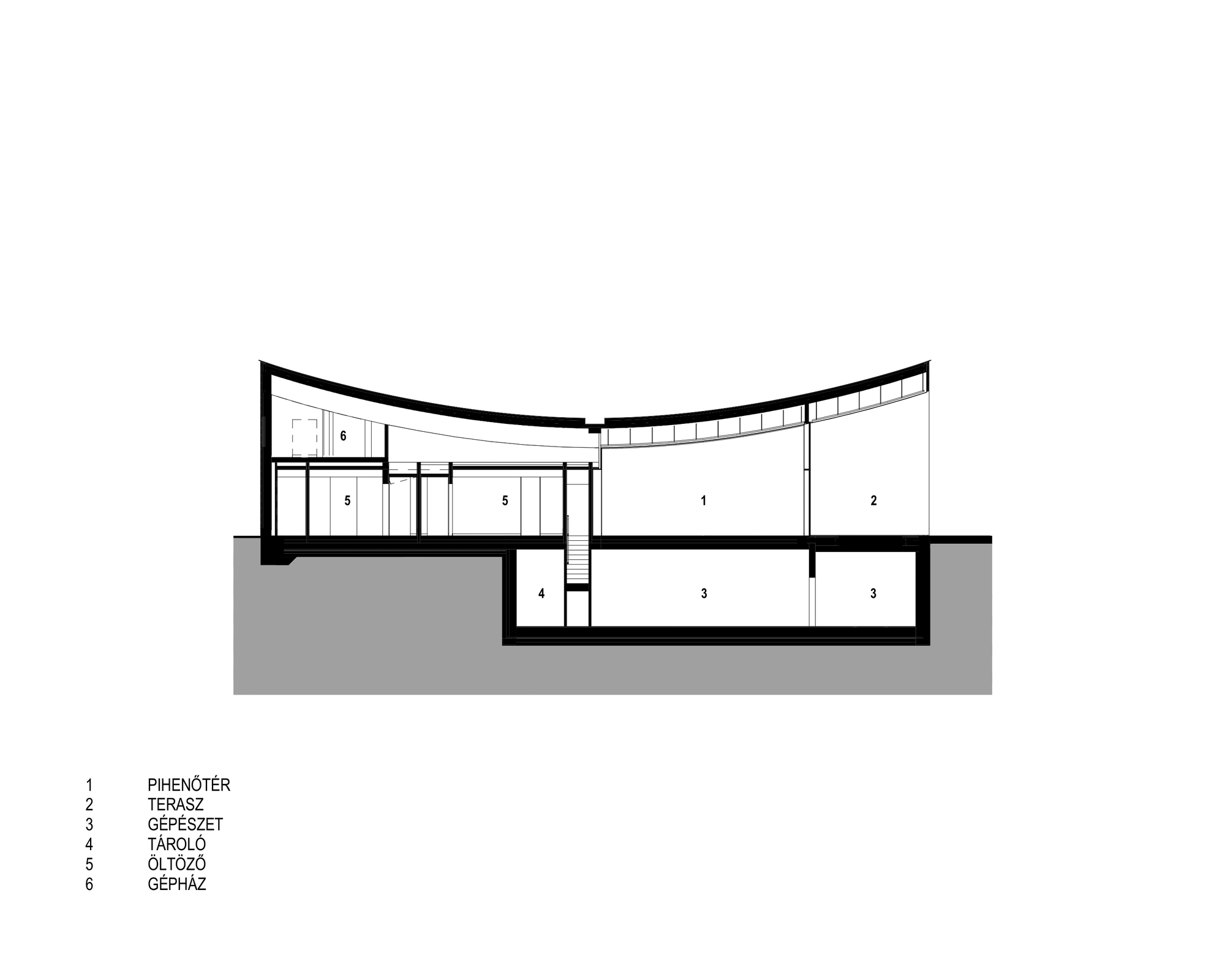 Monolitická spodná stavba integruje všetko potrebné technické zázemie pre prevádzku bazéna a saunového sveta. Na úrovni prízemia preto vznikol priestor pre ľahkú a otvorenú drevostavbu, kde môžu hostia využiť bazén, oddýchnuť si v saune, navštíviť masážne kóje a pobyt zavŕšiť v oddychovej zóne, alebo v kaviarni. Celý zážitok sprevádzajú pohľady do okolitej zelene. Kapacita je dimenzovaná na 30 - 40 hostí, ubytovaných v letných mesiacoch v rámci golfového areálu.