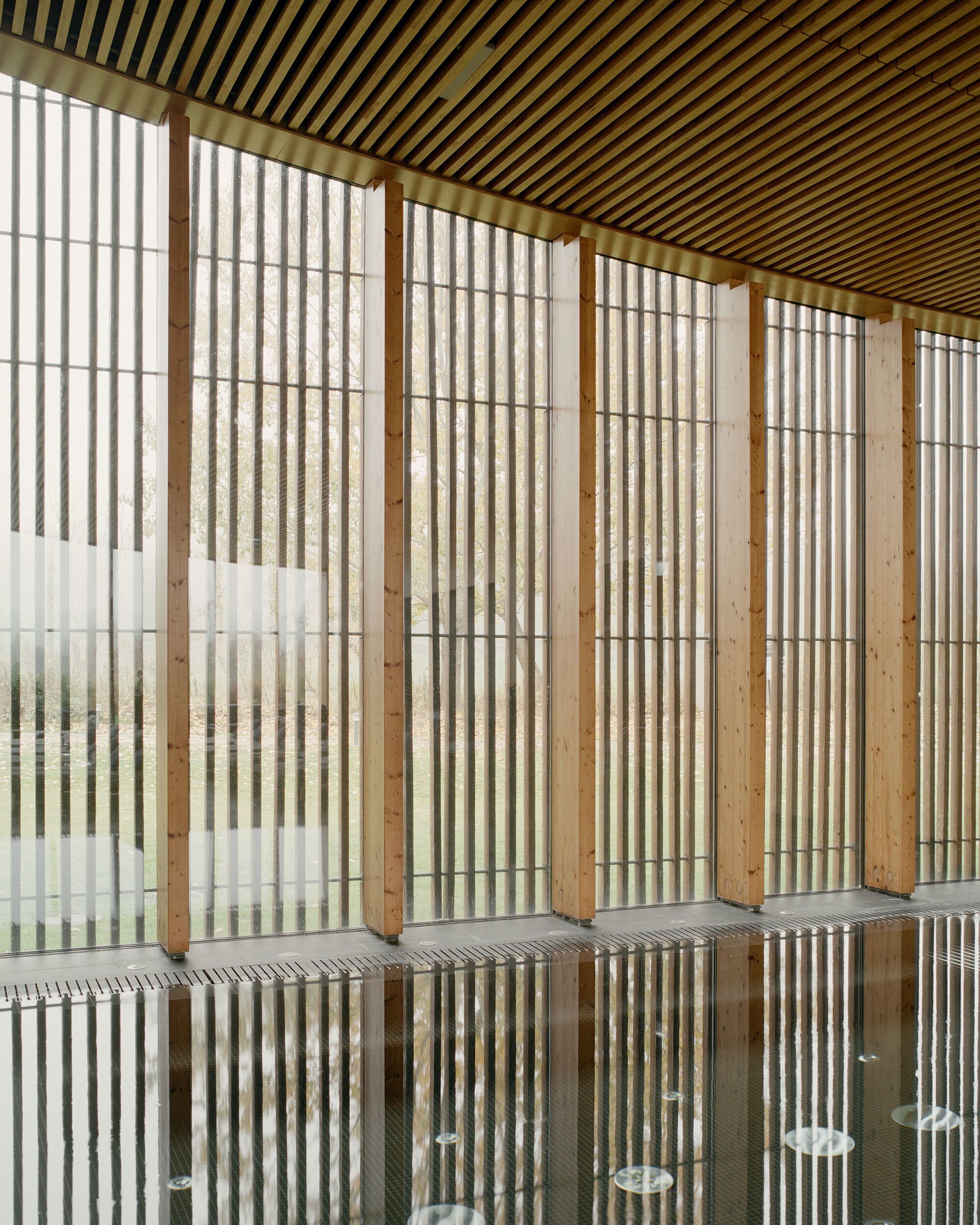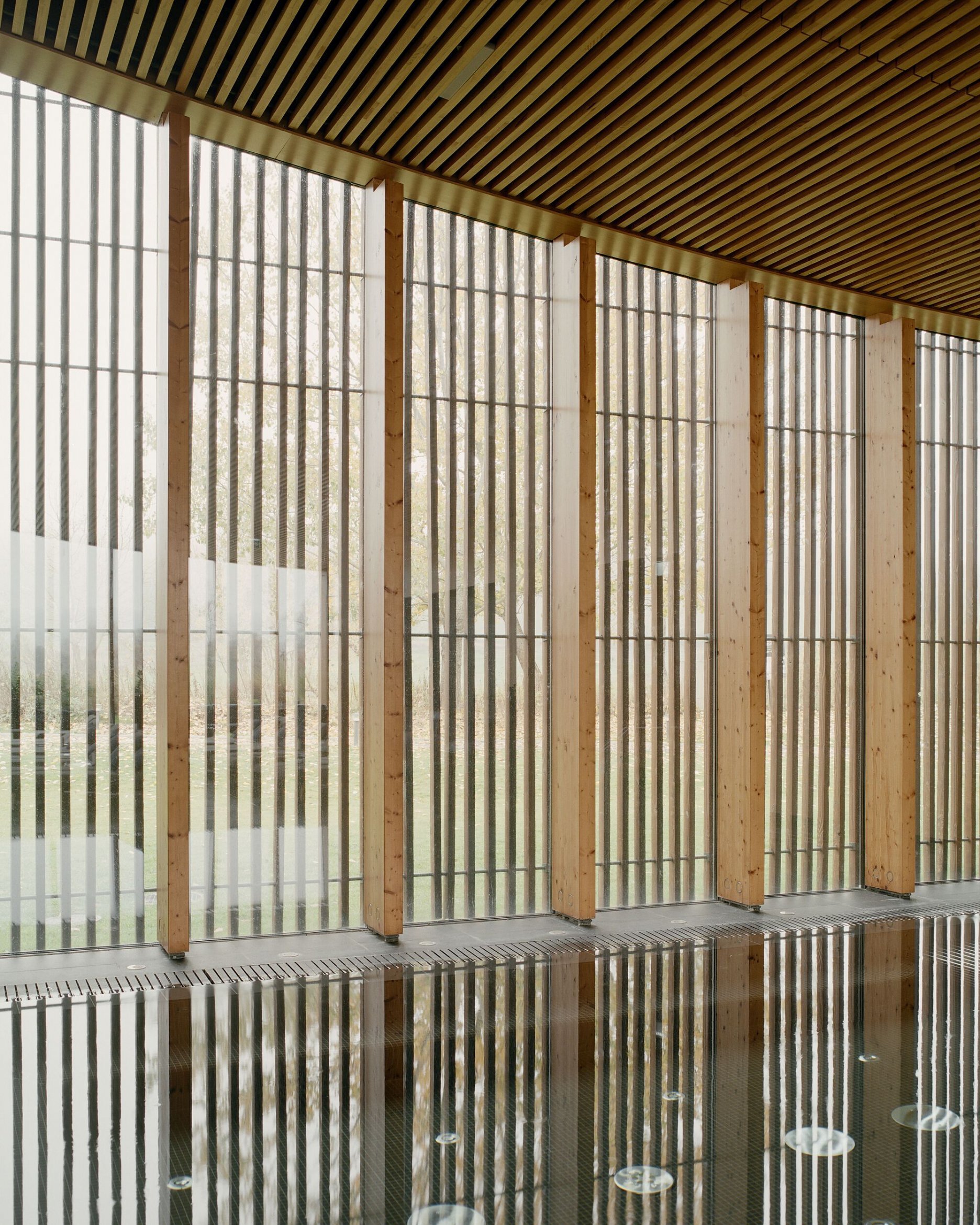Primárny konštrukčný systém pavilónu tvoria lepené drevené väzníky. Prehnutie základných prvkov rámu podľa slov architektov odzrkadľuje jemné zvlnenie okolitej krajiny. Pohľady zo strany exteriéru okrem rozsiahlych presklených plôch charakterizuje tmavá fasáda z opaľovaného dreva. Jemný predsadený raster vertikálnych lamiel zároveň vytvára vo vybraných častiach pohľadovú bariéru. Zvolenému riešeniu sekunduje prirodzená farebnosť a kresba dreva v interiéri.