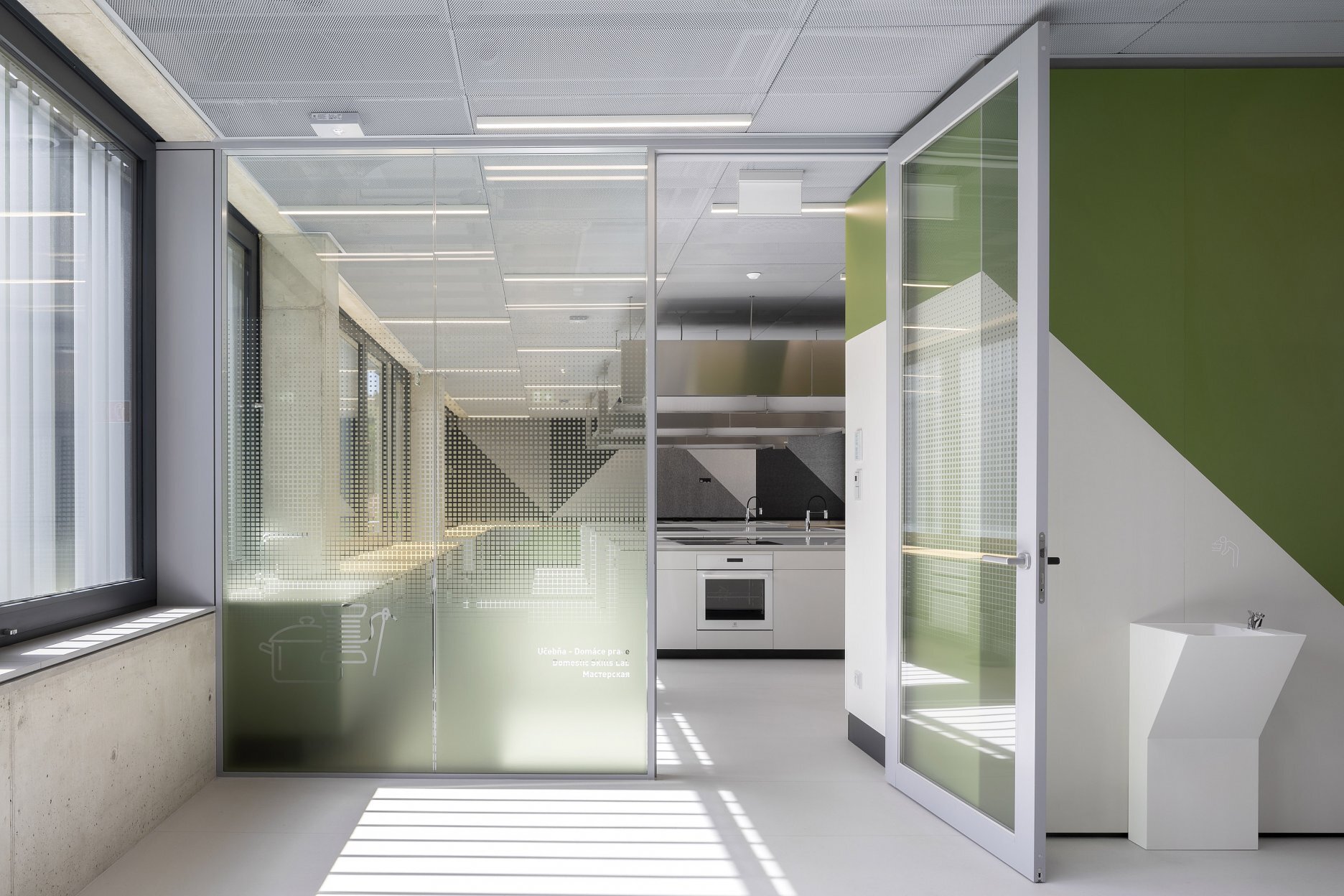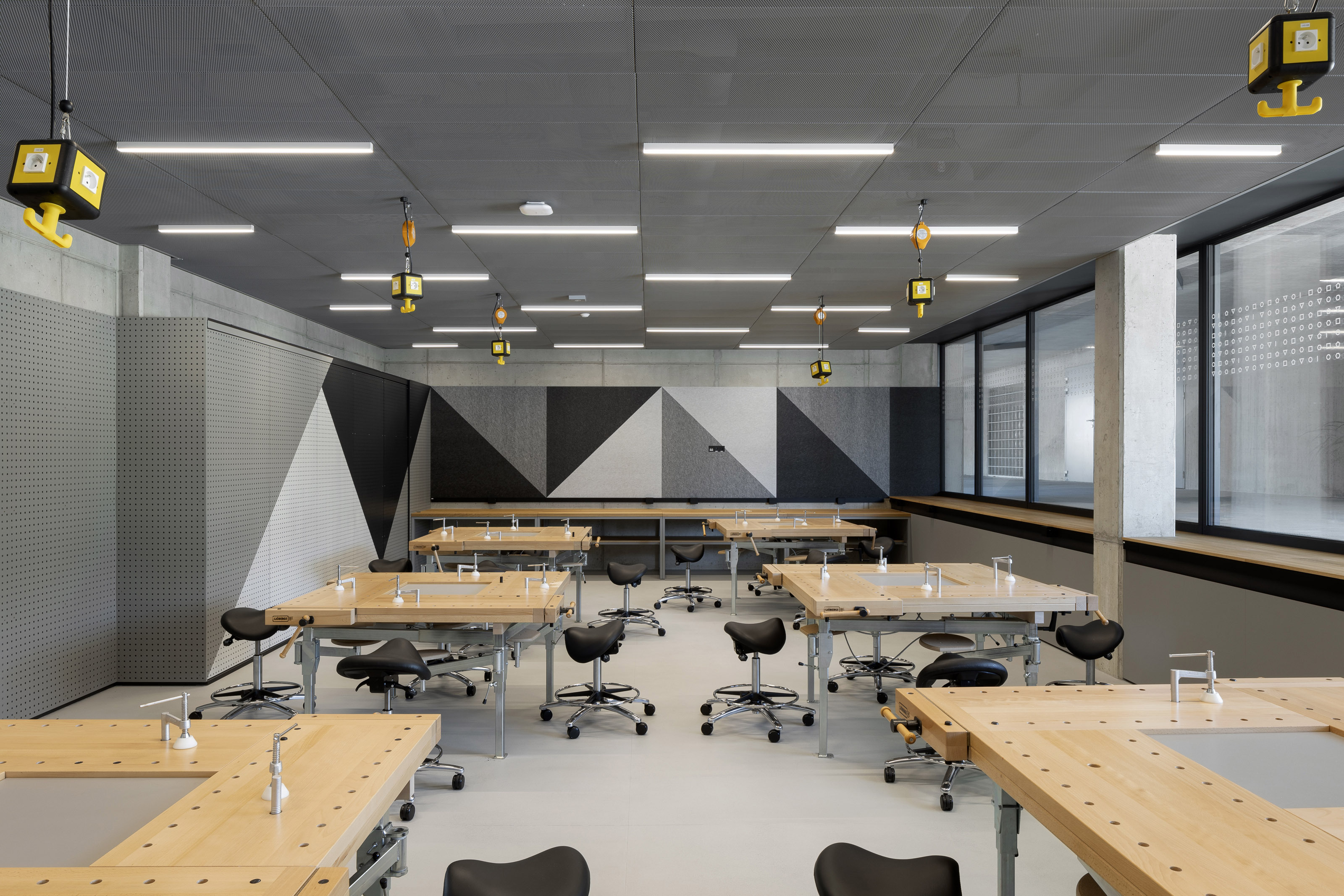 Vnútorné rozvrhnutie rešpektuje funkciu opakovaných podlaží s učebňami, výnimkou je vzťah interiéru a exteriéru na úrovniach podzemného podlažia a prízemia. Výškové usporiadanie vo vzťahu k terénu umožnilo vytvorenie mezanínu s malou galériou. Dispozícia prízemia pracuje s konceptom vložených modulárnych priestorov, ktoré umožňujú otvorenie priestoru. Druhé aj tretie nadzemné podlažie využíva štandardnú dispozičnú osnovu – vnútorné schodisko sprístupňuje univerzálnu učebňu / učebňu odborného výcviku pre 24 žiakov, nevyhnutné zázemie a na najvyššej úrovni aj kabinet pre učiteľov. Všetky miestnosti sú presvetlené priamo prostredníctvom otváravých okien s parapetom. Za spomenutie stojí zariadenie interiéru s autorským nábytkom šitým na mieru jednotlicých priestorov, vrátane vybavenia učební odborného výcviku s výškovo nastaviteľnými stolmi.