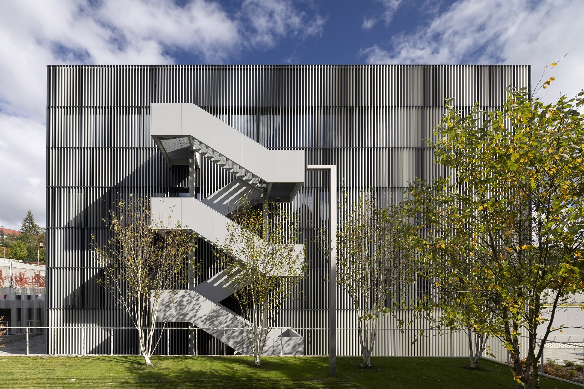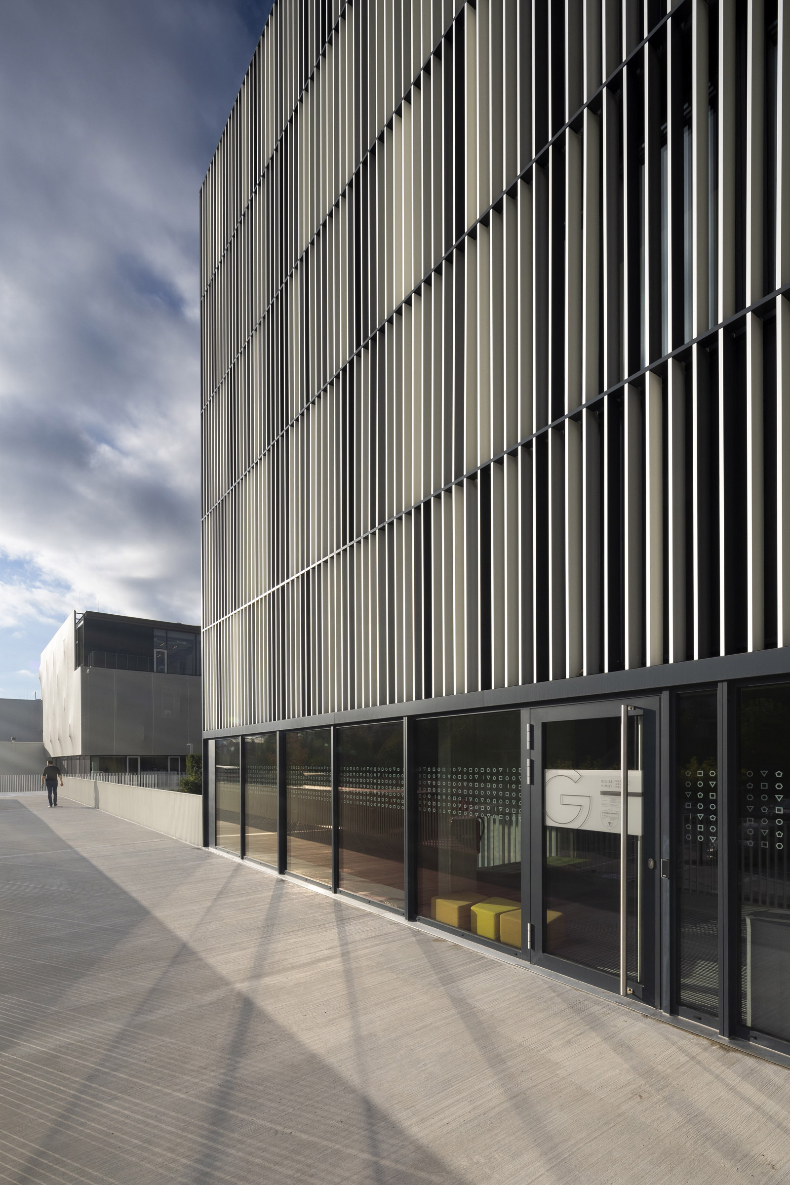 Priestoru riešenému v druhej etape projektu dominuje objekt s doplnkovými učebňami, pre ktorý sú ostatné stavby podlubím a terénnou modeláciou. Ťažiskovú východnú fasádu architekti členia na transparentnú dvojúrovňovú podnož a kompaktnú hmotu vyšších podlaží, zjednotenú rastrom predsadeného tienenia. Presklená fasáda na nižších podlažiach komunikuje s okolím prostredníctvom prehľadov do dispozície. Predsadená štruktúra lineárnych slnolamov s rôznofarebnými hranami na zvyšku obvodového plášťa reflektuje požiadavky na ochranu učební pred nadmerným preslnením a zároveň vytvára pútavé moiré. Západná fasáda využíva obdobný princíp, pričom jednoliatu plochu prerušuje geometrická hmota únikového schodiska. Štítové fasády sú zámerne komponované ako ploché dosky vytvárajúce dojem kože a jadra. Vyznenie autorského zámeru podčiarkujú precízne technické detaily medzi ktoré patrí napríklad subtílne oplechovanie na úrovni strešnej roviny