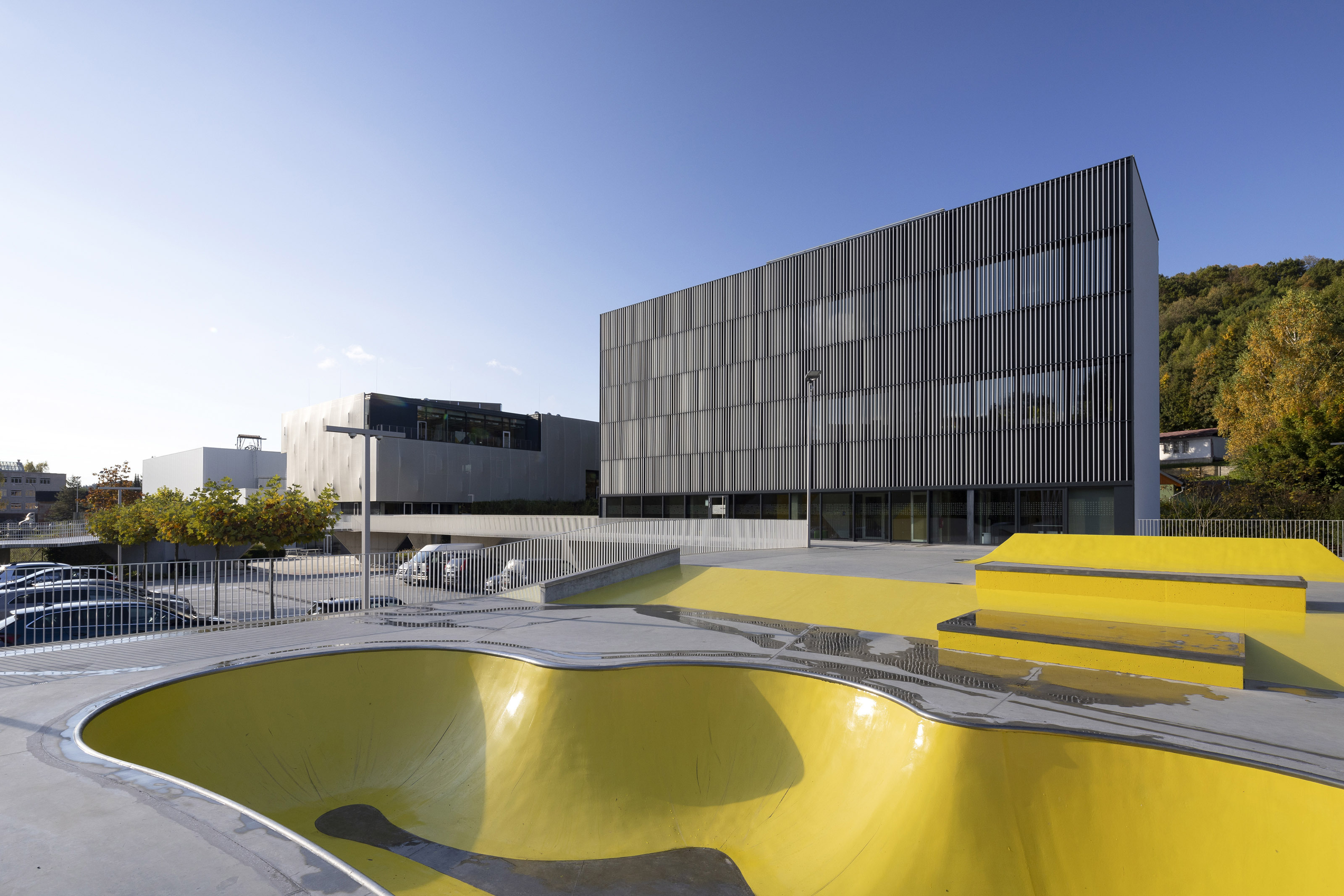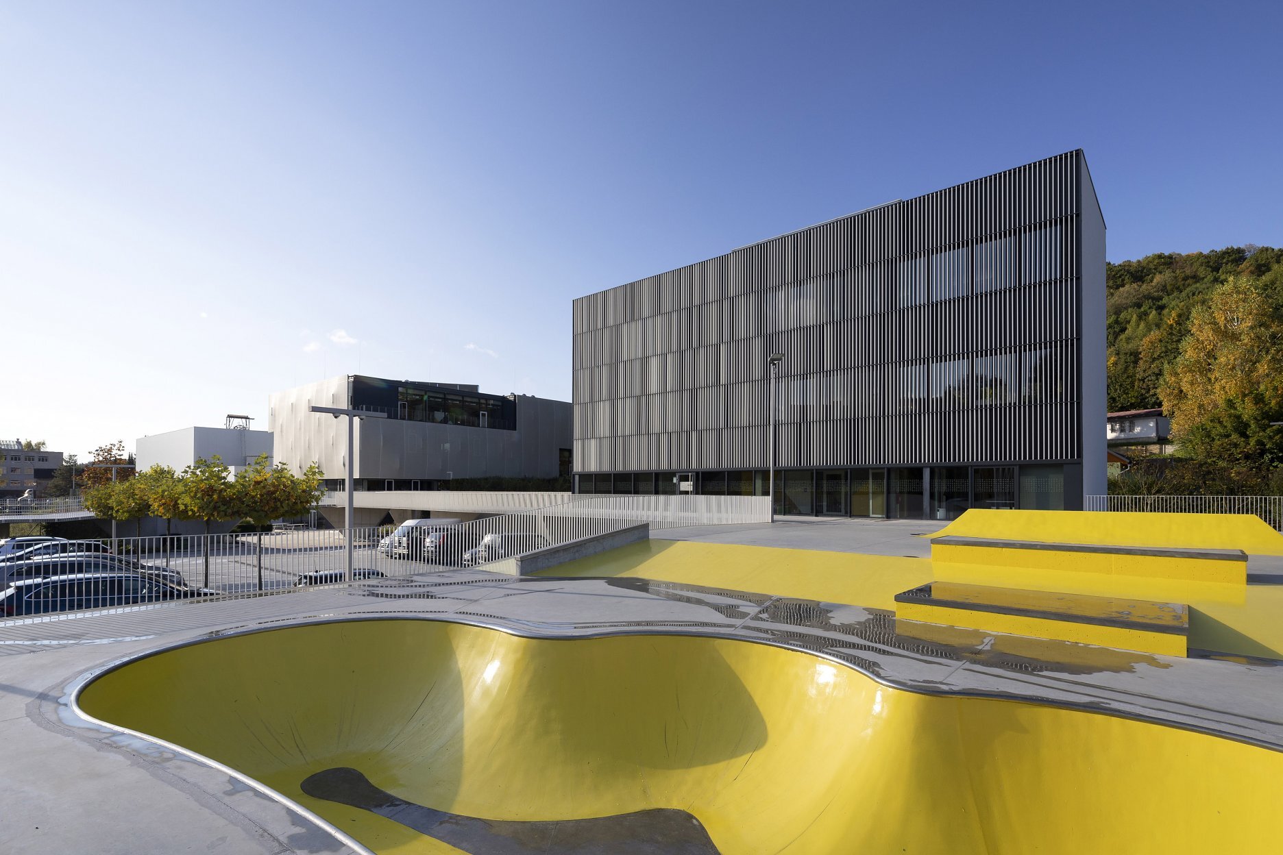 Dôležitú súčasť exteriéru tvorí nový skatepark. Z konštrukčného hľadiska je rozdelený na dve časti – plazu, umiestnenú na streche skladového objektu, a bowl, využívajúci terénnu depresiu medzi objektom a obvodovým múrom. Precízne povrchy z monolitického hladeného betónu na povrchu prekážok zvýrazňuje žltý náter a spevňujú oceľové hrany. Na lichobežníkovej ploche s výmerou 430 m² nájdu jazdci kicker gap, china bank, grindbox, manualbox, bank, stairs, rail, c-box a bowl.