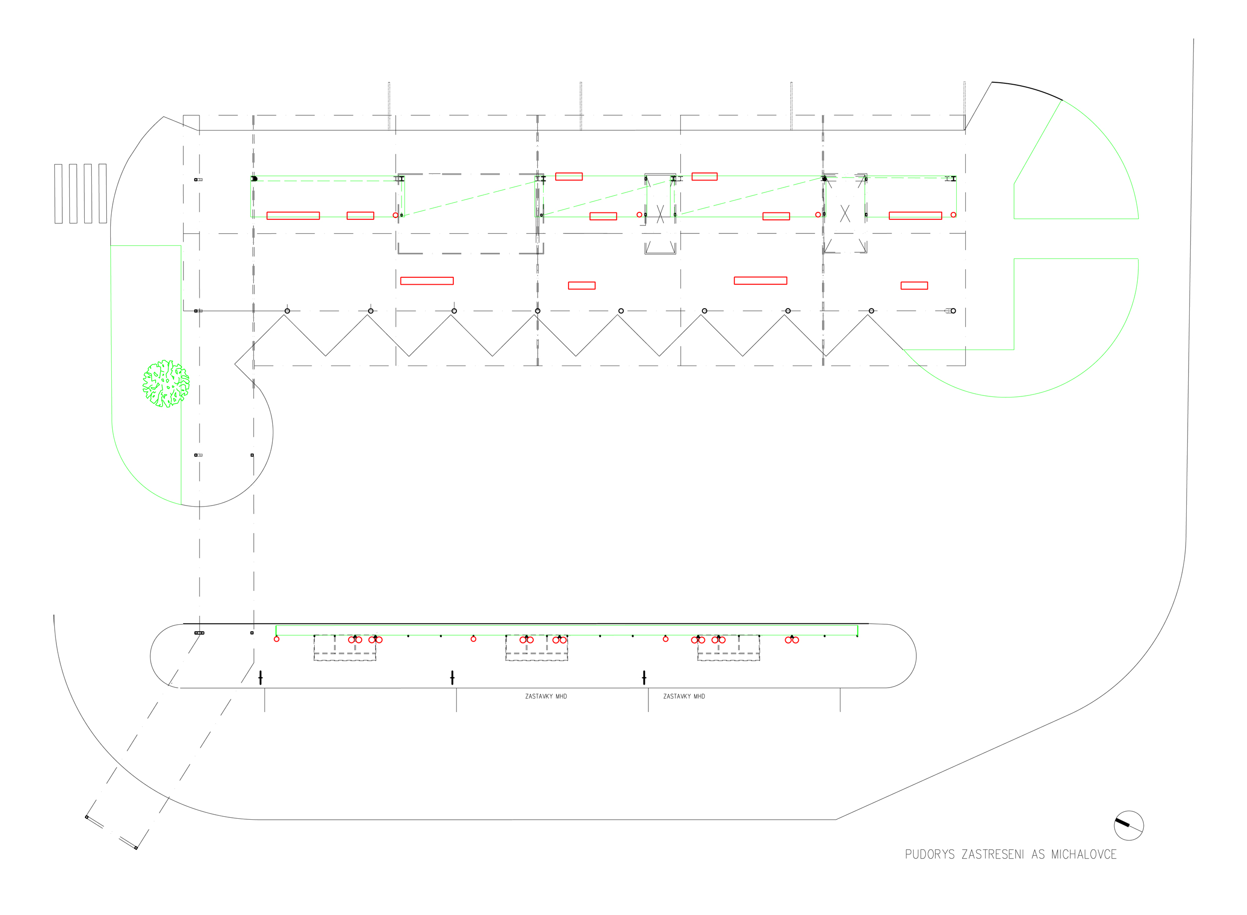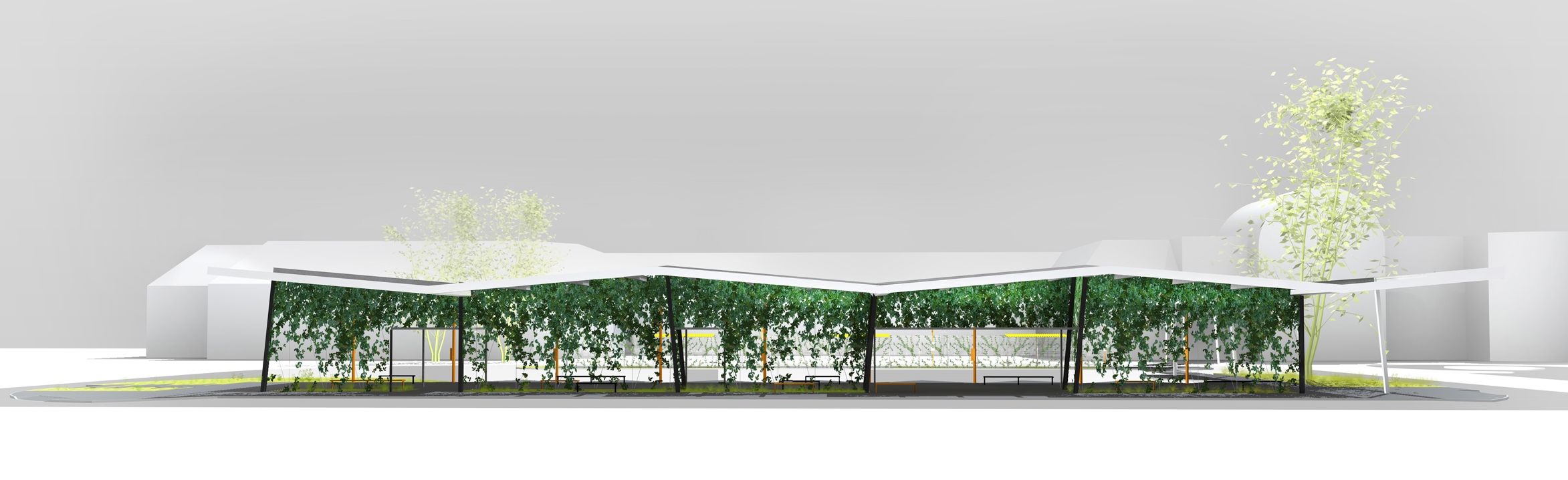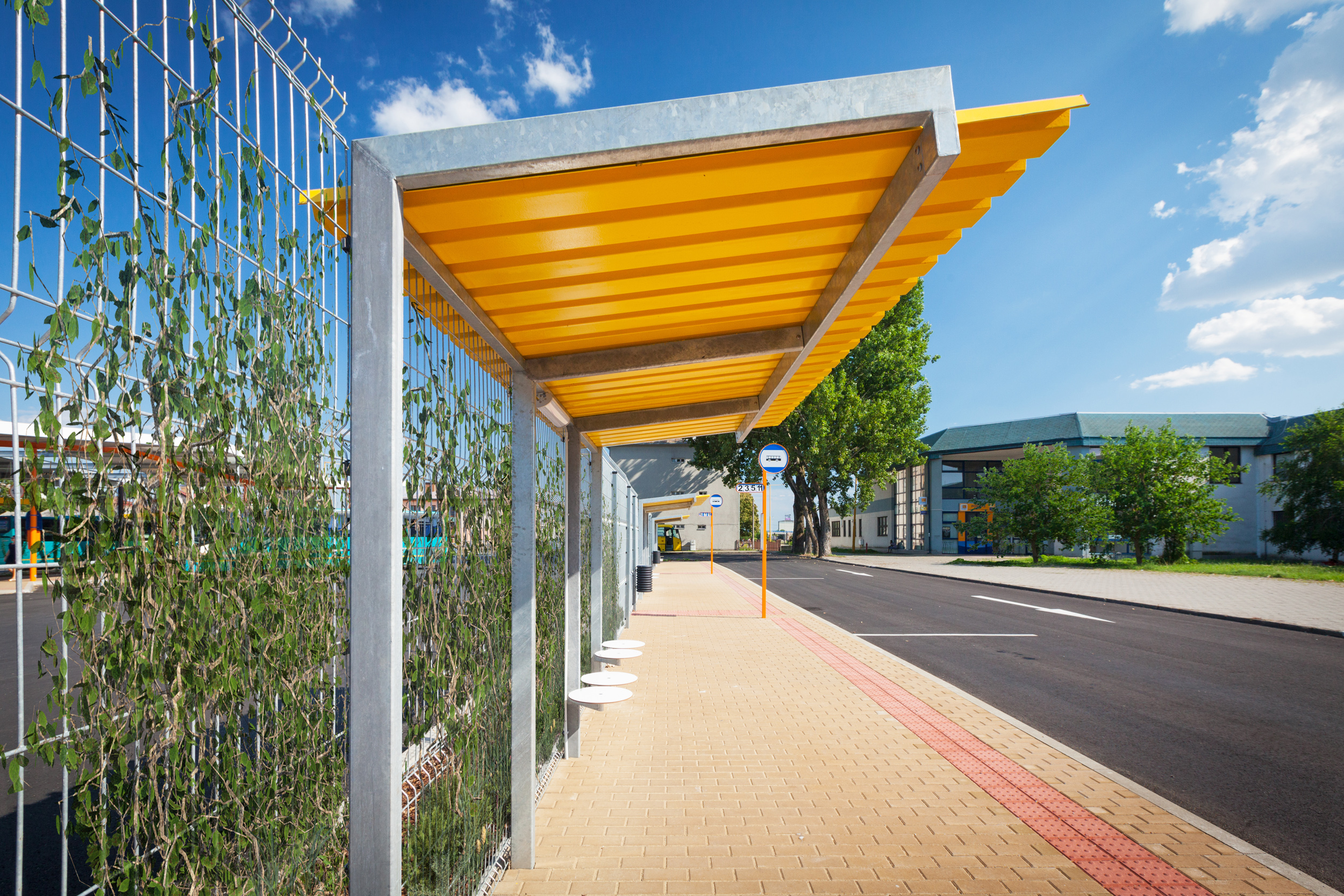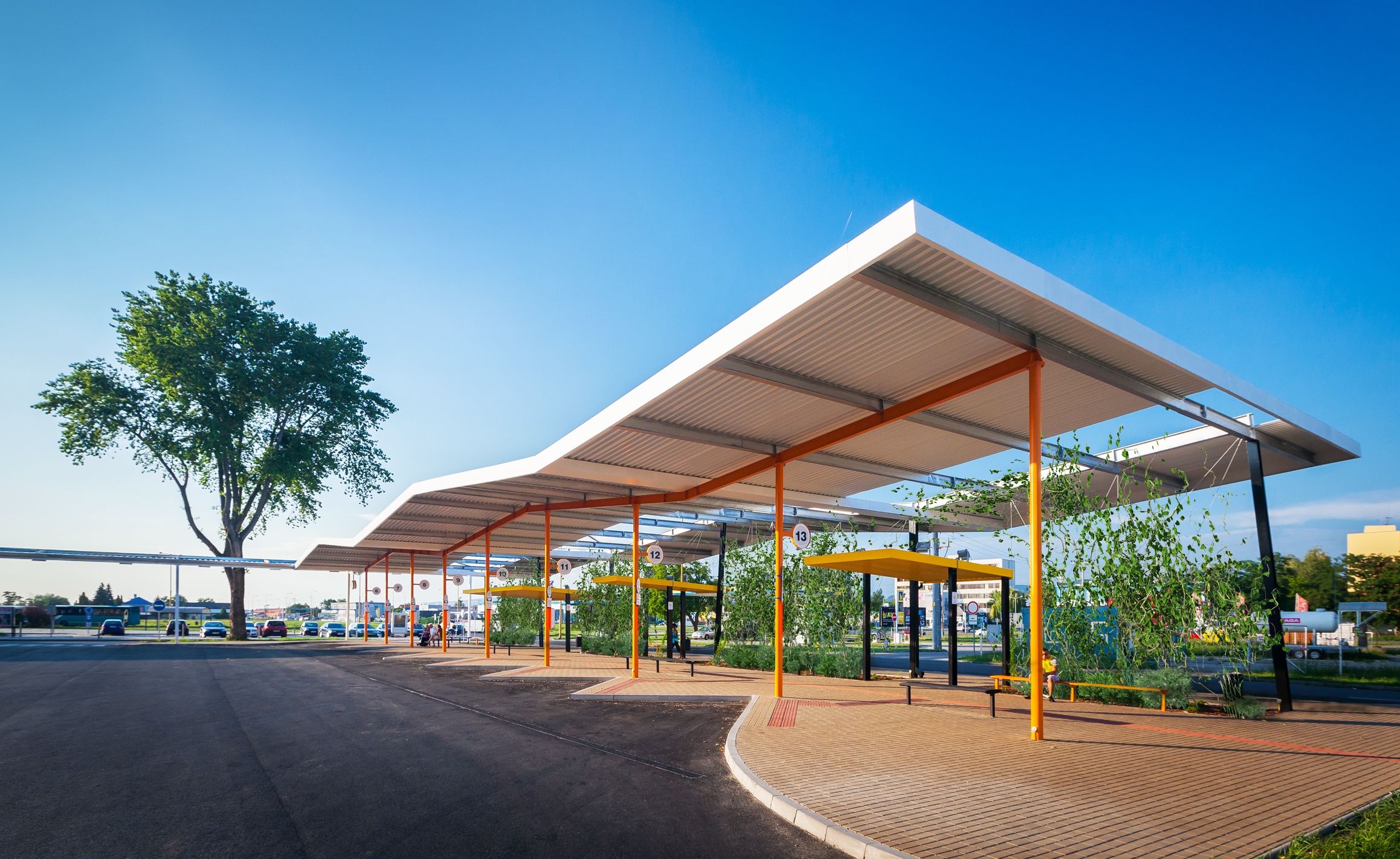 Jedním z nejvýraznějších prvků se stala popínavá zeleň, která předěluje výstupní a nástupní část nádraží pro dálkovou dopravu. Zelený pás je přerušen průchody, které mají nižší výškovou úroveň zastřešení a vytváří tak intimní prostor pro cestující. Další zelená stěna odděluje drobné objekty zastávek MHD od autobusových stání. Dvojí zelený plán zpříjemňuje prostor pro cestující a zároveň funguje jako clona filtrující zplodiny od odjíždějících autobusů. Základní nosná konstrukce zůstala ponechána v žárovém zinku, jednolitost konstrukce jsme doplnili barvami v kombinaci žlutá, oranžová, černá a bílá.