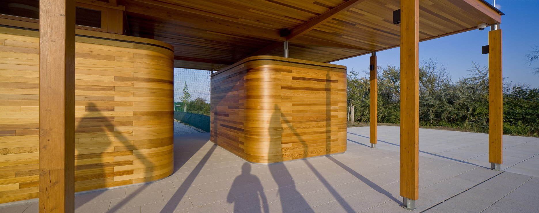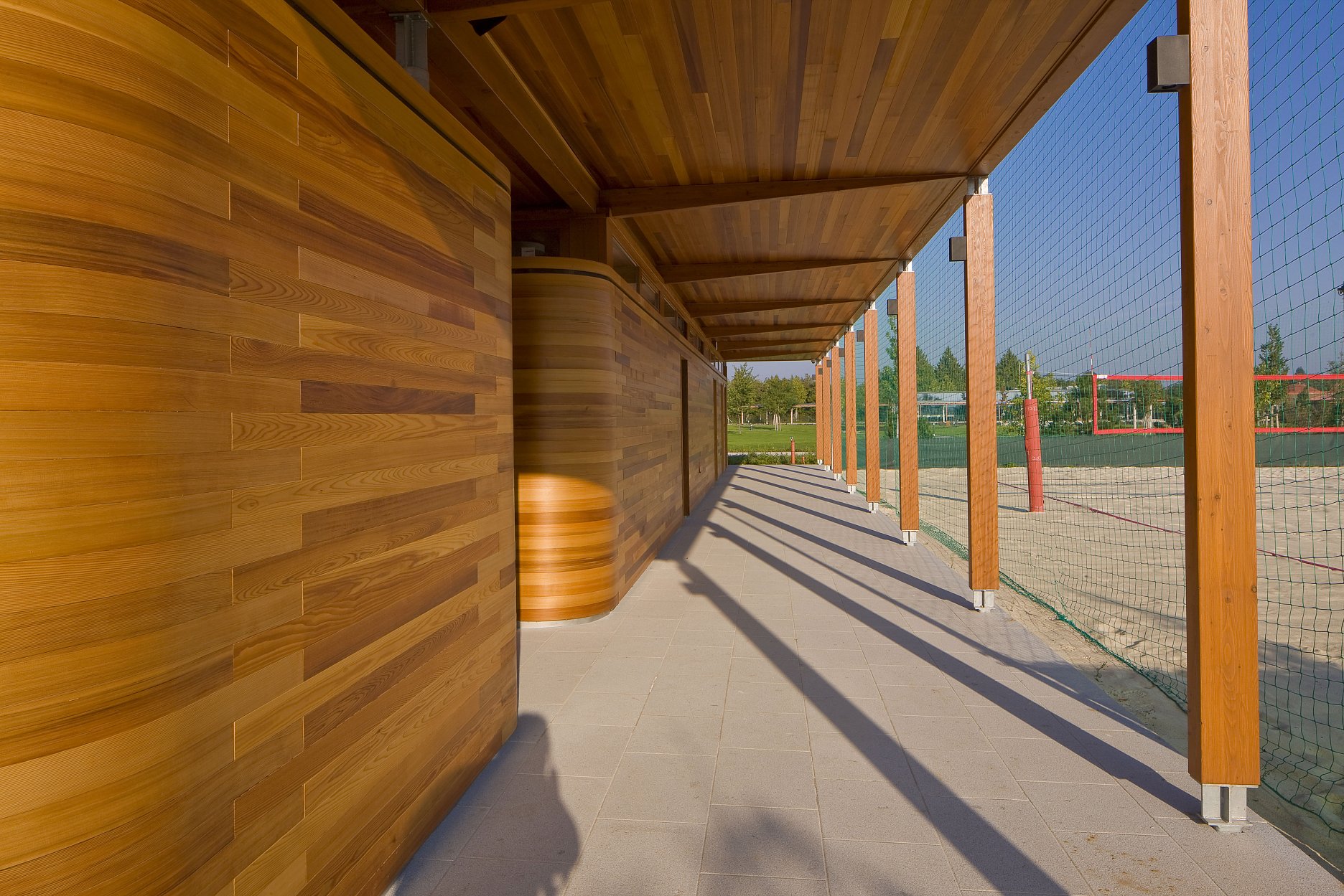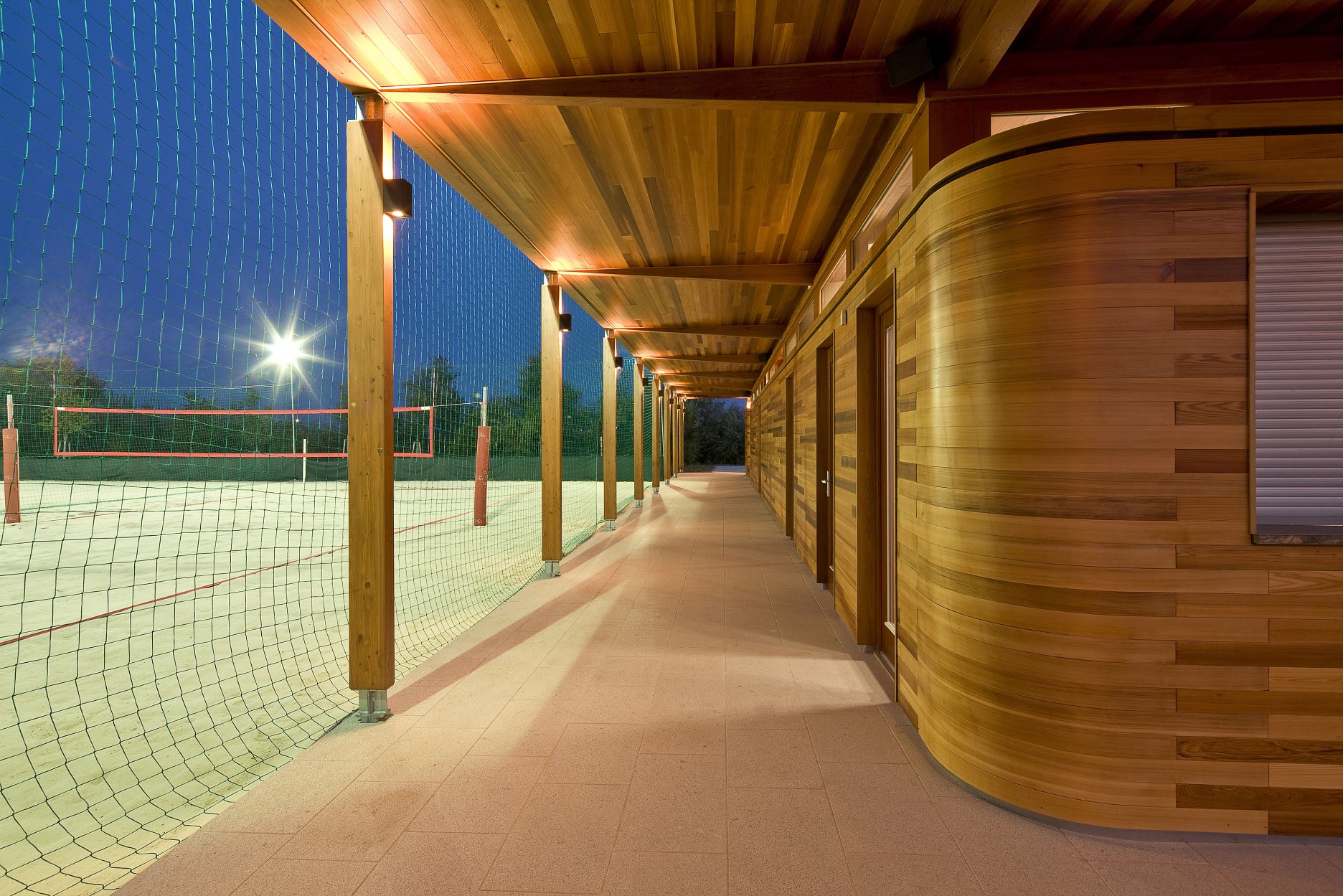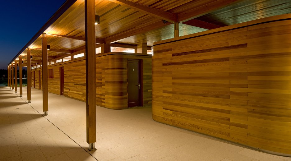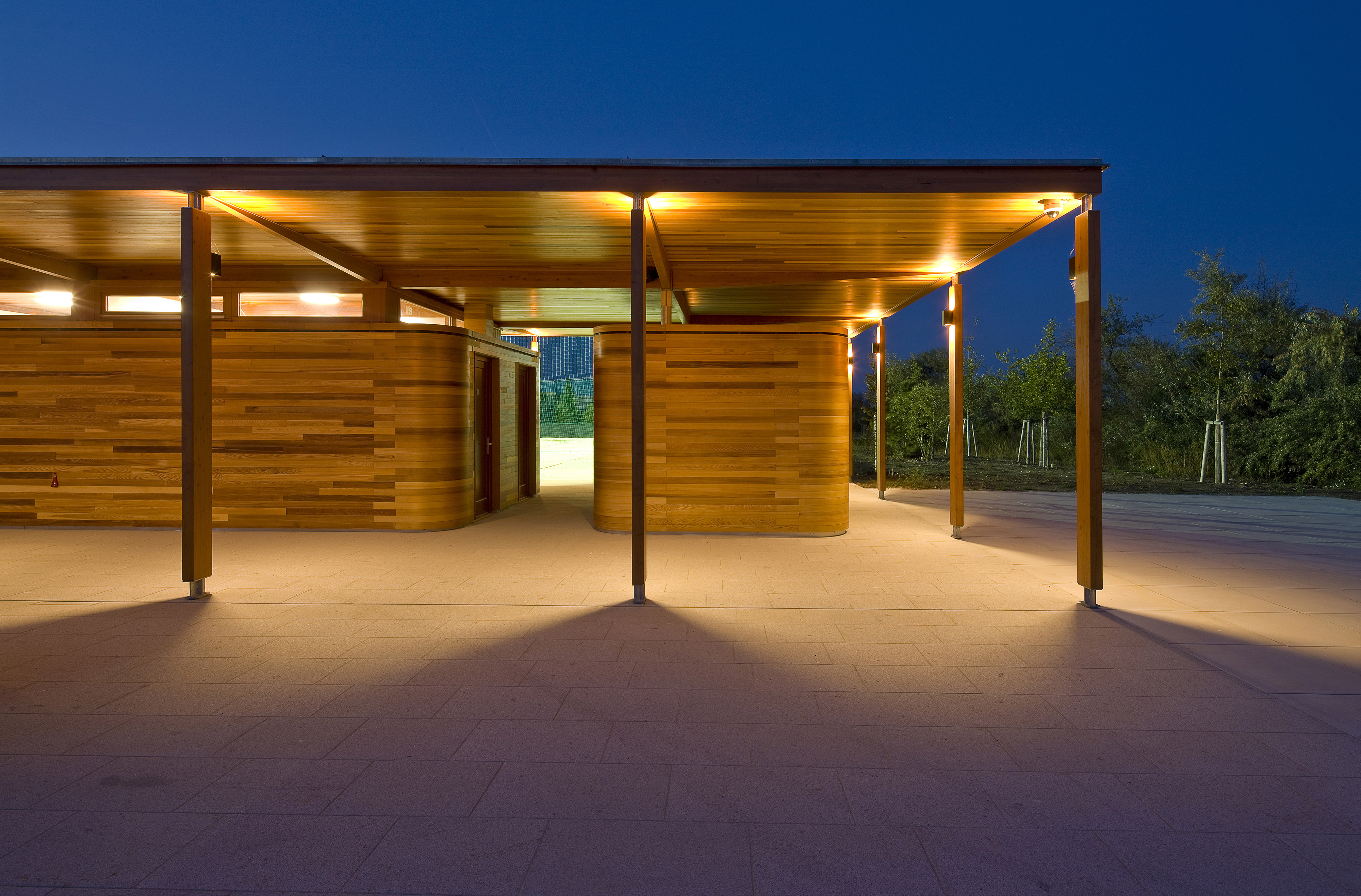 Autori ustúpili od pôvodného návrhu, ktorý počítal s dvoma samostatnými stavbami, a dali prednosť jednému pavilónu s krytými komunikáciami orientovanými na obe strany areálu. Jemný odkaz na prvotný zámer predsa len zostal. Pavilón je totiž tvorený dvoma oddelenými hmotami - šatňami pre športovcov a zázemím (bufet a sklad). Zázemie je obložené doskami z kanadského cédra. Od plochého krovu je hmota vizuálne oddelená štrbinami pásových okien. Nárožia oboch častí sú zaoblené. Cédrový obklad tesári ohýbali do požadovaných oblúkov dopredu v dielňach.