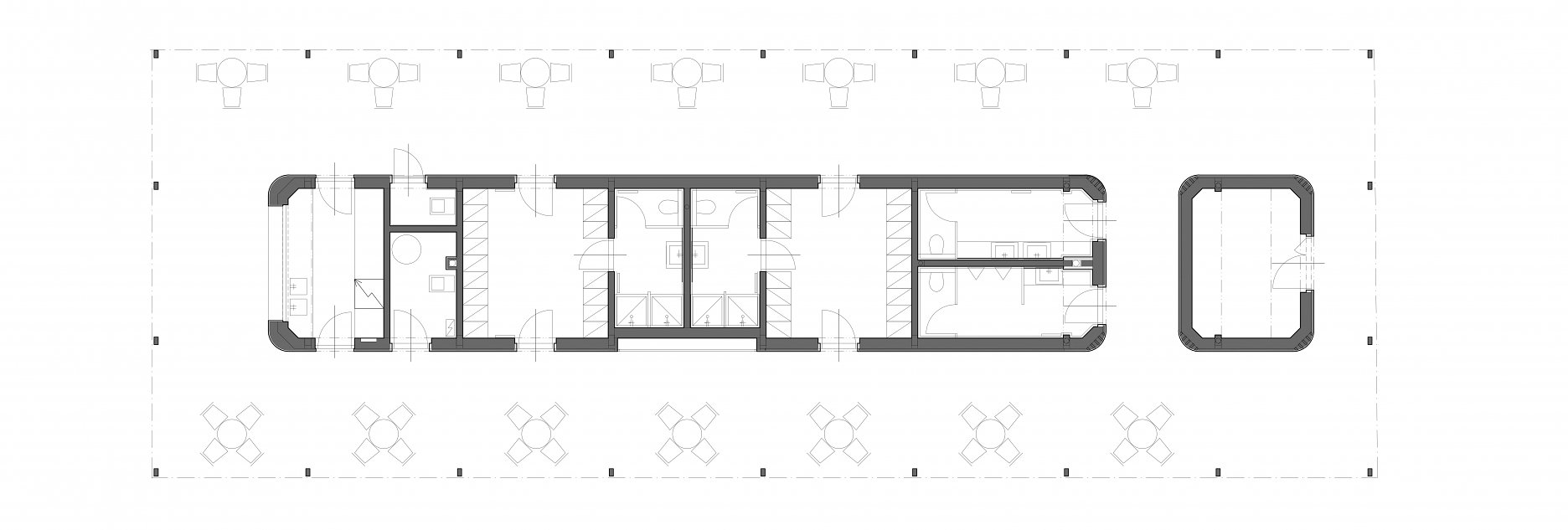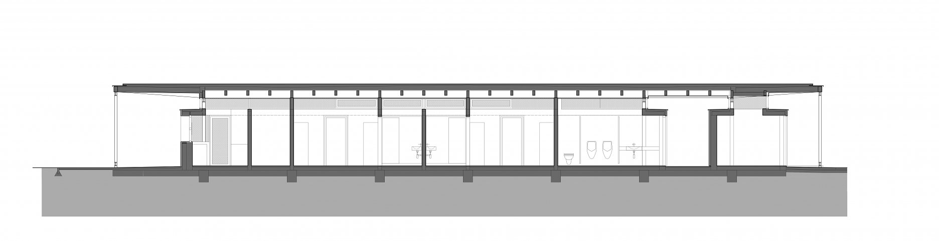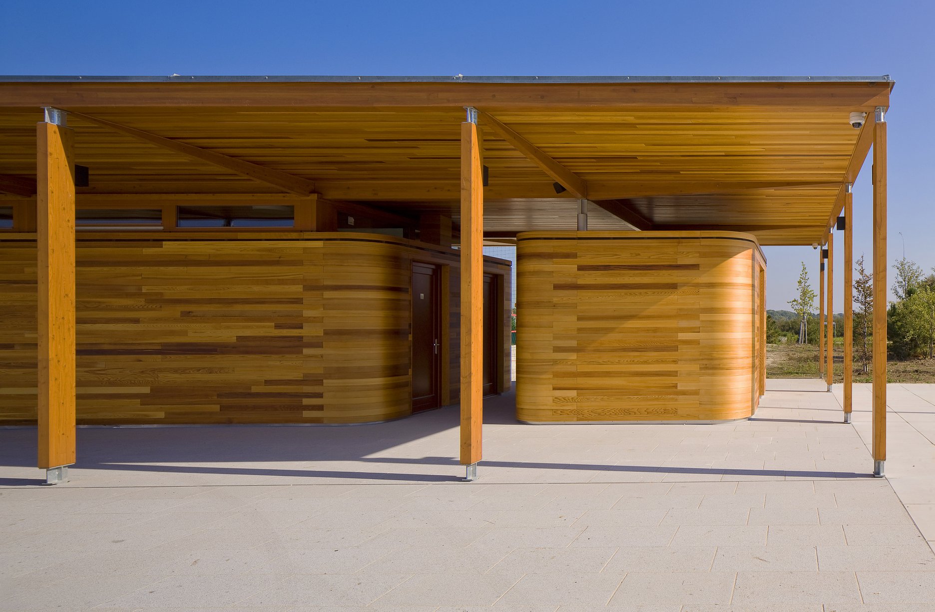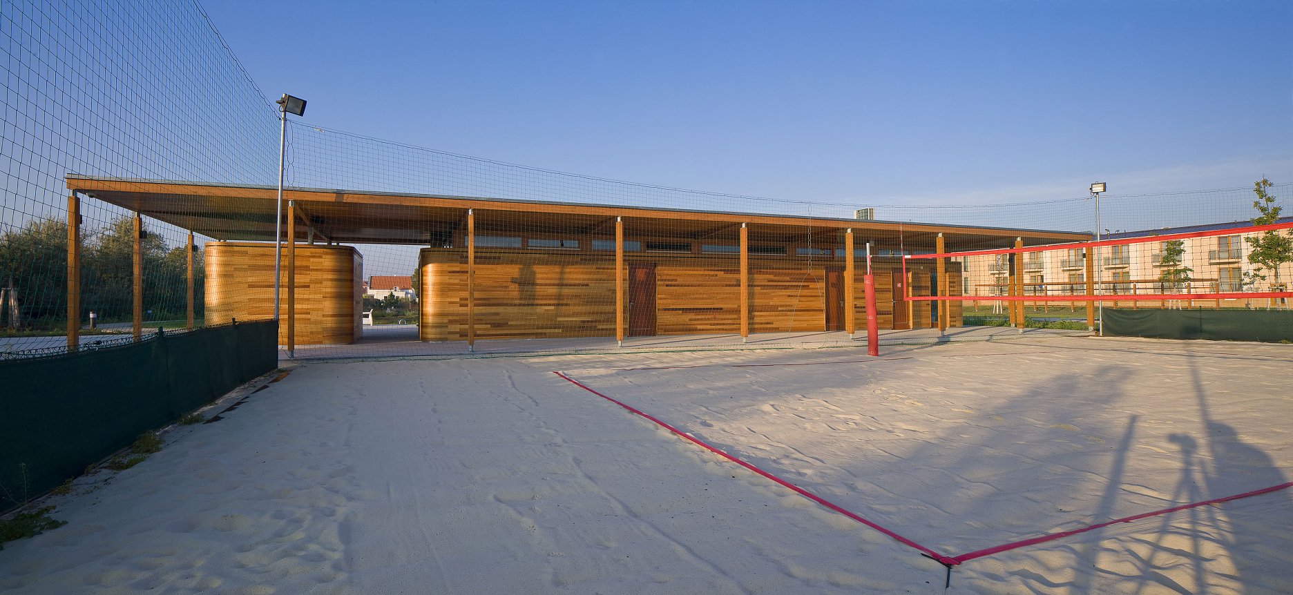 Autori ustúpili od pôvodného návrhu, ktorý počítal s dvoma samostatnými stavbami, a dali prednosť jednému pavilónu s krytými komunikáciami orientovanými na obe strany areálu. Jemný odkaz na prvotný zámer predsa len zostal. Pavilón je totiž tvorený dvoma oddelenými hmotami - šatňami pre športovcov a zázemím (bufet a sklad). Zázemie je obložené doskami z kanadského cédra. Od plochého krovu je hmota vizuálne oddelená štrbinami pásových okien. Nárožia oboch častí sú zaoblené. Cédrový obklad tesári ohýbali do požadovaných oblúkov dopredu v dielňach.