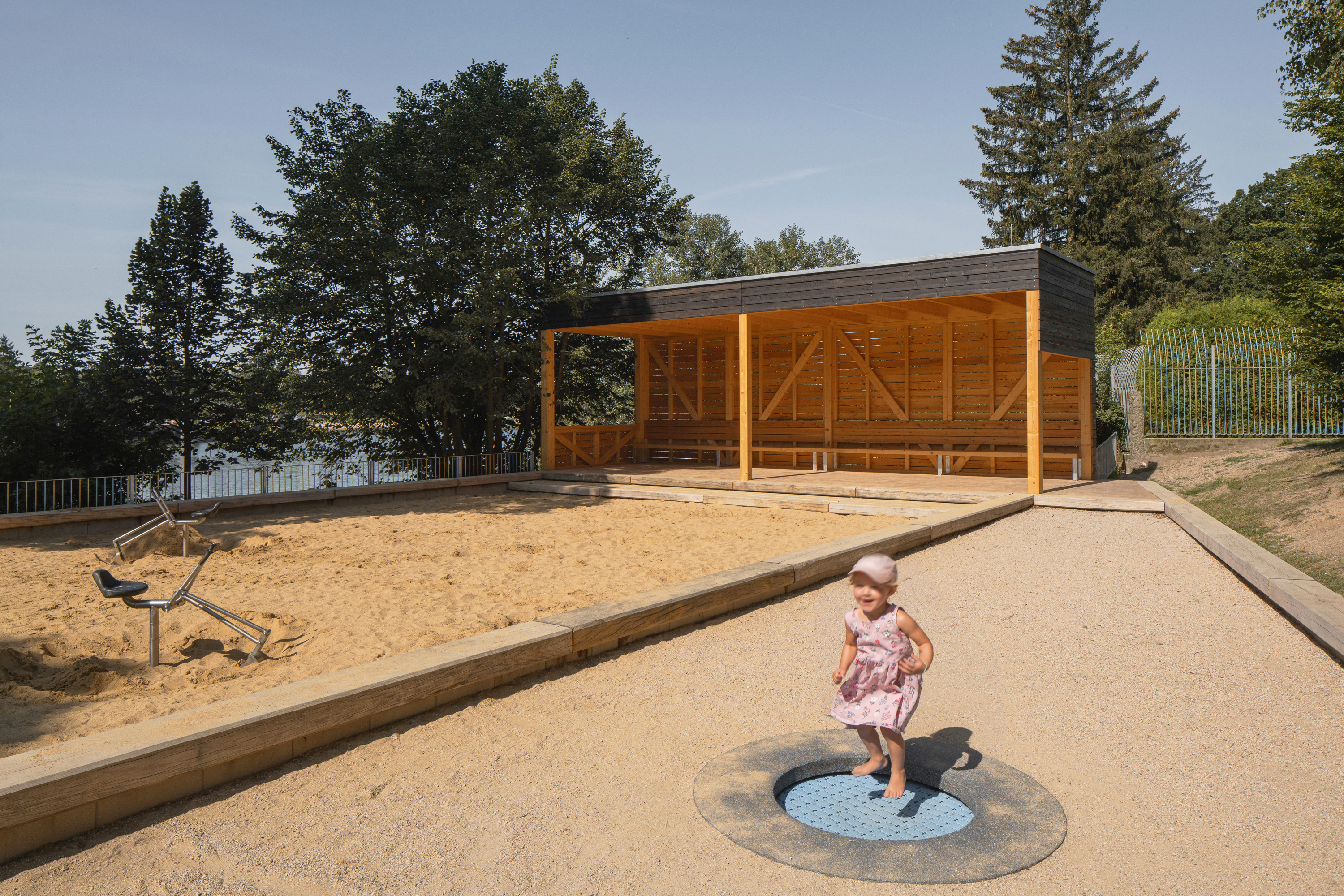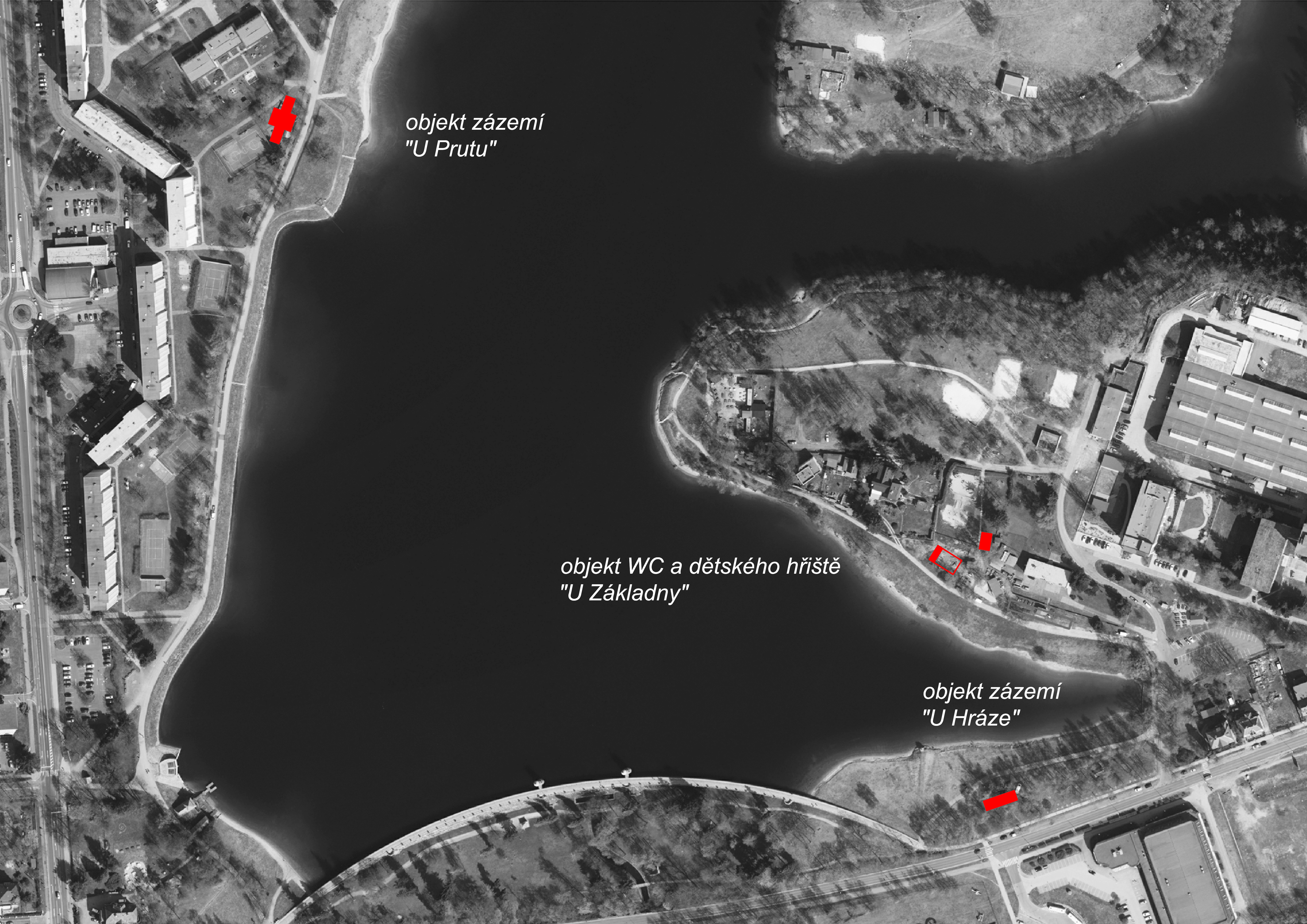 Na opačnom brehu sa nachádza lokalita "U Základny". Cieľom úprav bolo nahradiť dosluhujúce verejné WC a opraviť detské ihrisko. Herná plocha je nanovo vymedzená a ukončené altánkom, ktorý poskytuje tieň a obohacuje pieskovú plochu o ďalší priestor. Celá lokalita je prirodzene sklonená smerom k vodnej hladine. Tam, kde bolo potrebné spevniť okraj alebo vytvoriť oporný múr, boli použité dubové pražce. Z pražcov je vytvorený aj lem okolo detského ihriska. Altánok aj objekt WC vychádzajú z rovnakej logiky ako ostatné drevostavby. Vzájomným natočením výškovým posunom nanovo definujú riešené územie.