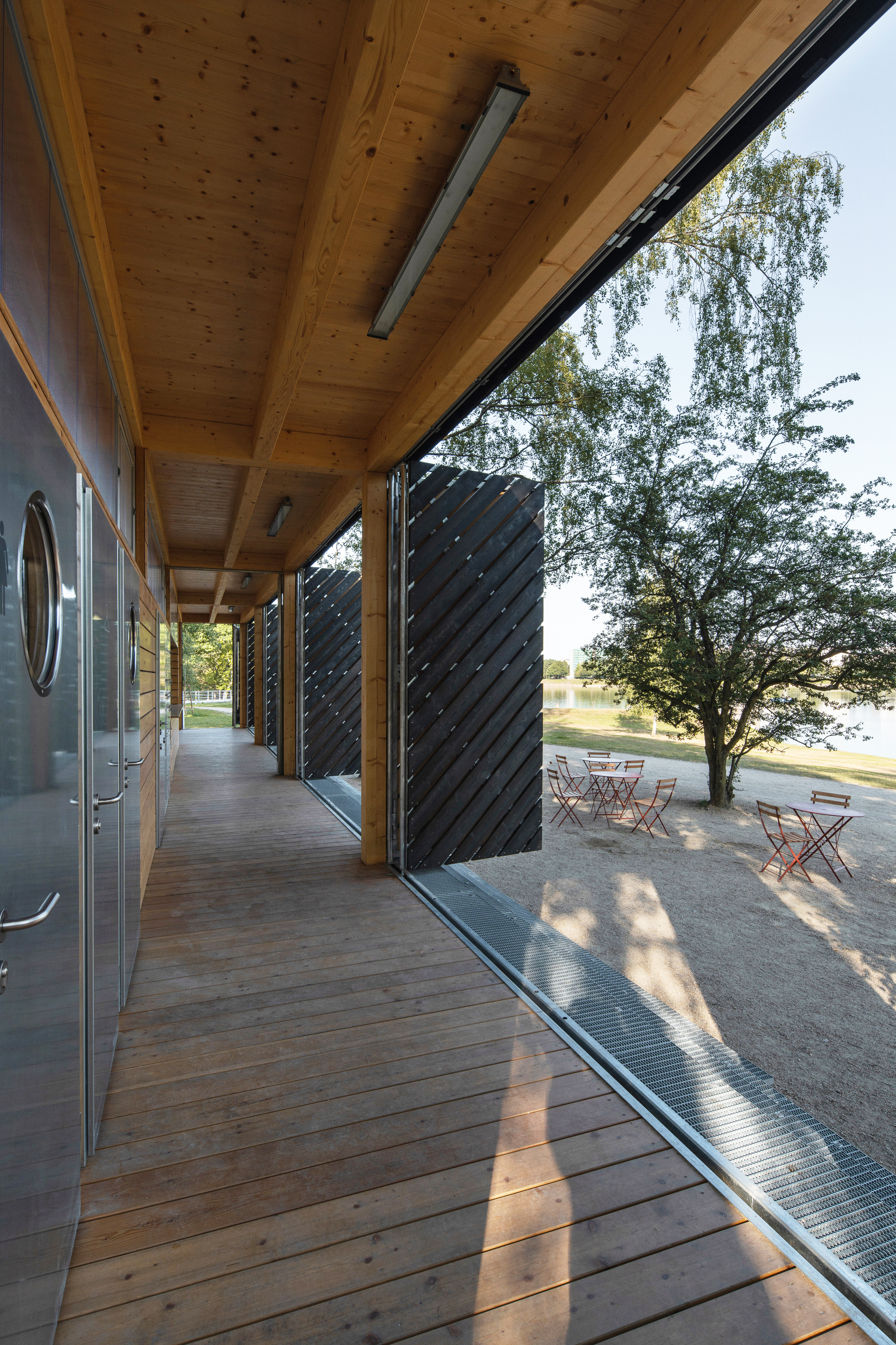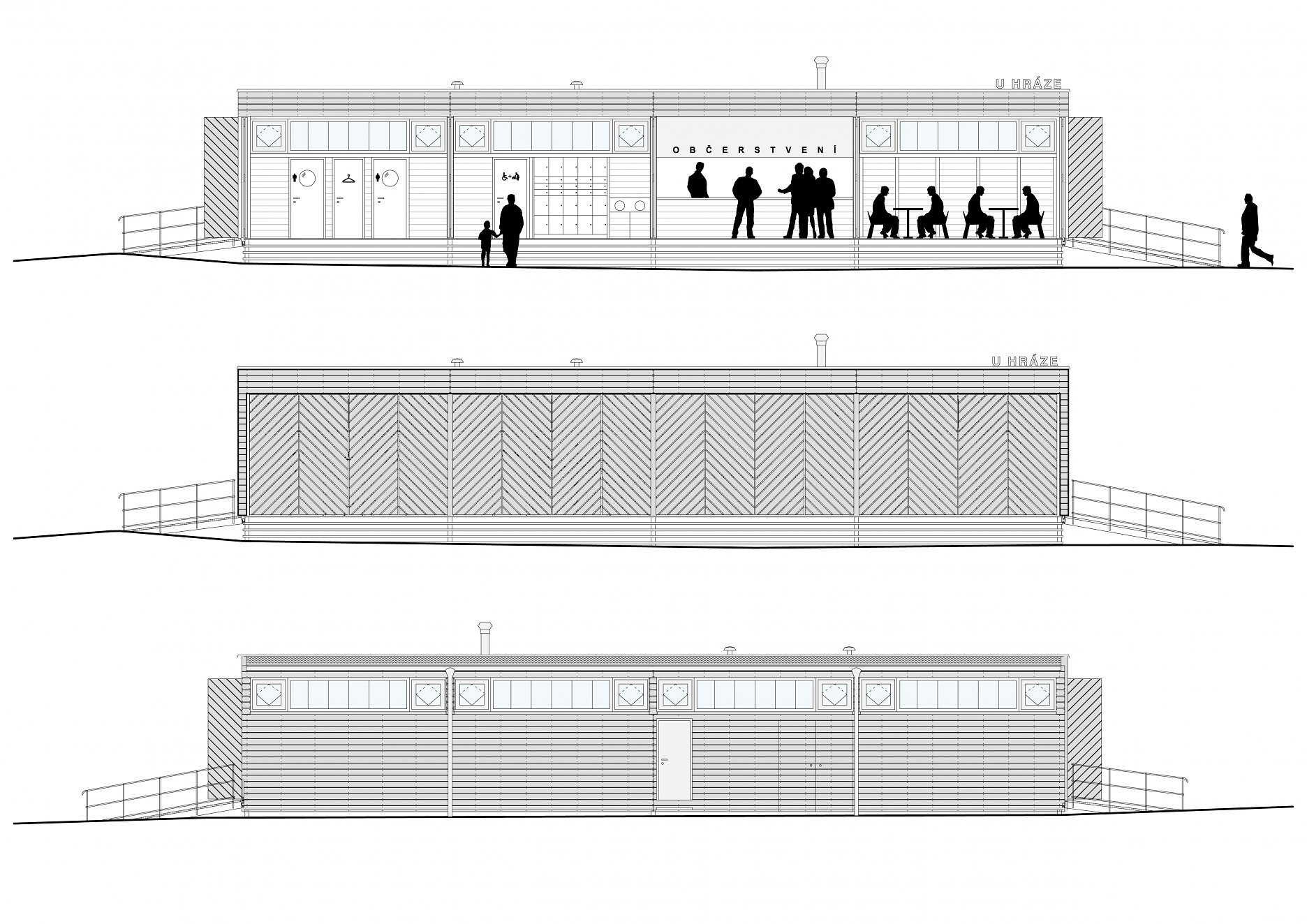 Revitalizácia lokality "U Hráze" nahradila a funkčne prepojila pôvodne samostatné bloky kiosku a verejného WC. Kiosk voľne “pláva” na novej mlatovej ploche. Otvára sa do viacerých smerov a bohatej zelene, ktorá v lete zabezpečuje tak žiadaný tieň. Polovicu zo štyroch modulov tvorí blok so zázemím a krytým sedením, druhú polovicu verejné WC. Objekt je možné úplne uzavrieť prostredníctvom skladacích dverí na vonkajšom obvode ochodze. Krytá pavlač spája lokalitný program do jedného celku a tvorí charakteristický znak všetkých navrhovaných objektov v okolí priehrady. Súčasťou riešenia je aj neďaleké workoutové ihrisko medzi stromami (na mieste pôvodných WC) a piknikové miesto s grilom.