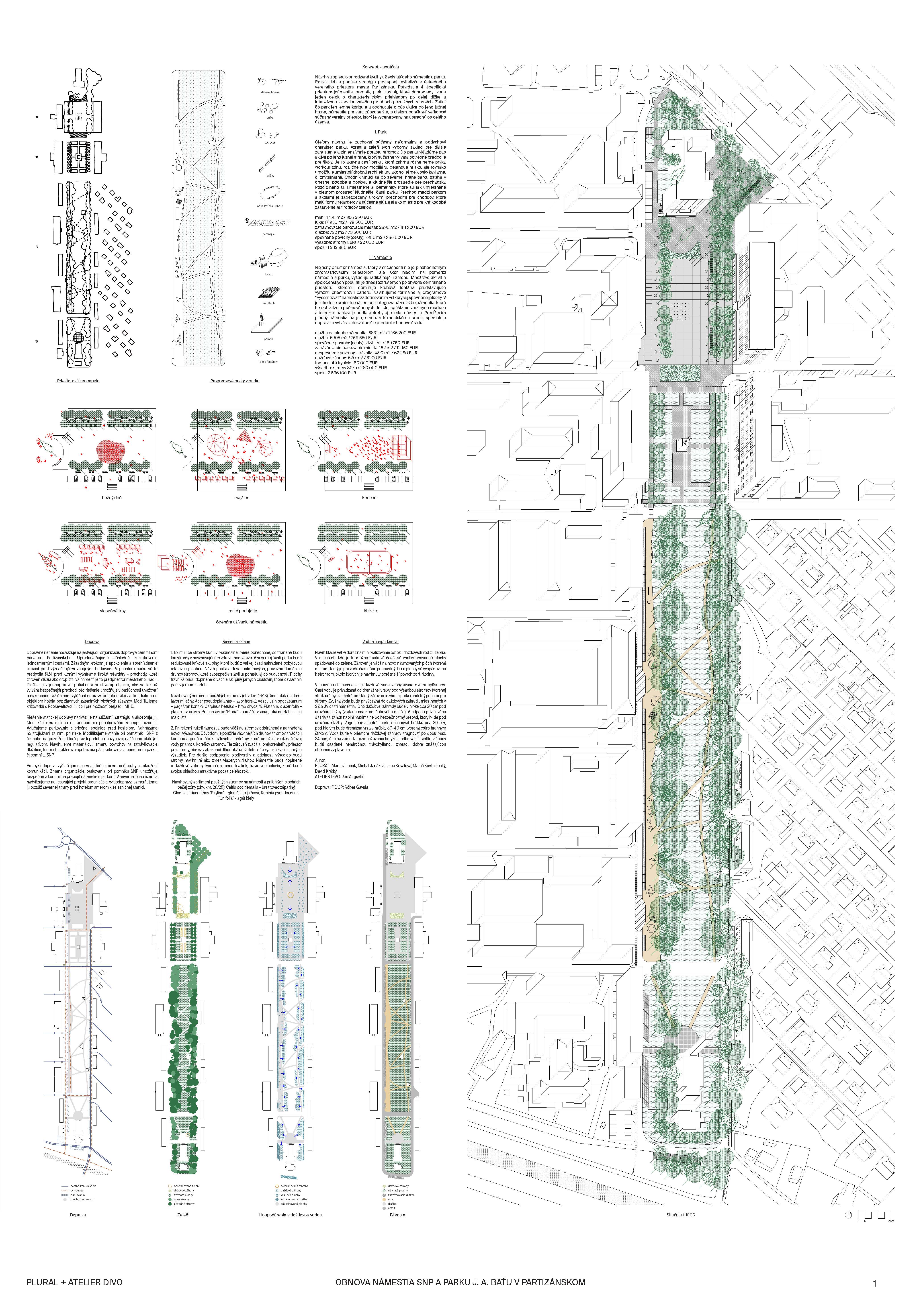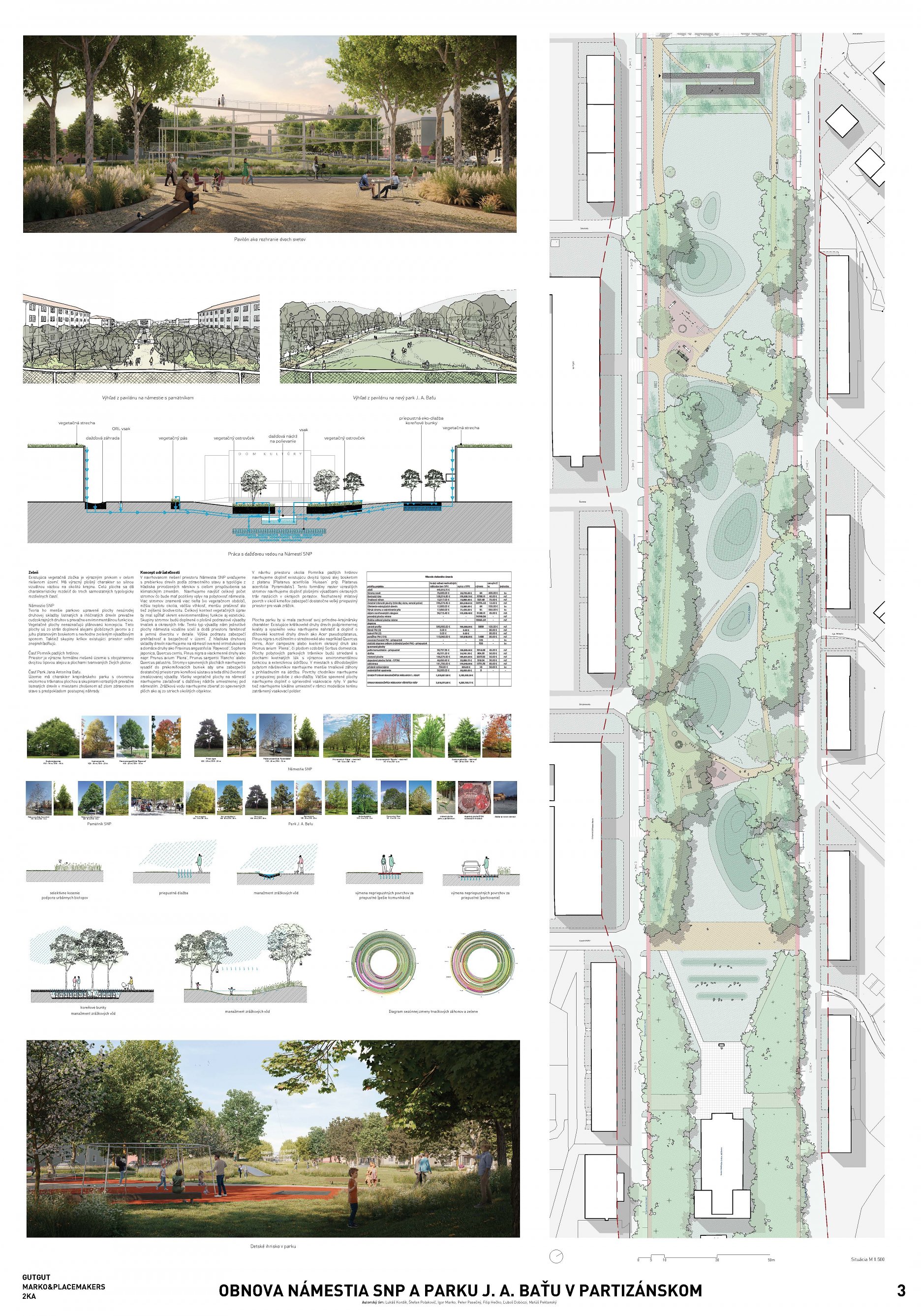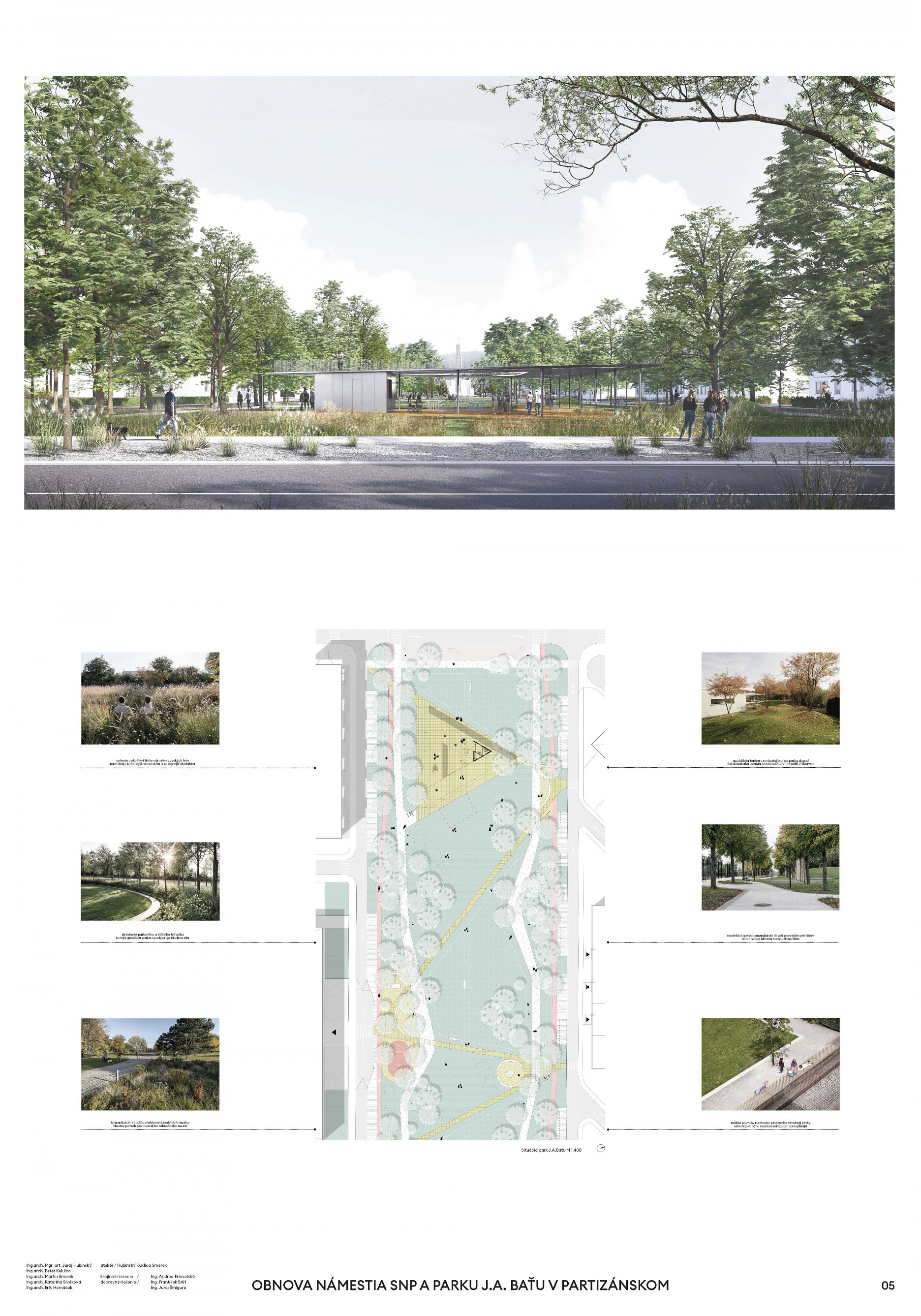 Úplný odklon od pôvodnej koncepcie centrálnej pochôdznej osi, prezentovanej vo fáze workshopu, bol hodnotený ako sympatické gesto sebareflexie. Finálny návrh vyhodnotila porota vo viacerých aspektoch ako kvalitný. Predovšetkým práca s plochou parku a riešenie sadovníckych úprav je v návrhu na vysokej úrovni, sympatická je práca so striedaním kosených plôch a nekosených lúk. Kladne porota hodnotí aj myšlienku na oživenie parku formou doplnenia pavilónu v severnej časti parku. K tvarovaniu pavilónu v tvare dominantného trojuholníka zaujala porota zhodne záporné stanovisko. Na úkor zvýšenia programovej univerzálnosti a priechodnosti v priestore námestia SNP, návrh koncepčne zachováva súčasné rozvrhnutie plôch a v rámci tejto idey pracuje aj s existujúcou fontánou. Pre riešenie plôch v severnej časti územia za Domom kultúry návrh neponúka novú kvalitu. Vnesenie cudzích, formálnych, diagonálnych motívov do kompozície spevnených a vegetačných plôch porota vyhodnotila ako nepresvedčivé a pre dané miesto nevhodné. Prínosom návrhu je zachovanie a podporenie priehľadov, kvalitný návrh parkových plôch na zvýšenie krajinársko-architektonickej hodnoty námestia a parku.