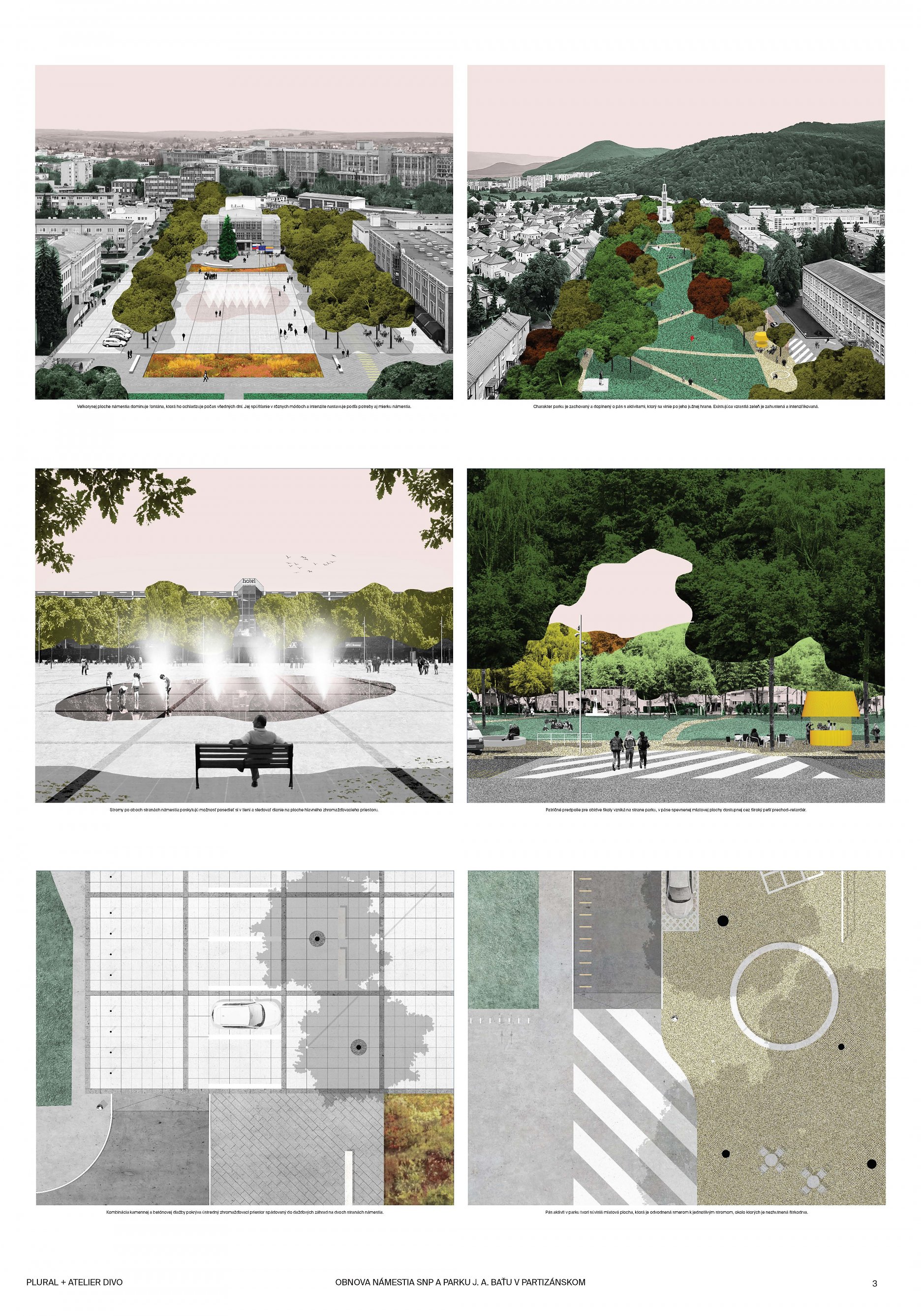 Podľa hodnotenia poroty návrh najlepšie splnil podmienky zadania súťaže a zároveň ponúkol najkonzistentnejšie celkové riešenie jednotlivých segmentov rozsiahleho riešeného územia. Návrh podľa väčšinového názoru poroty citlivým a neinvazívnym spôsobom uchováva kvality originálneho konceptu. V polohe hlavného námestia pred mestským úradom ponúka významovo a geometricky čisté a čitateľné riešenie pri zachovaní logickej kombinácie pevných a prírodných plôch. V zóne parku významovo diferencuje východnú a západnú líniu, lemovanú bytovými domami a budovami škôl. Formou univerzálnej mlatovej plochy dopĺňa pozdĺž západnej strany do parku pobytové a programové plochy. Porota odporúča zvážiť rozsah tejto úpravy na úkor zelene a súčasne uvažovať o dotiahnutí tejto koncepcie aj v zóne južnej strany predpolia kostola, ktorá by pri oživení funkčnosti parteru priľahlého domu, mohla povýšiť na živé subcentrum vo vzťahu k hlavnému námestiu. V ostatných častiach územia pracuje s minimálnymi a racionálnymi intervenciami, ktoré zlepšujú kvality verejného priestoru, resp. ho ponechávajú bez zásahu. Ako súčasť snáh o rešpektovanie a zachovanie pôvodných baťovských úprav vníma porota aj zámerné nezvýrazňovanie stopy po výškovej budove. Na námestí SNP, jednoduchými architektonickými a krajinárskymi prostriedkami, vhodne organizuje plochy okolo funkčného a čitateľného dláždeného centrálneho priestoru. Návrh tiež detailne preberá dopravné riešenie zo zadania súťaže. V tejto oblasti porota odporúča riešenie prehodnotiť na úkor celkového počtu parkovacích státí a v prípade realizácie návrhu dopracovať riešenie parkovania s väčším dôrazom na vzťah k priľahlému verejnému priestoru.