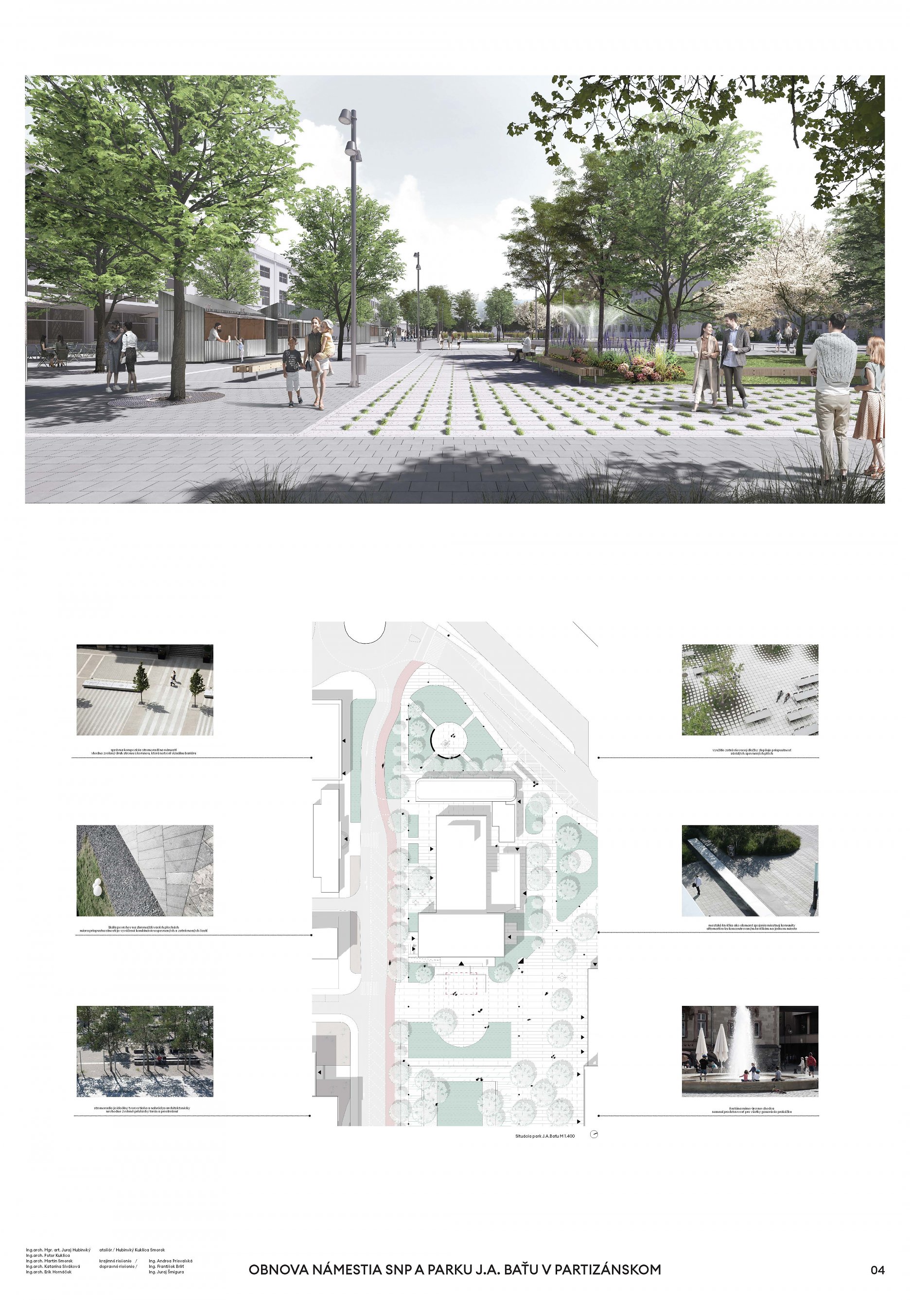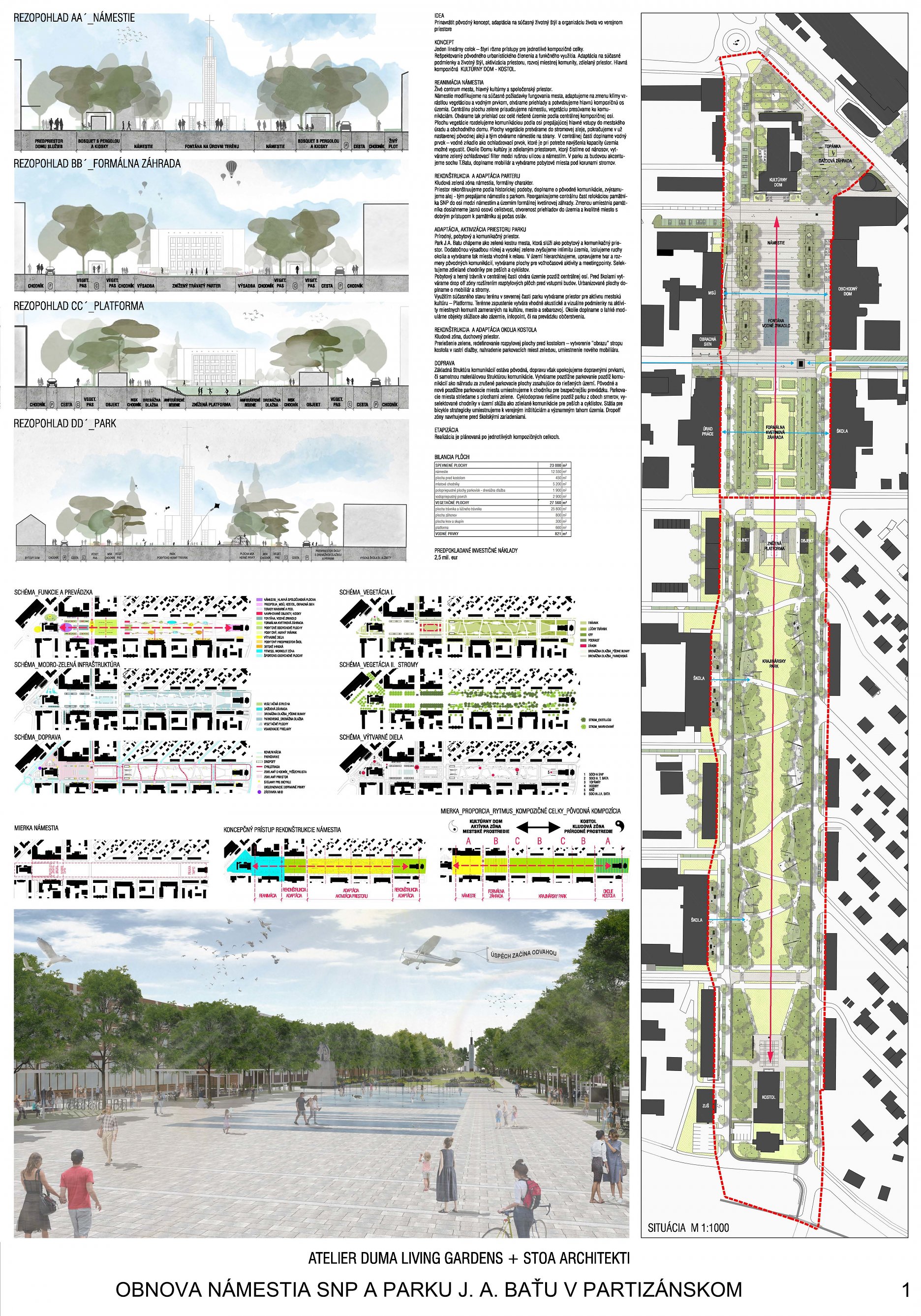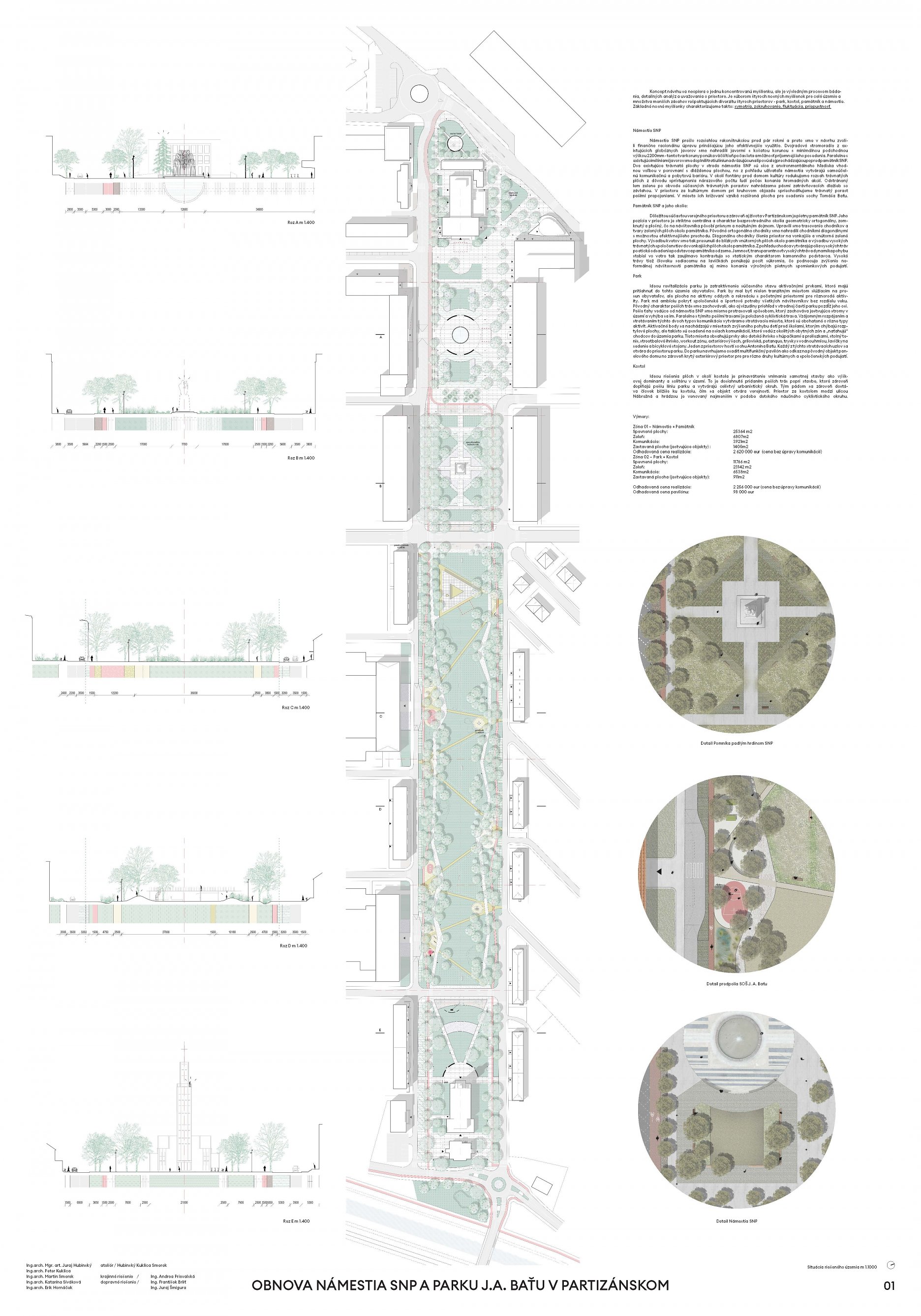 Mesto Partizánske vyhlásilo súťaž na urbanisticko-architektonicko-krajinárske riešenie revitalizácie Námestia SNP a parku J. A. Baťu v Partizánskom. Riešené územie, s plochou približne 60 000 m2, predstavuje unikátny rozsah zadania, pozostávajúci z viacerých lineárne radených verejných priestorov v centre mesta Partizánske. Sú súčasťou pôvodného urbanistického konceptu ideálneho priemyselného mesta z 30. rokov minulého storočia podľa regulačného plánu mesta Baťovany, vypracovaného architektom Jiřím Voženílkom, pod vedením architekta Vladimíra Karfíka.