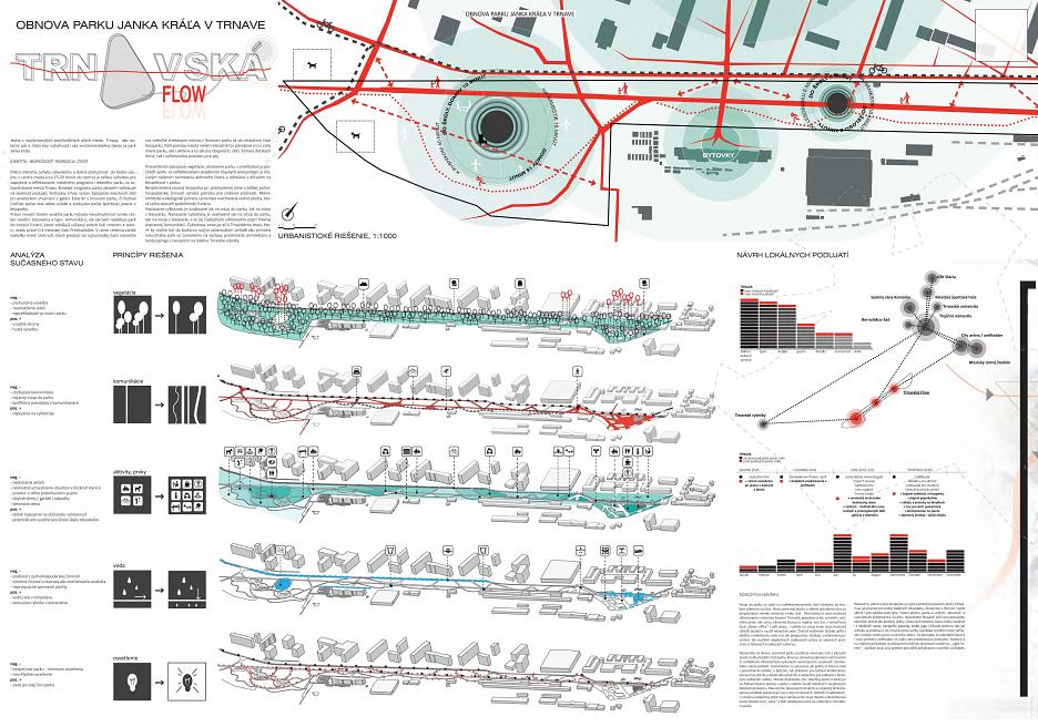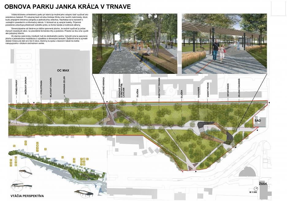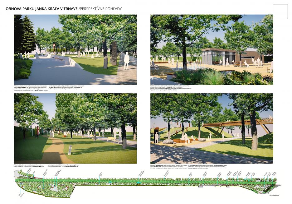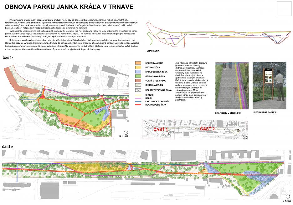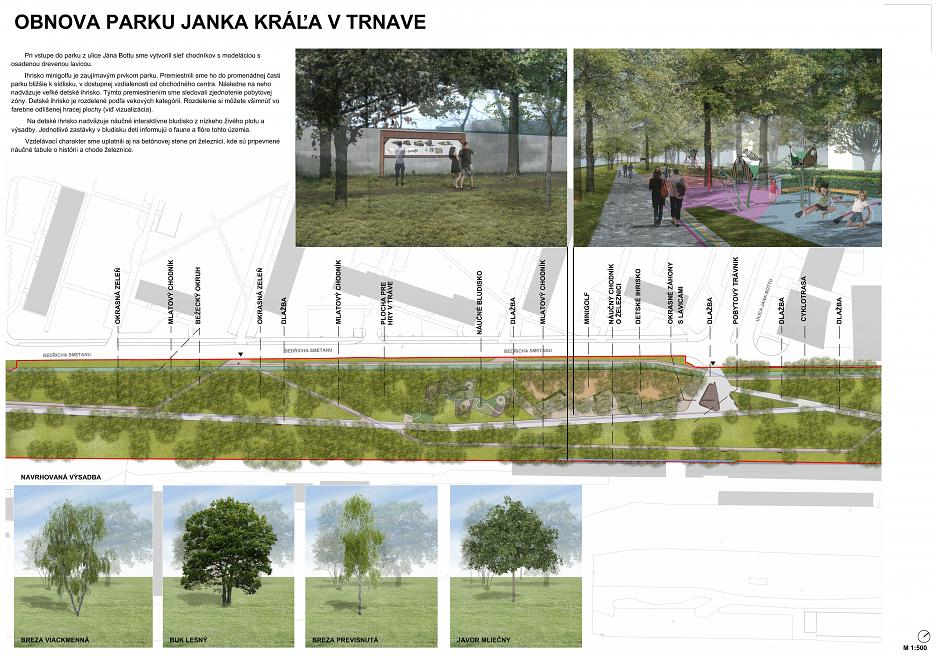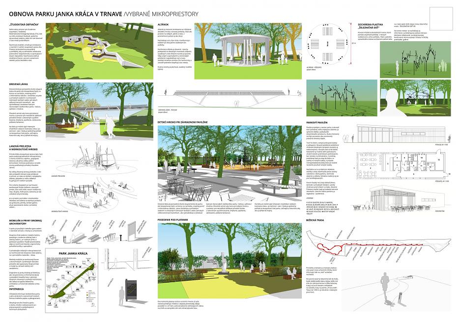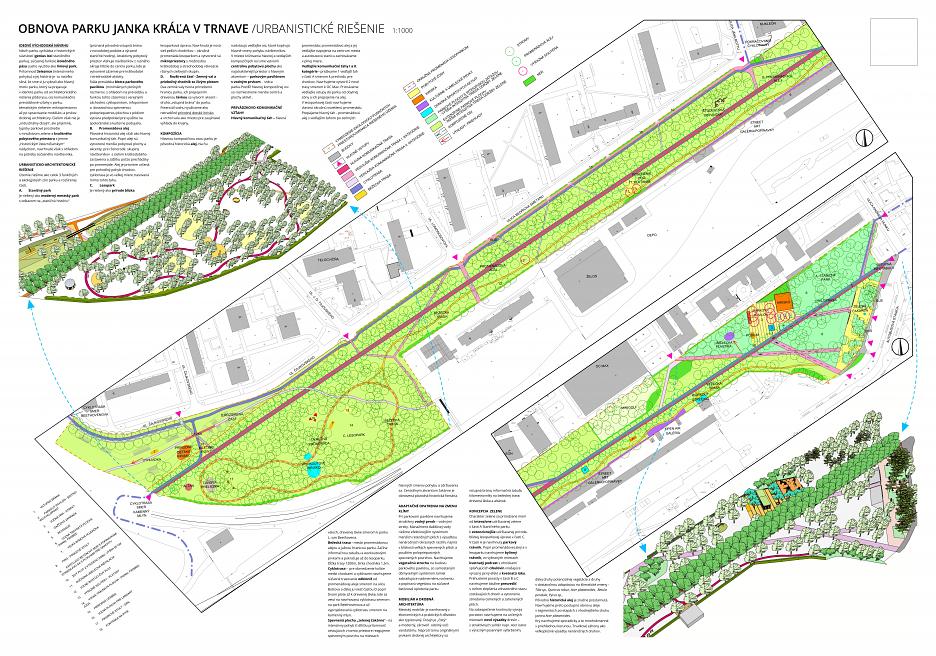 Úryvok z textovej časti návrhu: Park Janka Kráľa má úžasný potenciál stať sa hodnotnou zelenou „oázou“ v urbanizovanom prostredí. Našim prioritným cieľom je zachovať jeho prírodný charakter s čo najmenšími intervenciami. Nemyslíme si, že by mal byť preplnený množstvom aktivít či detských ihrísk, prioritou je pre nás zeleň, ktorá má slúžiť na oddych a relaxáciu. Je nevyhnutné podporovať biodiverzitu na jeho území. Park je biocentrom v ÚSES mesta Trnava a našim návrhom ho v maximálnej možnej miere, s prihliadnutím na jeho umiestnenie v živej urbanistickej štruktúre mesta, podporujeme a obohacujeme. Našim návrhom ponúkame kvalitný prírodn ý priestor s mo žnosťou relaxácie a možnosťou pasívneho aj aktívneho oddychu.