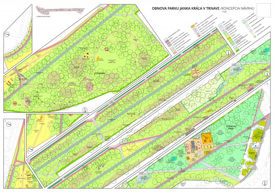 Úryvok z textovej časti návrhu: Jedna z najvýznamnejších polyfunkčných plôch mesta Trnava, ako izolačný pás a historicky natiahnutá ruka vnútromestského diania je park Janka Kráľa. Park nadobudol od založenia jedinečnú atmosféru vzrastlých stromov linúcich sa i po stredovej osi parku, ktoré však svojím stavom vyžadujú citlivú prebierku podľa zdravotného stavu a vnímavú dosadbu novej zelene. Významné a strategické prepojenie cyklotrasy k Trnavským rybníkom má neoceniteľný význam, avšak plní kolízny charakter v spojitosti so zmiešanými aktivitami a premávkou vo vnútornom členení parku.