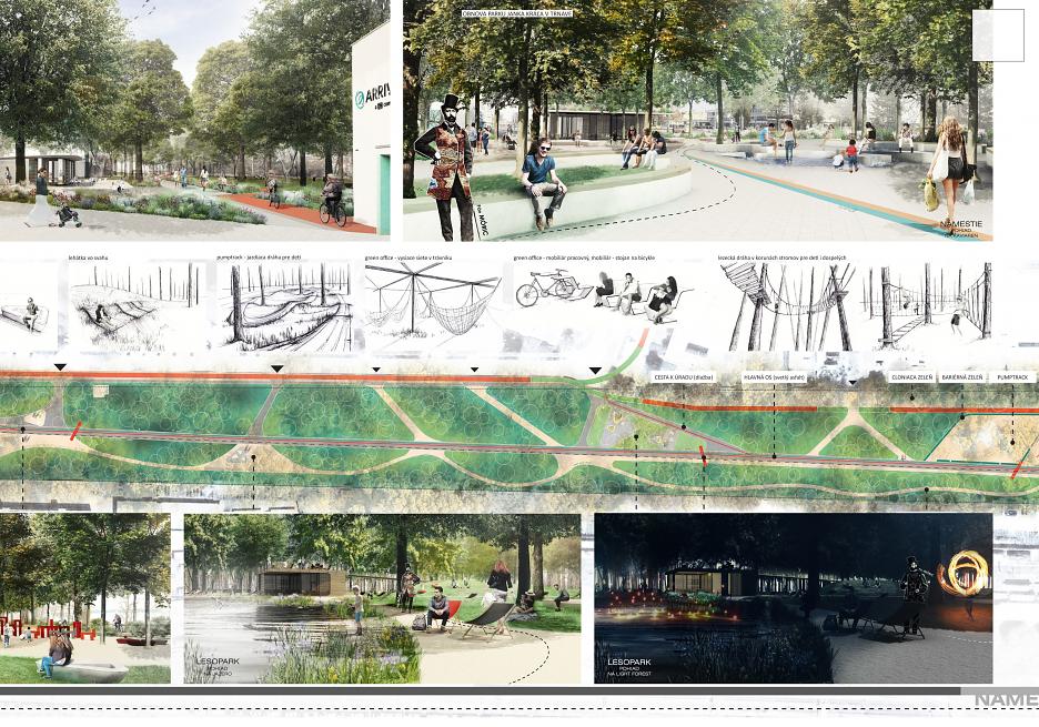Úryvok z textovej časti návrhu: Koncepcia riešenia zachováva pôvodné členenie parku na tri základné zóny – predstaničný pobytový priestor, prepojovacia kľudová alej a lesopark pre športové aktivity pri sídlisku. Logickým rozvrhnutím primeraných aktivít ponúka širokospektrálne využitie pre návštevníkov. Projekt rieši komplexnú revitalizáciu mestského parku, so zameraním na potreby cieľových skupín, s nutným posilnením multifunkčného zázemia a vytvorenie kreatívneho prostredia pre realizáciu kultúrnych aktivít a podujatí, ako aj umiestnenie umeleckých artefaktov. Základným dizajnovým princípom bol navolený kontrast medzi organickým trasovaním komunikačných ťahov s geometriou navrhovaných objektov a architektonických prvkov.