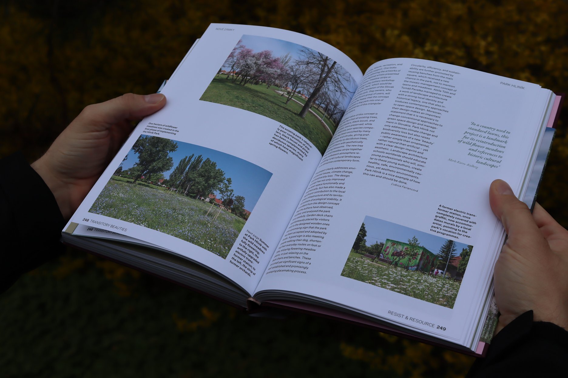 „Potom je tu návrh Parku Hliník (s. 246) v bývalom hliníku v slovenskom meste Nové Zámky. Krajinní architekti Tomáš Pavelka a Attila Tóth využili rekonštrukciu tohto trojhektárového územia na okraji mesta na boj proti úbytku biodiverzity a efektom klimatickej zmeny. Množstvo spevnených plôch bolo obmedzené na minimum, aby dažďová voda mohla ľahšie vsakovať do pôdy. Pásy kvitnúcich lúk podporujú druhovú diverzitu a výsadba nových stromov a krov s bohatým kvitnutím – spolu s už existujúcimi topoľmi a borovicami – poskytuje tienisté miesta a chlad. Mestský mobiliár je prevažne z druhej ruky – napríklad lavičky pochádzajú z hlavného námestia v centre mesta. Nástenné maľby na trafostanici upozorňujú návštevníkov na to, aká dôležitá je príroda pre blahobyt ľudí.“
