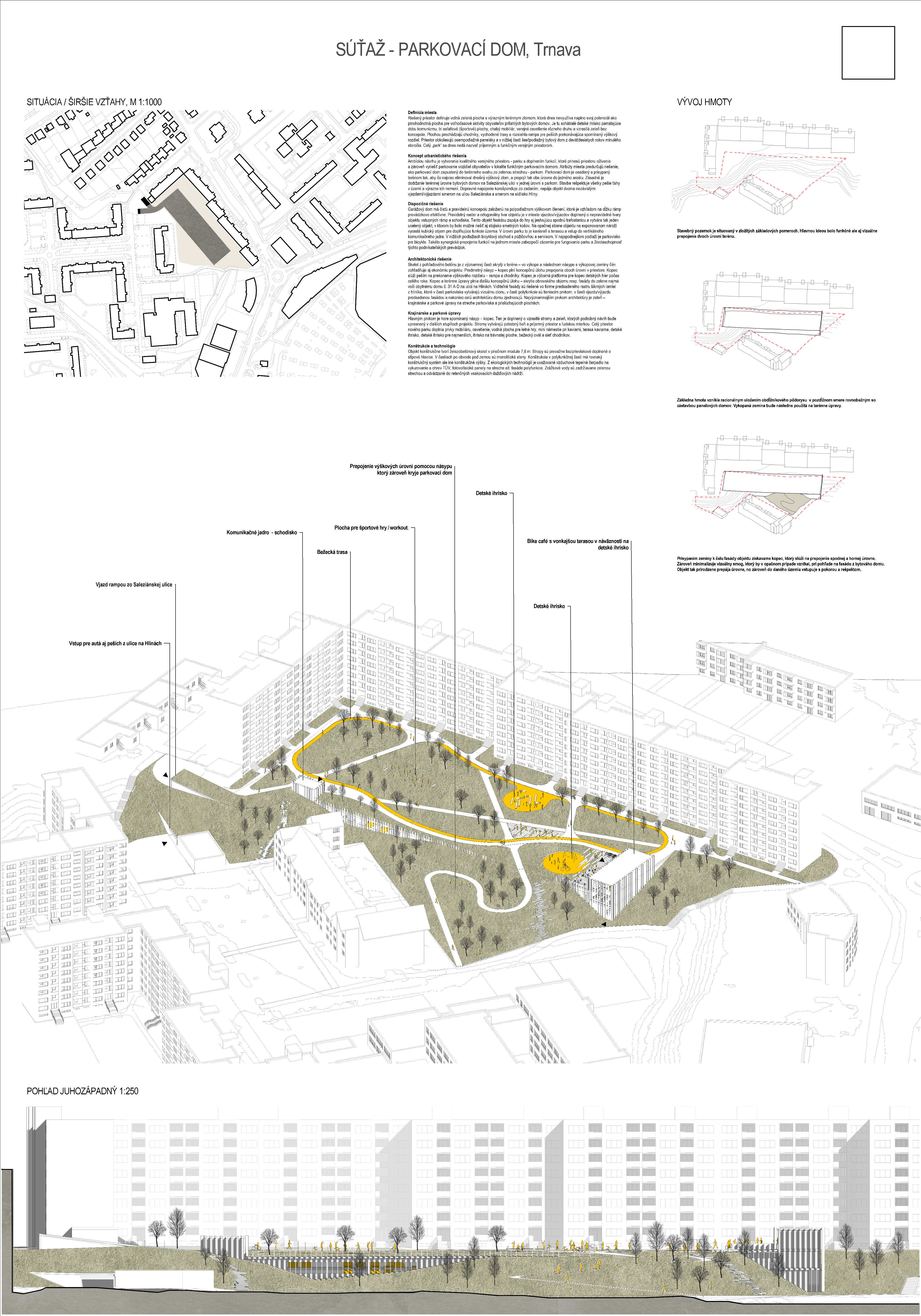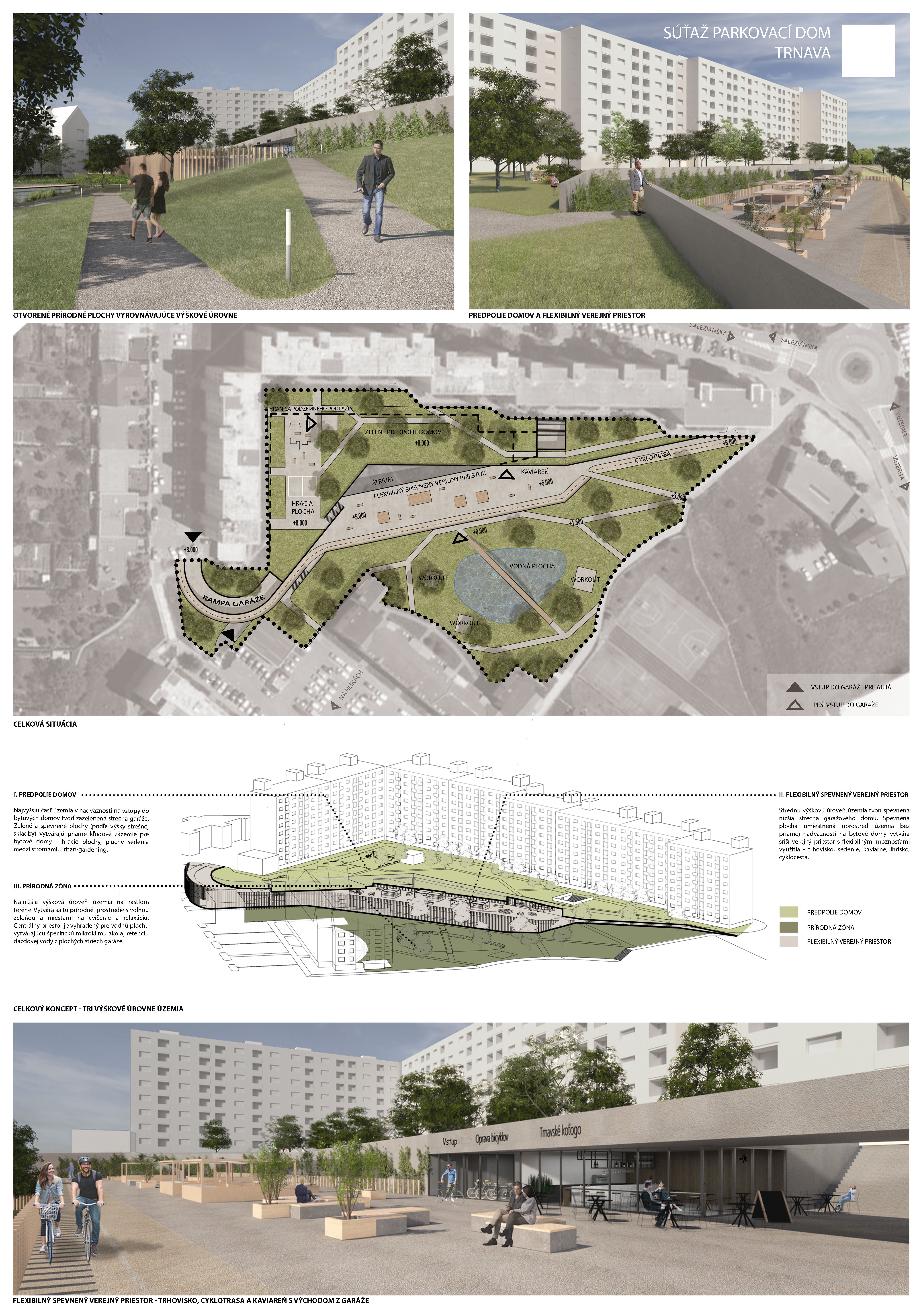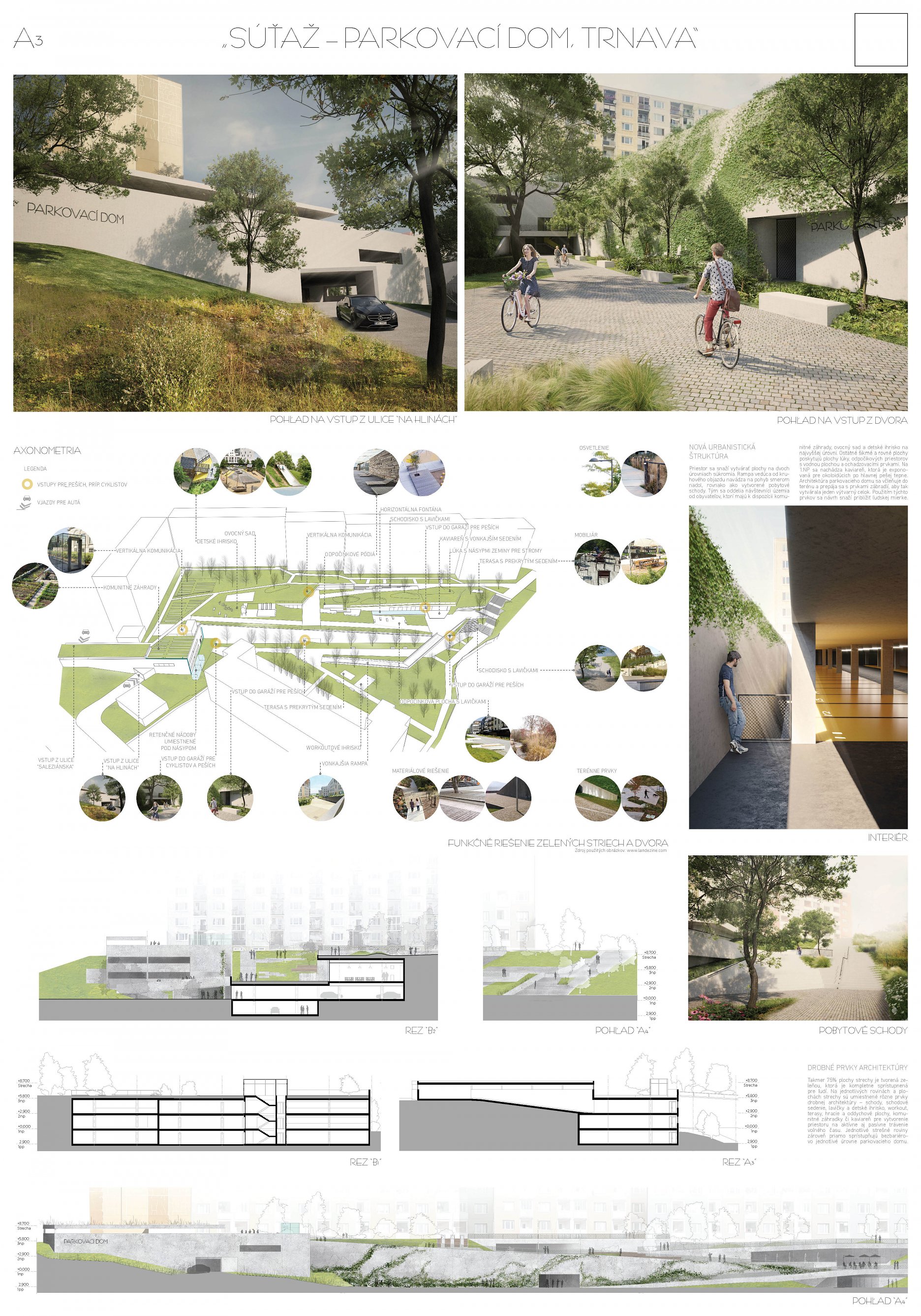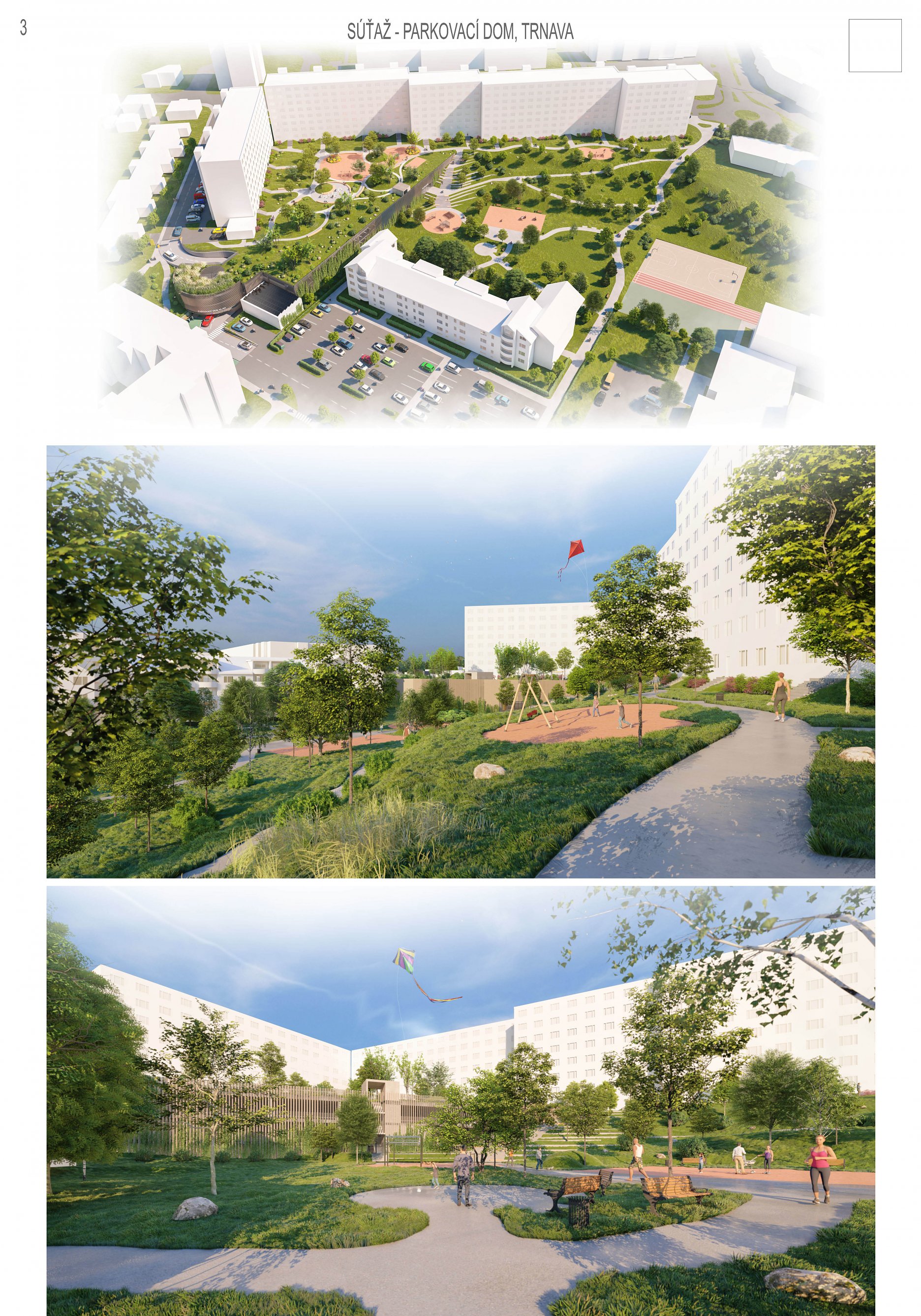 Návrh výborne zapadá do zeleného vnútrobloku. Porota ocenila, že samotný objekt garáží bude minimálne vnímavý a viditeľný. Práca s topológiou terénu a prisypanie objemu bolo hodnotené veľmi kladne. Rovnako ako vjazdy, ktoré minimálne zasahujú do vnútrobloku. Logika parkovania a riešenie pohybu áut je tiež veľmi čisté. Prezentácia návrhu je veľmi prehľadná a čitateľná. Objekt kaviarne s výlezom a terasou môže oživiť funkčné využitie zeleného vnútrobloku. Čiastočne priznanie hrany objektu v parku môže byť vnímané ako zbytočné a limitujúce. Ako celok je ale návrh veľmi zrelý a dalo by sa na ňom pokračovať a rozvíjať ho ešte viac v ďalších stupňoch projektovania.