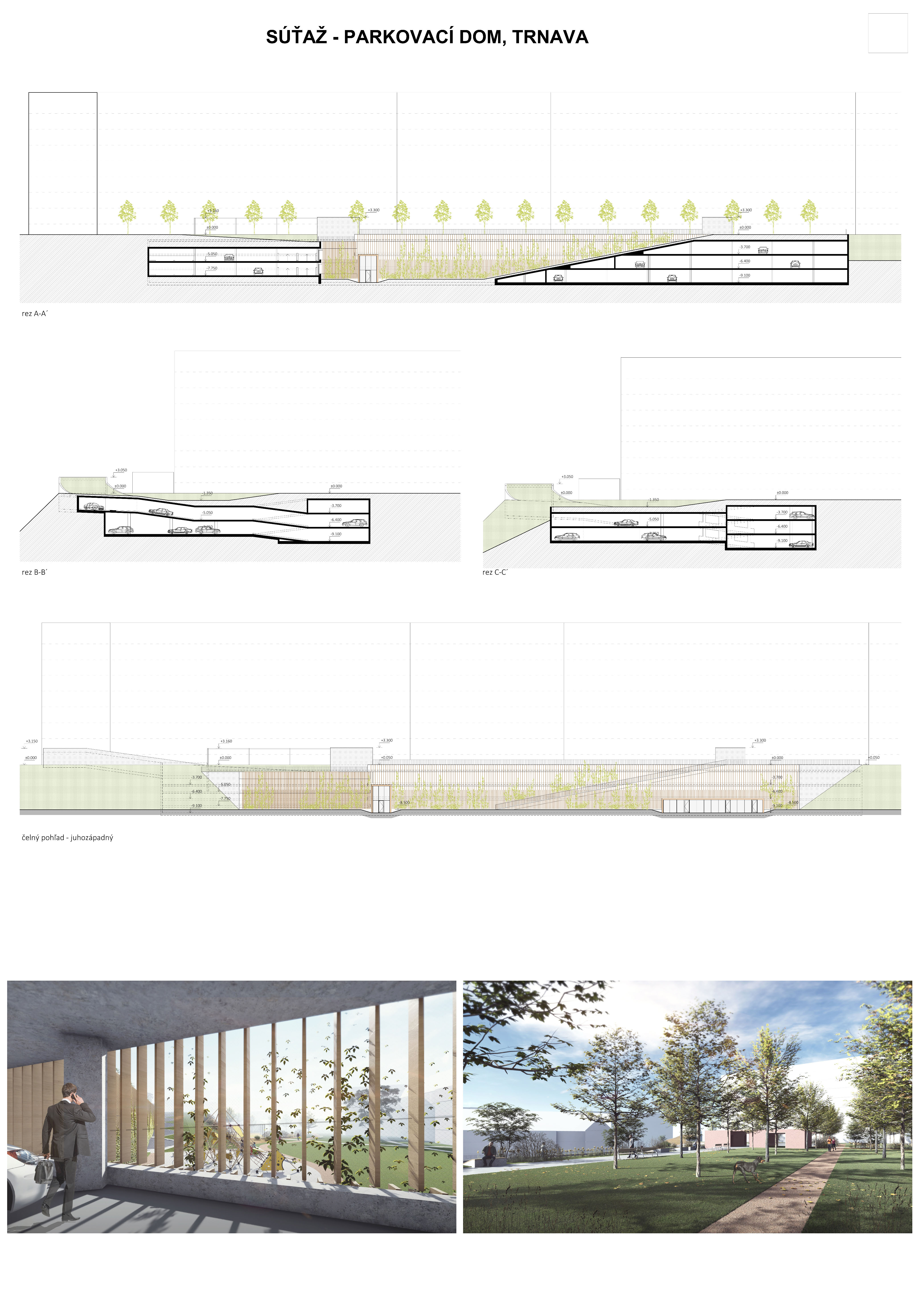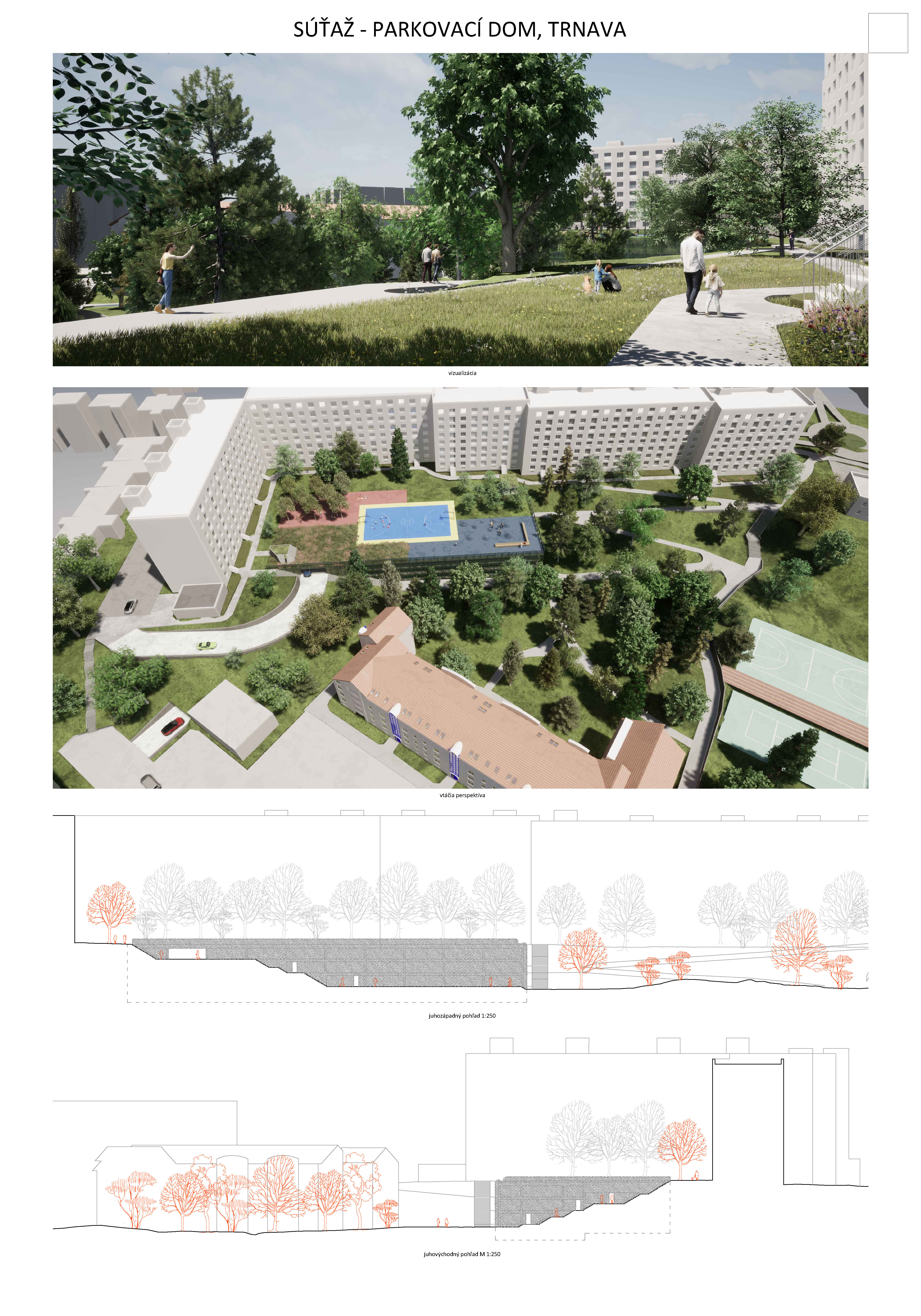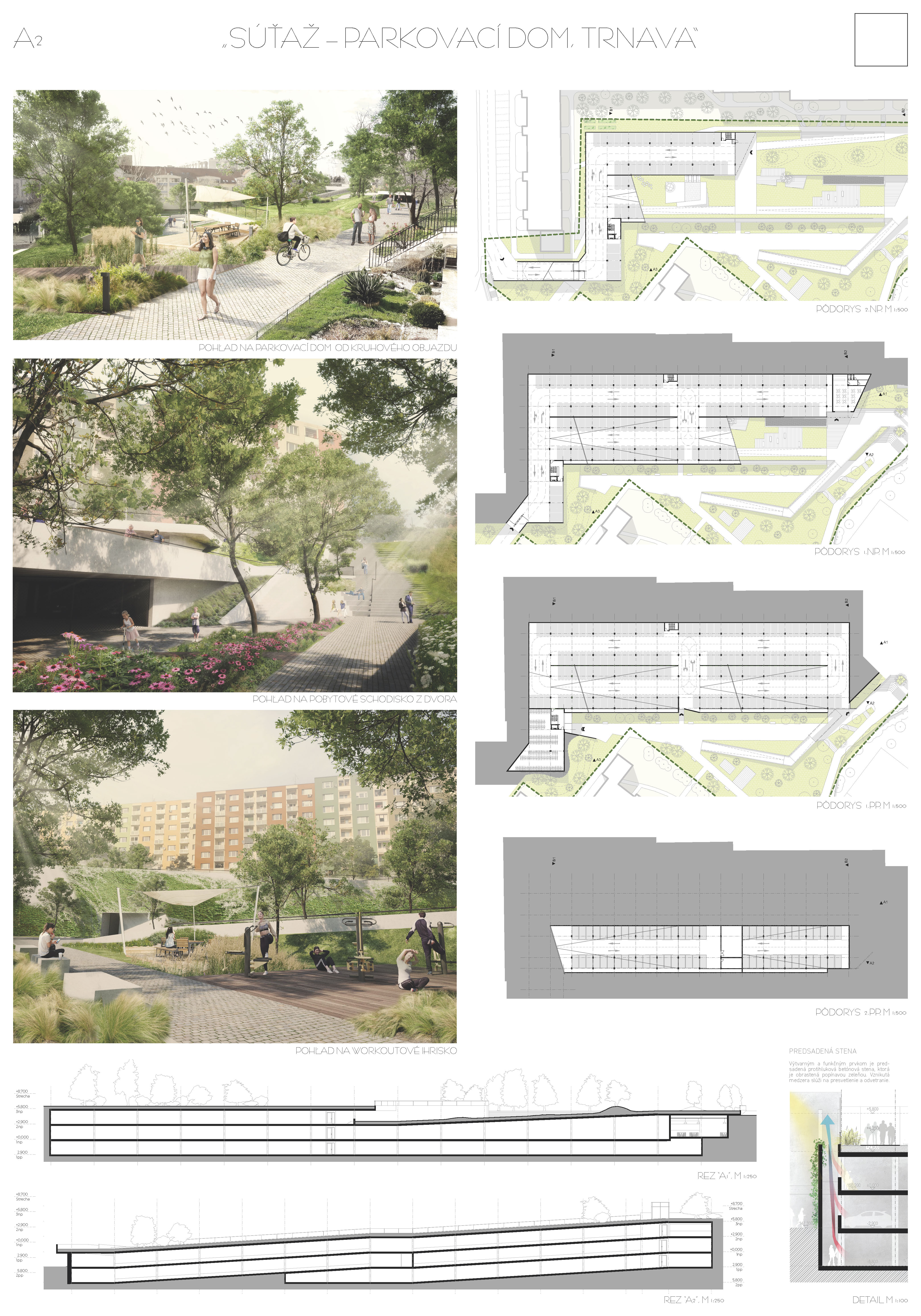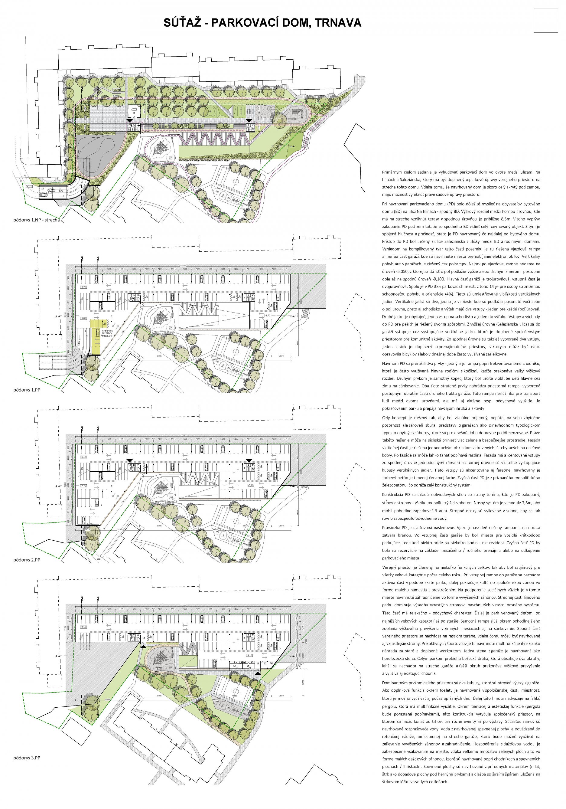 Návrh výborne zapadá do zeleného vnútrobloku. Porota ocenila, že samotný objekt garáží bude minimálne vnímavý a viditeľný. Práca s topológiou terénu a prisypanie objemu bolo hodnotené veľmi kladne. Rovnako ako vjazdy, ktoré minimálne zasahujú do vnútrobloku. Logika parkovania a riešenie pohybu áut je tiež veľmi čisté. Prezentácia návrhu je veľmi prehľadná a čitateľná. Objekt kaviarne s výlezom a terasou môže oživiť funkčné využitie zeleného vnútrobloku. Čiastočne priznanie hrany objektu v parku môže byť vnímané ako zbytočné a limitujúce. Ako celok je ale návrh veľmi zrelý a dalo by sa na ňom pokračovať a rozvíjať ho ešte viac v ďalších stupňoch projektovania.