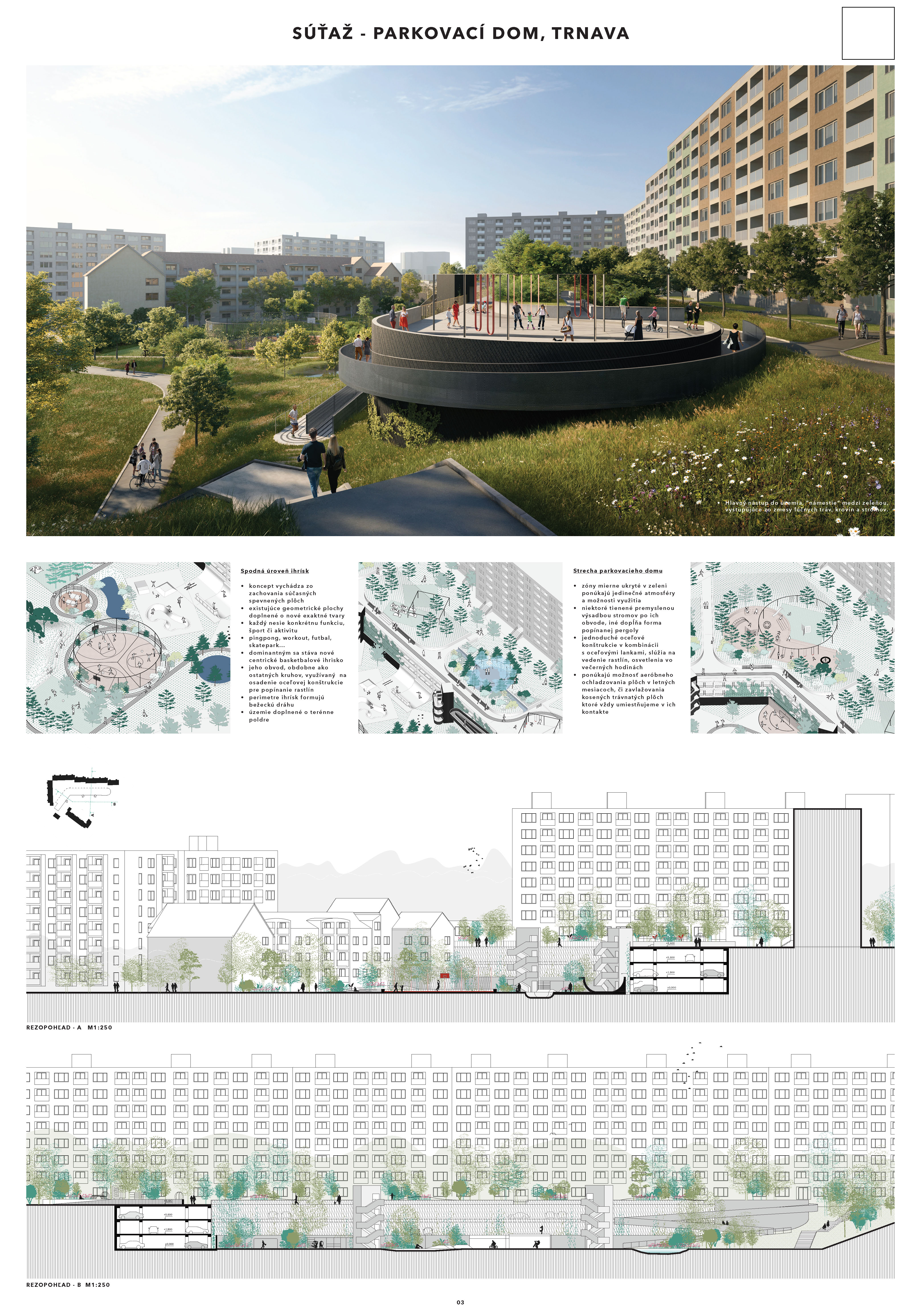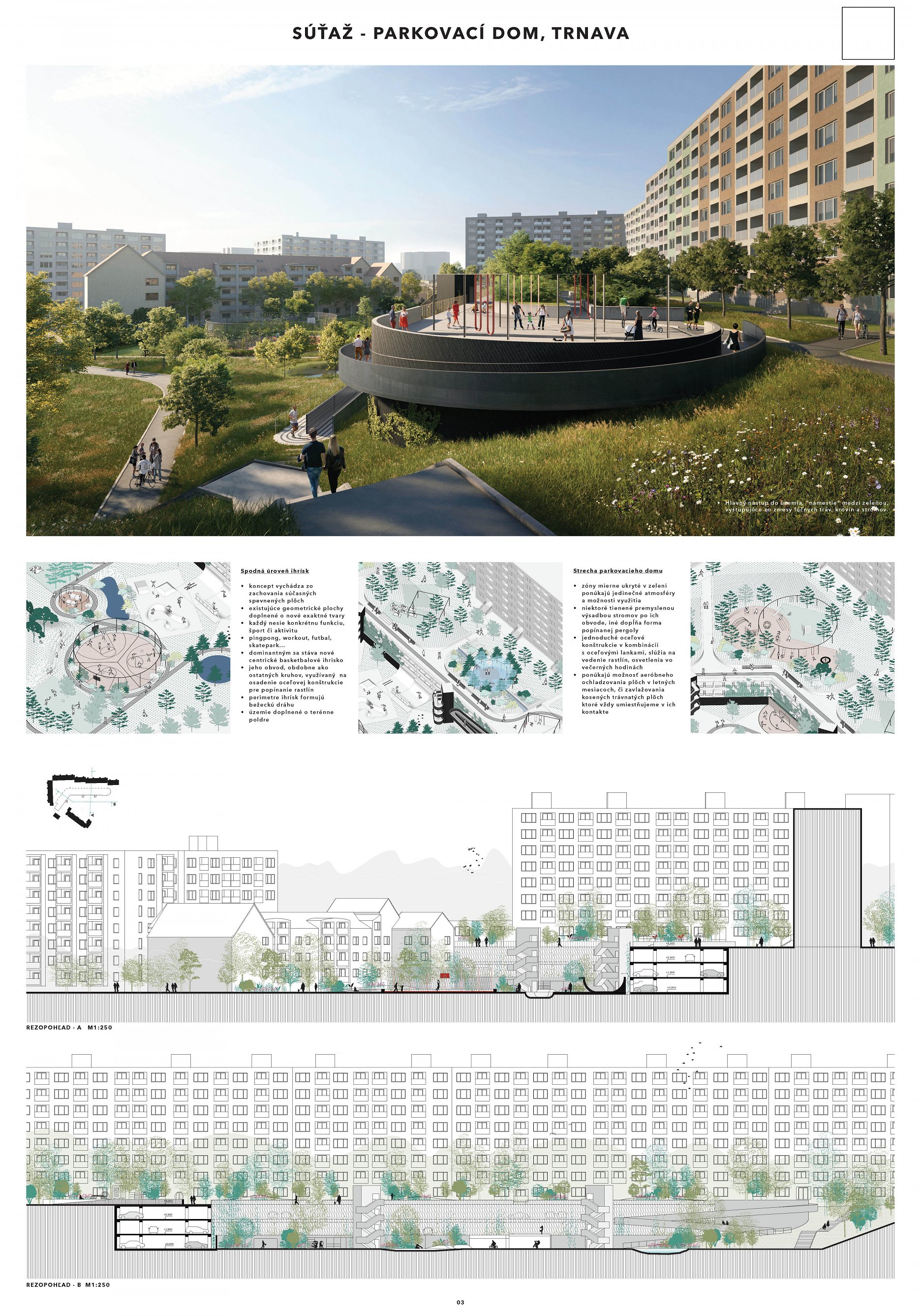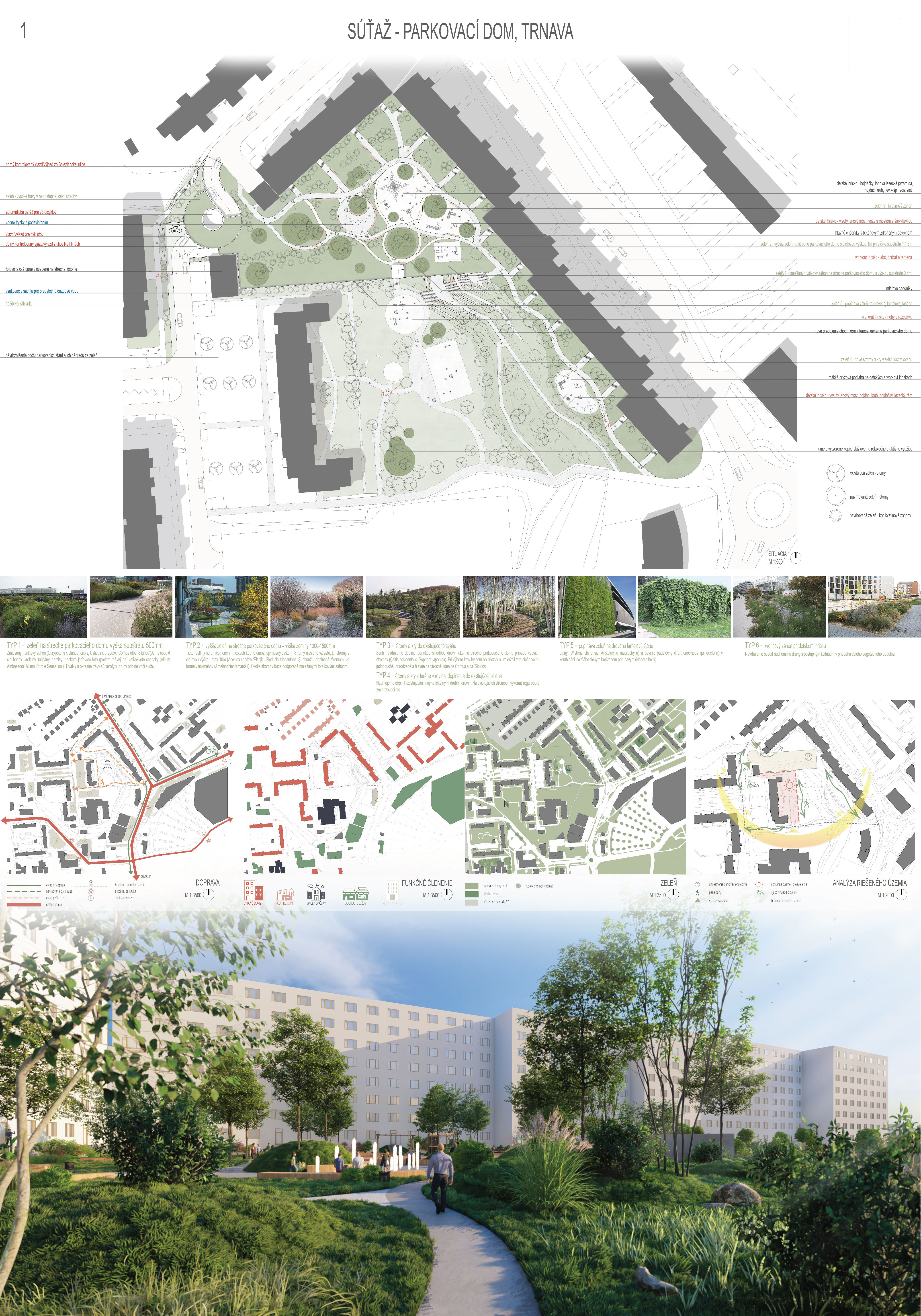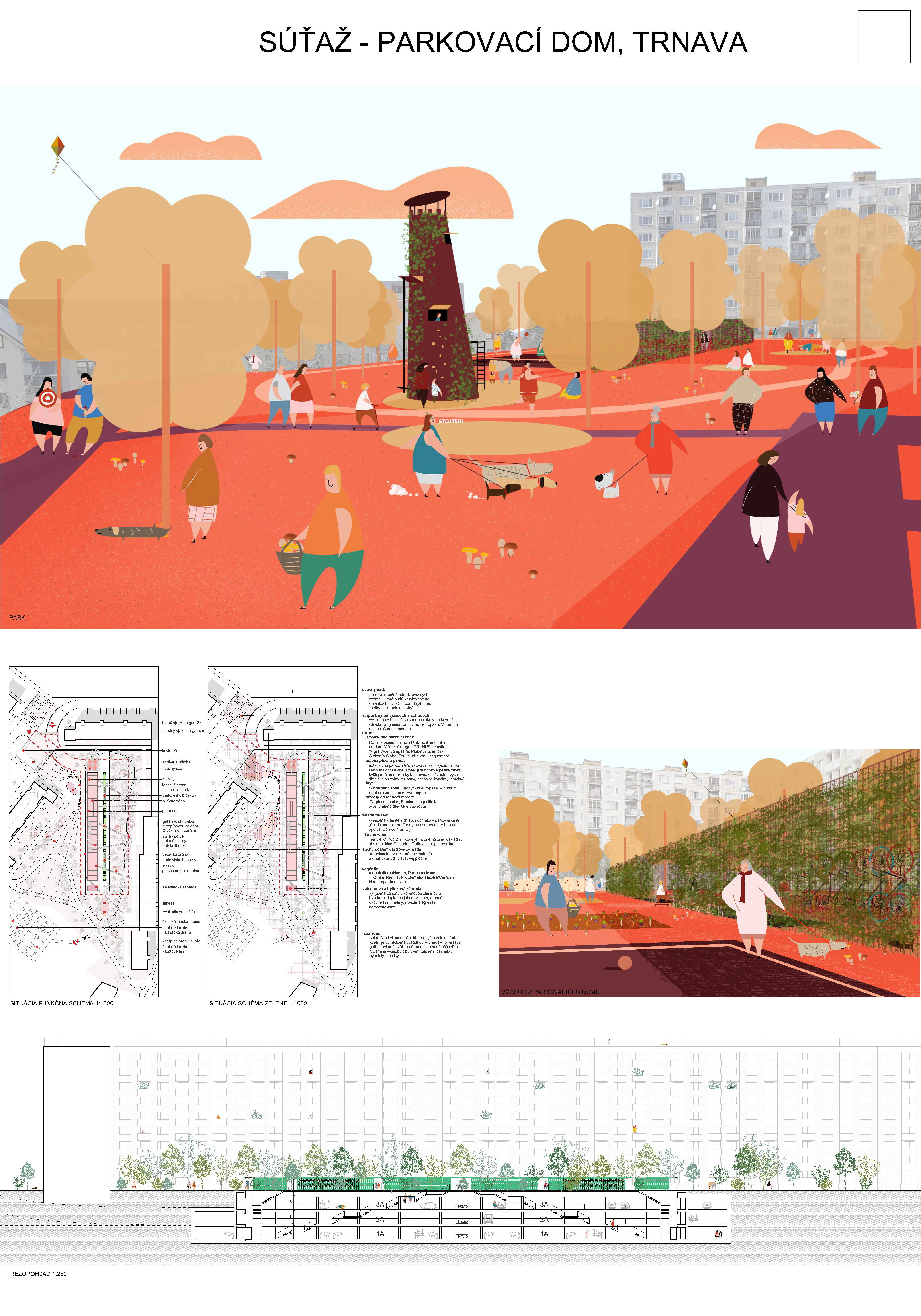 Návrh výborne zapadá do zeleného vnútrobloku. Porota ocenila, že samotný objekt garáží bude minimálne vnímavý a viditeľný. Práca s topológiou terénu a prisypanie objemu bolo hodnotené veľmi kladne. Rovnako ako vjazdy, ktoré minimálne zasahujú do vnútrobloku. Logika parkovania a riešenie pohybu áut je tiež veľmi čisté. Prezentácia návrhu je veľmi prehľadná a čitateľná. Objekt kaviarne s výlezom a terasou môže oživiť funkčné využitie zeleného vnútrobloku. Čiastočne priznanie hrany objektu v parku môže byť vnímané ako zbytočné a limitujúce. Ako celok je ale návrh veľmi zrelý a dalo by sa na ňom pokračovať a rozvíjať ho ešte viac v ďalších stupňoch projektovania.