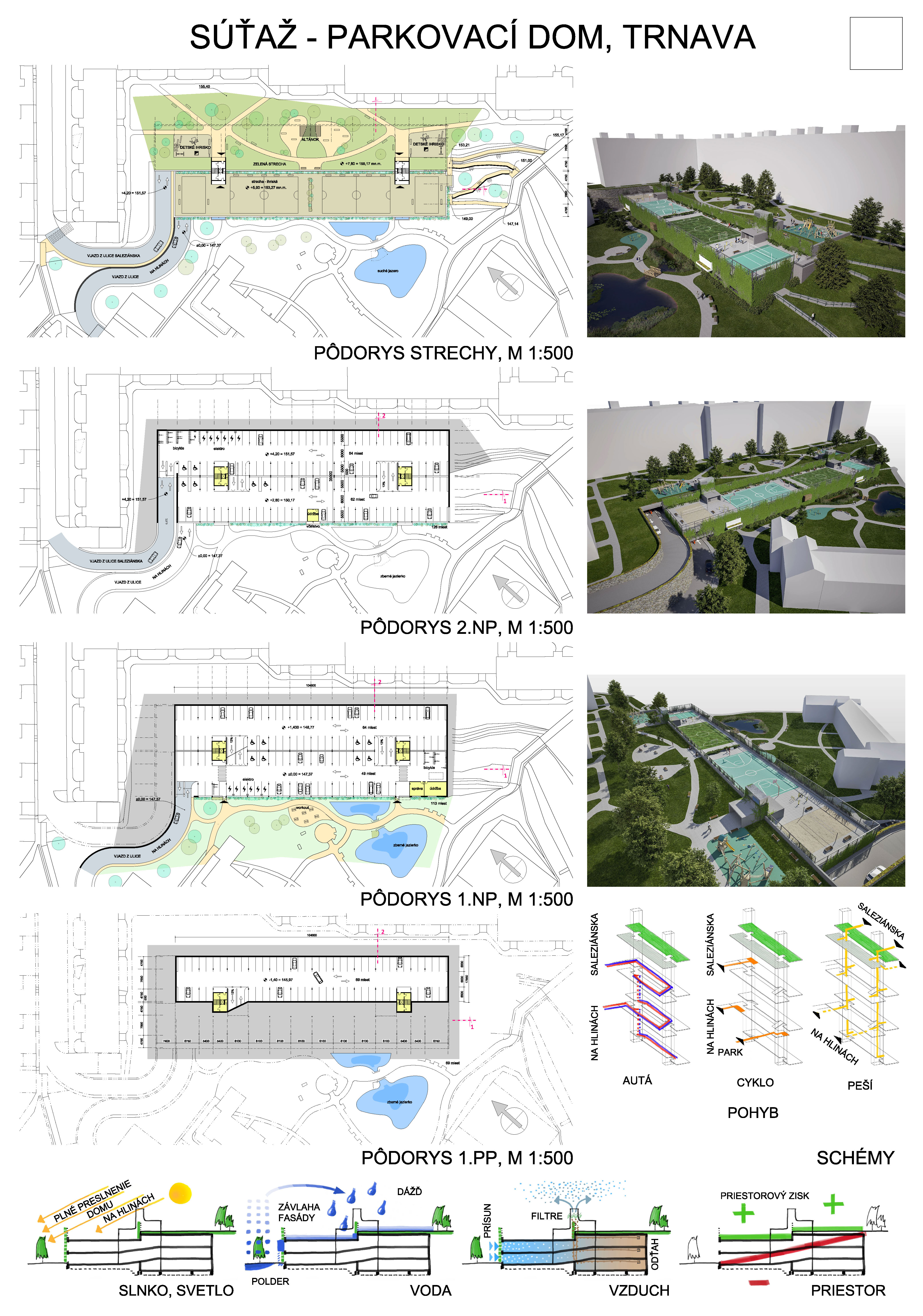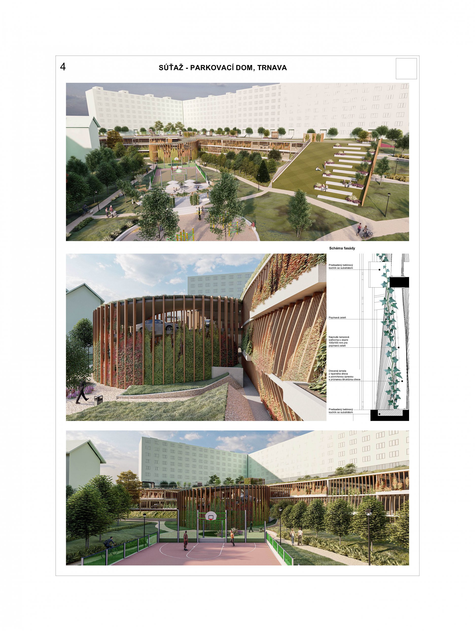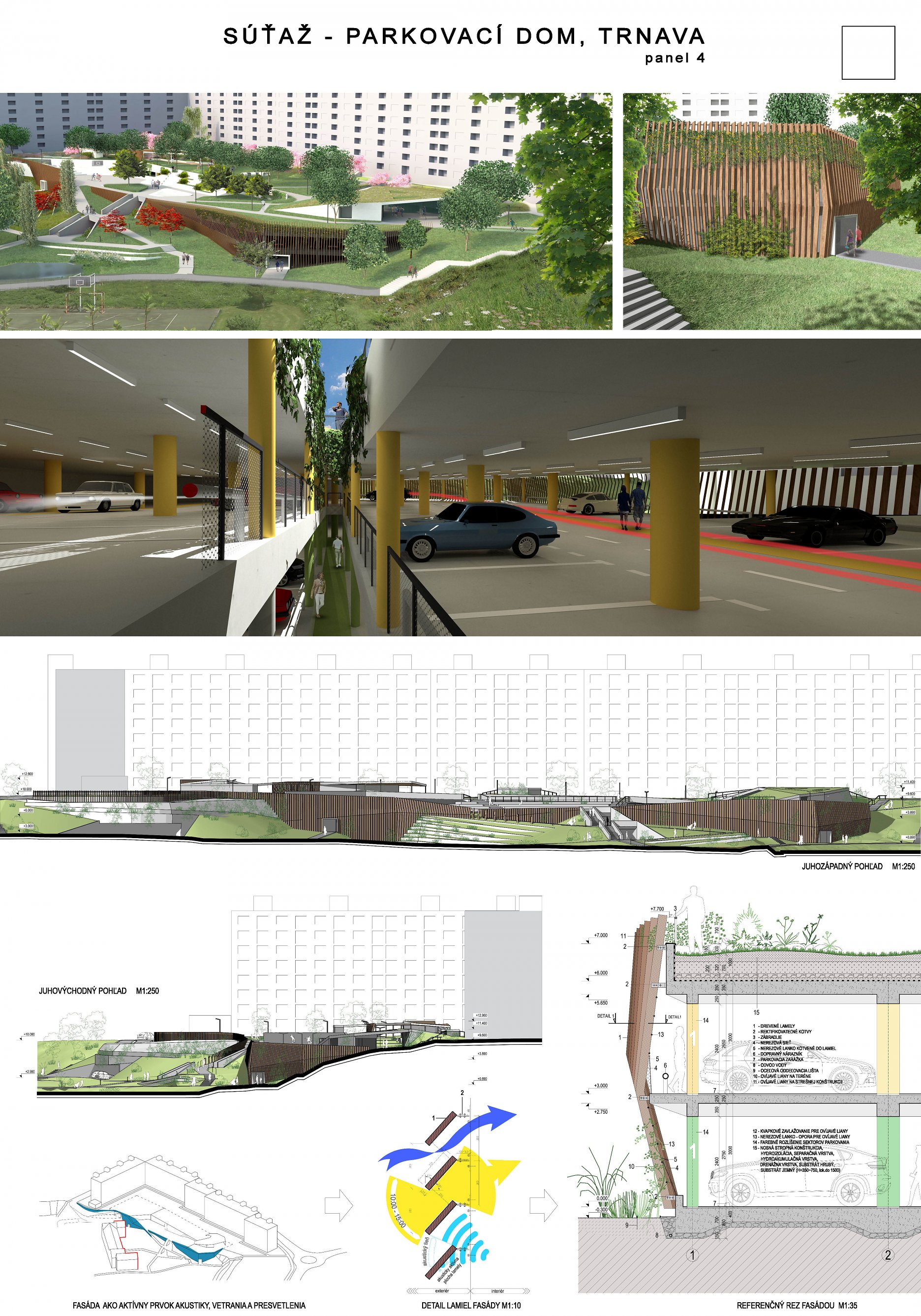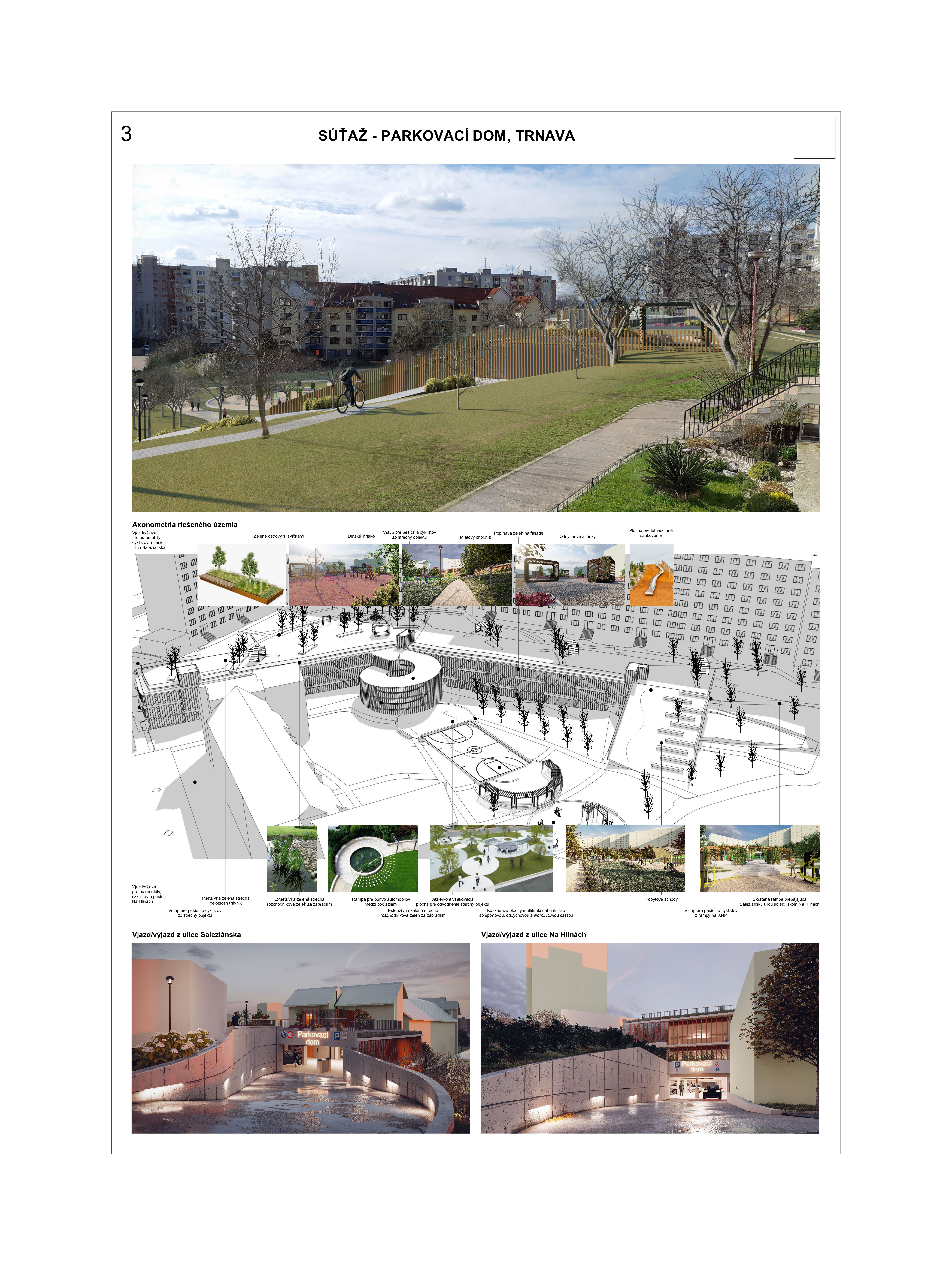 Návrh rieši predmetné územie vytvorením zalomeného parkovacieho domu s vizuálne akcentovanými lamelovými stenami. Kompozícia vytvára masívne schodisko ktoré pôsobí značne formálne. Otázne je pôdorysné riešenie, ktoré svojim tvarom vytvára hlučnú zónu v strede a je otázne z hľadiska ekonomickej efektívnosti - využitia priestoru v zalomených častiach. Využitie iba jedného prístupu zo Saleziánskej ulice obmedzuje možnosti alternatívneho dopravného napojenia a nie je v súlade s požiadavkami súťažných podmienok. Hmota objektu je pomerne výrazne akcentovaná v priestore vnútrobloku, čo vyvolá náročnosť z hľadiska ďalšej údržby a prevádzky. Akceptovať je možné usporiadanie priestoru nad parkoviskom a vytvorenie športovo oddychovej zóny.