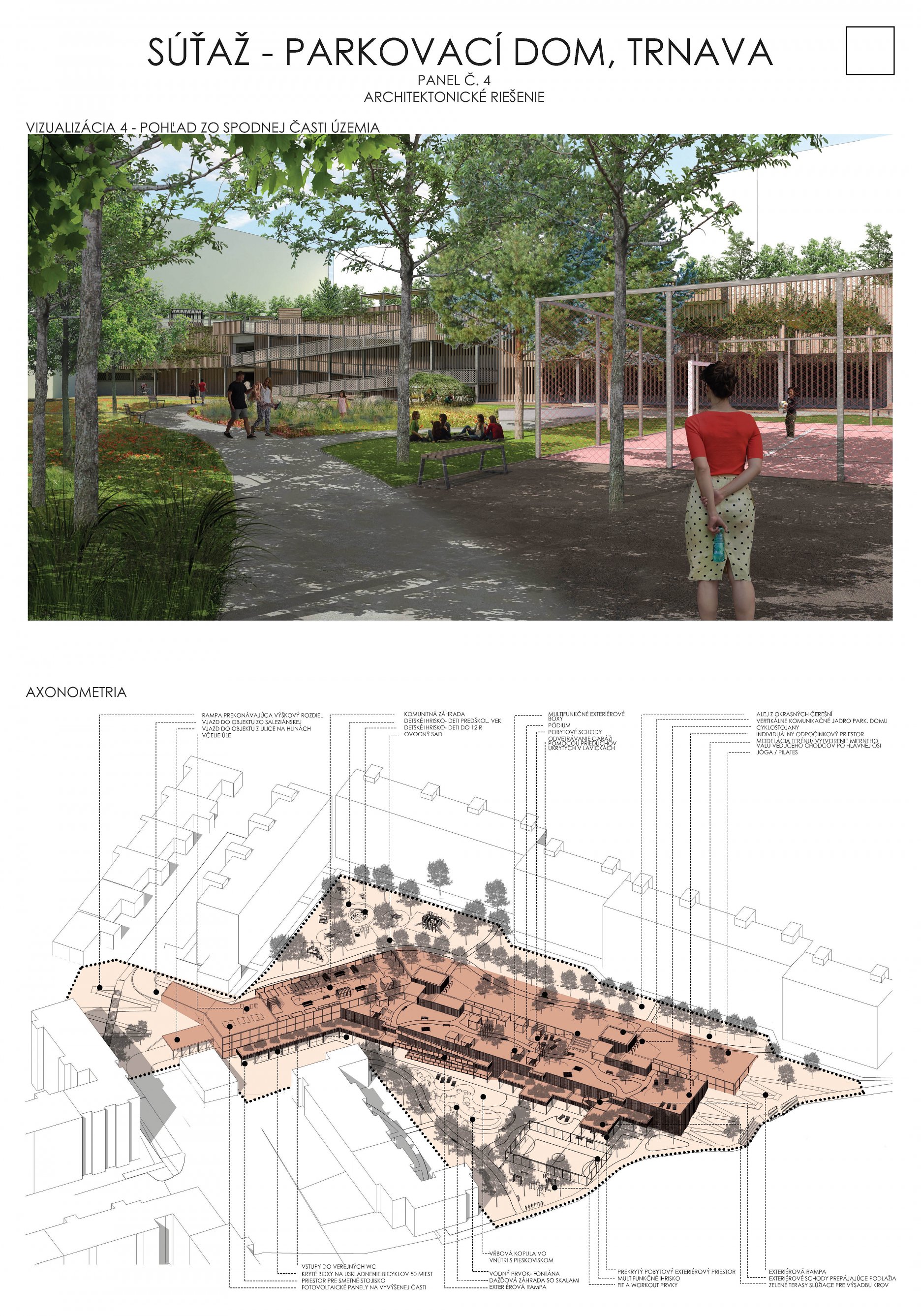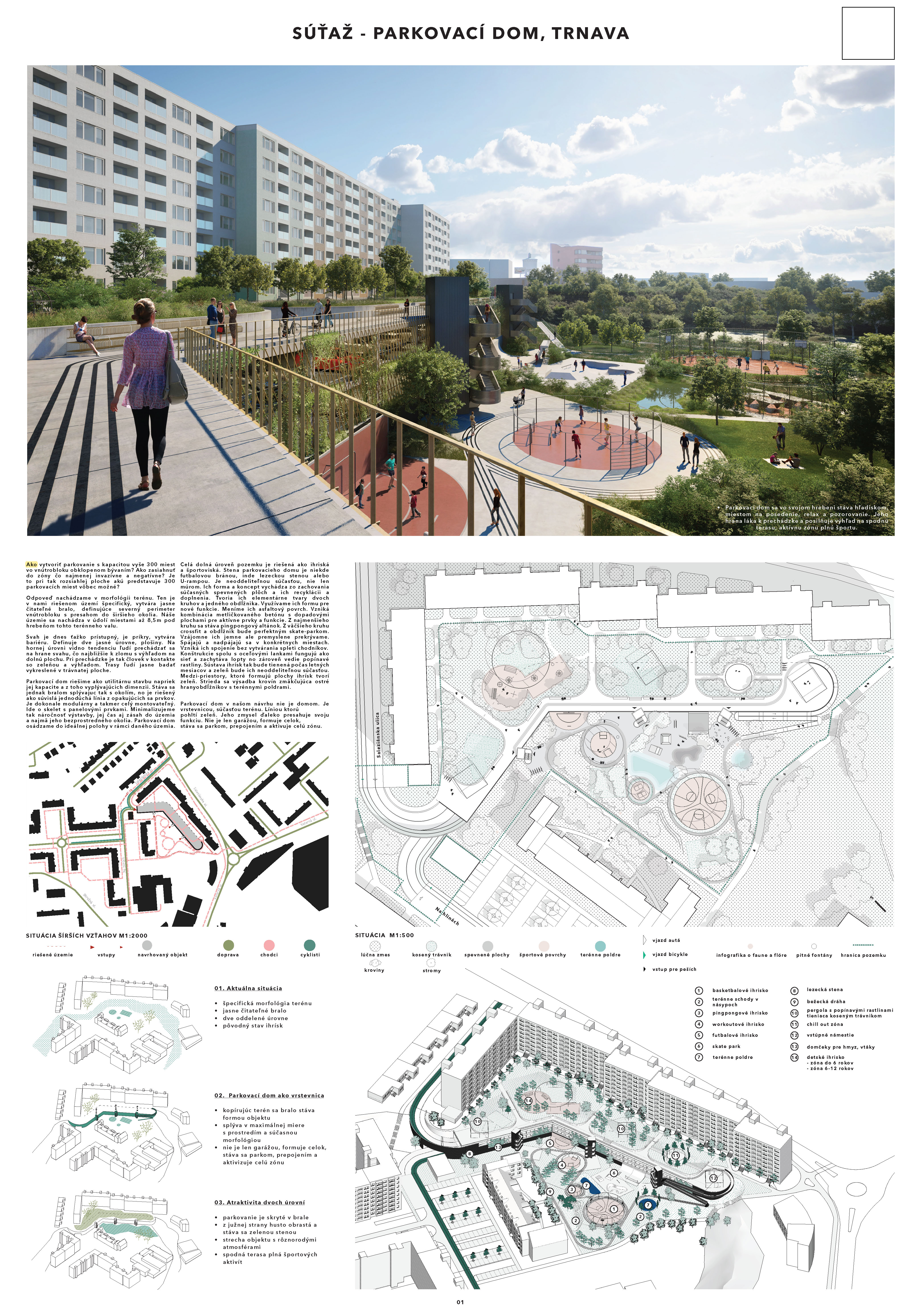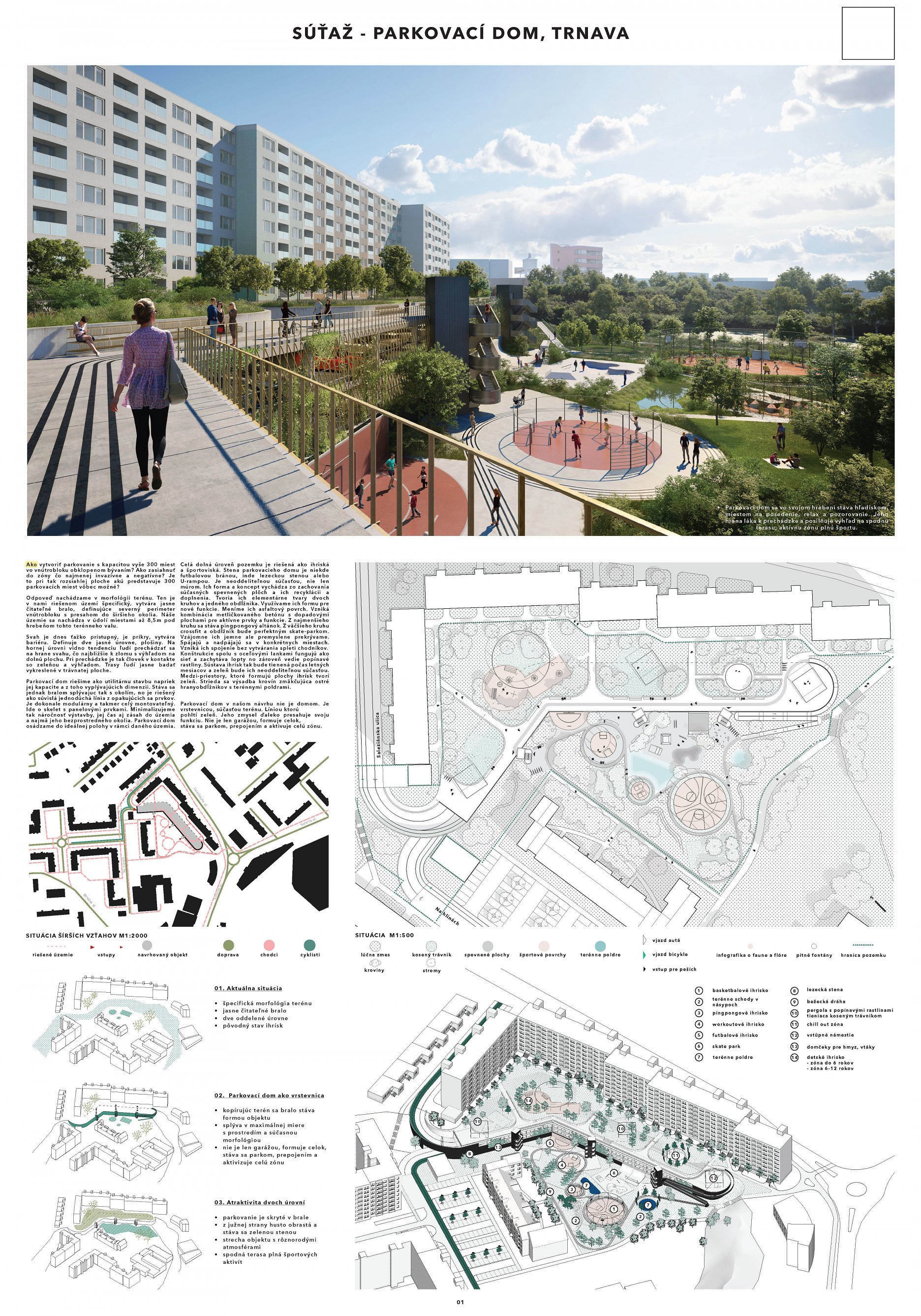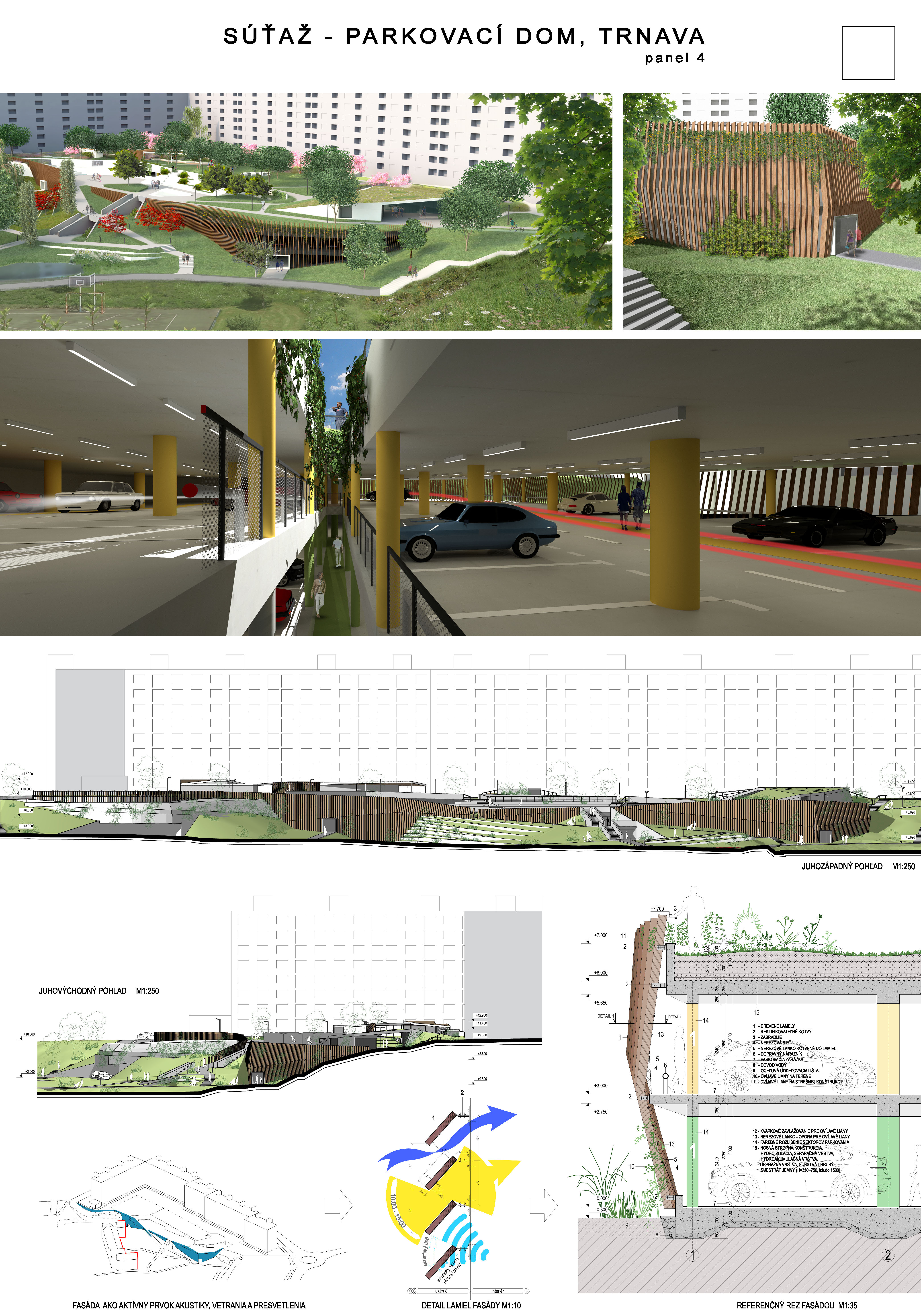 Návrh rieši predmetné územie vytvorením zalomeného parkovacieho domu s vizuálne akcentovanými lamelovými stenami. Kompozícia vytvára masívne schodisko ktoré pôsobí značne formálne. Otázne je pôdorysné riešenie, ktoré svojim tvarom vytvára hlučnú zónu v strede a je otázne z hľadiska ekonomickej efektívnosti - využitia priestoru v zalomených častiach. Využitie iba jedného prístupu zo Saleziánskej ulice obmedzuje možnosti alternatívneho dopravného napojenia a nie je v súlade s požiadavkami súťažných podmienok. Hmota objektu je pomerne výrazne akcentovaná v priestore vnútrobloku, čo vyvolá náročnosť z hľadiska ďalšej údržby a prevádzky. Akceptovať je možné usporiadanie priestoru nad parkoviskom a vytvorenie športovo oddychovej zóny.