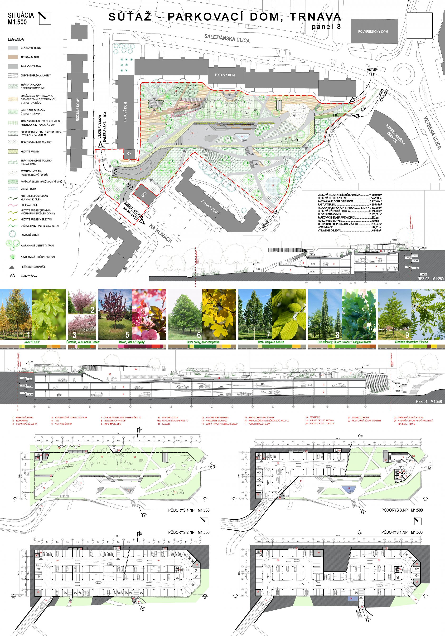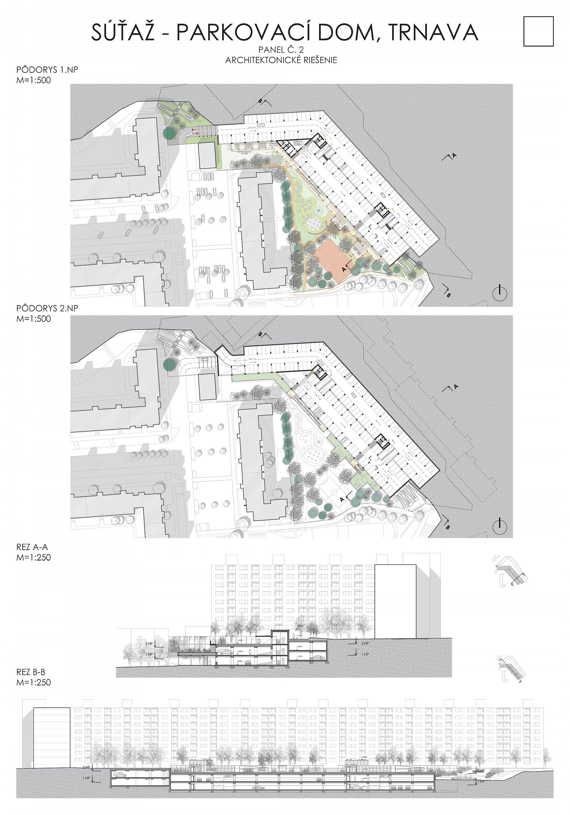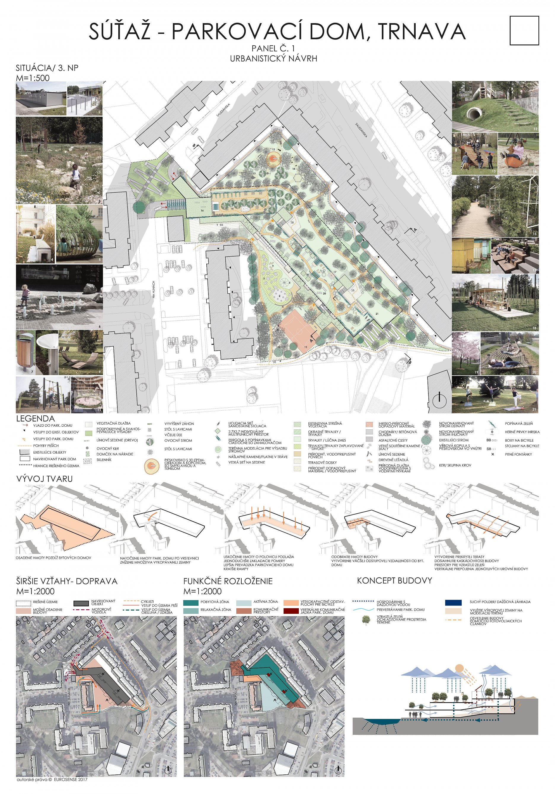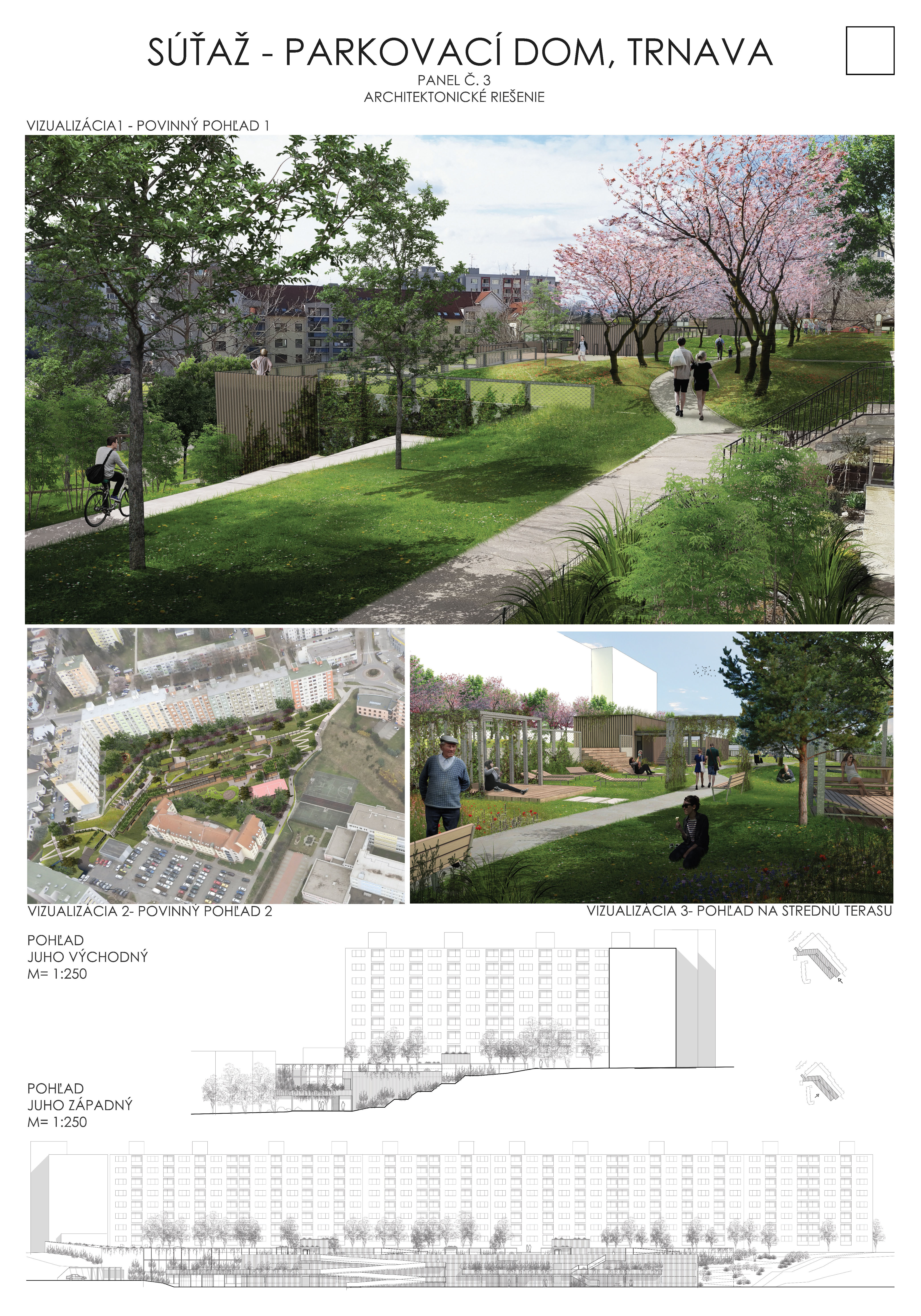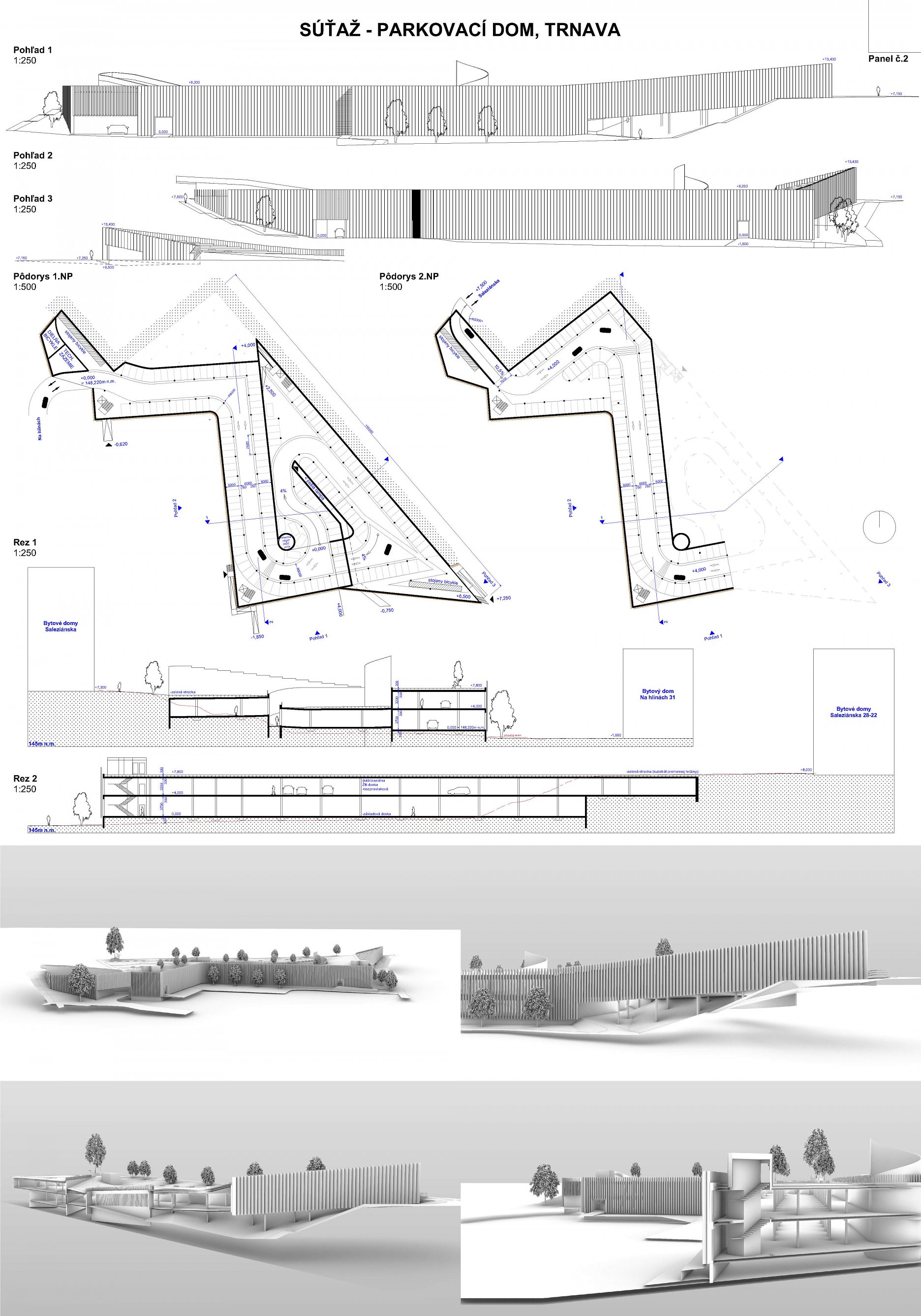 Návrh rieši predmetné územie vytvorením zalomeného parkovacieho domu s vizuálne akcentovanými lamelovými stenami. Kompozícia vytvára masívne schodisko ktoré pôsobí značne formálne. Otázne je pôdorysné riešenie, ktoré svojim tvarom vytvára hlučnú zónu v strede a je otázne z hľadiska ekonomickej efektívnosti - využitia priestoru v zalomených častiach. Využitie iba jedného prístupu zo Saleziánskej ulice obmedzuje možnosti alternatívneho dopravného napojenia a nie je v súlade s požiadavkami súťažných podmienok. Hmota objektu je pomerne výrazne akcentovaná v priestore vnútrobloku, čo vyvolá náročnosť z hľadiska ďalšej údržby a prevádzky. Akceptovať je možné usporiadanie priestoru nad parkoviskom a vytvorenie športovo oddychovej zóny.
