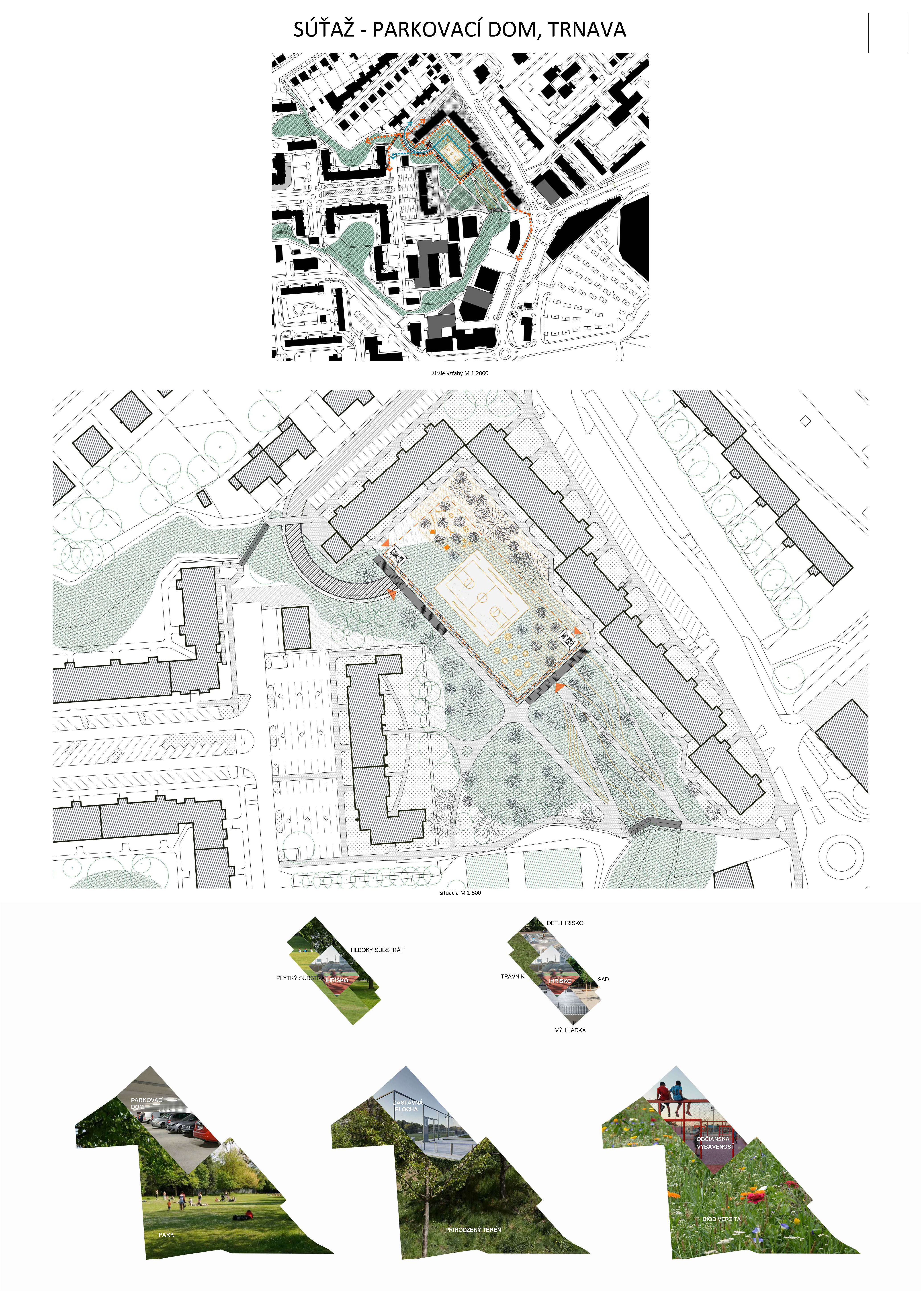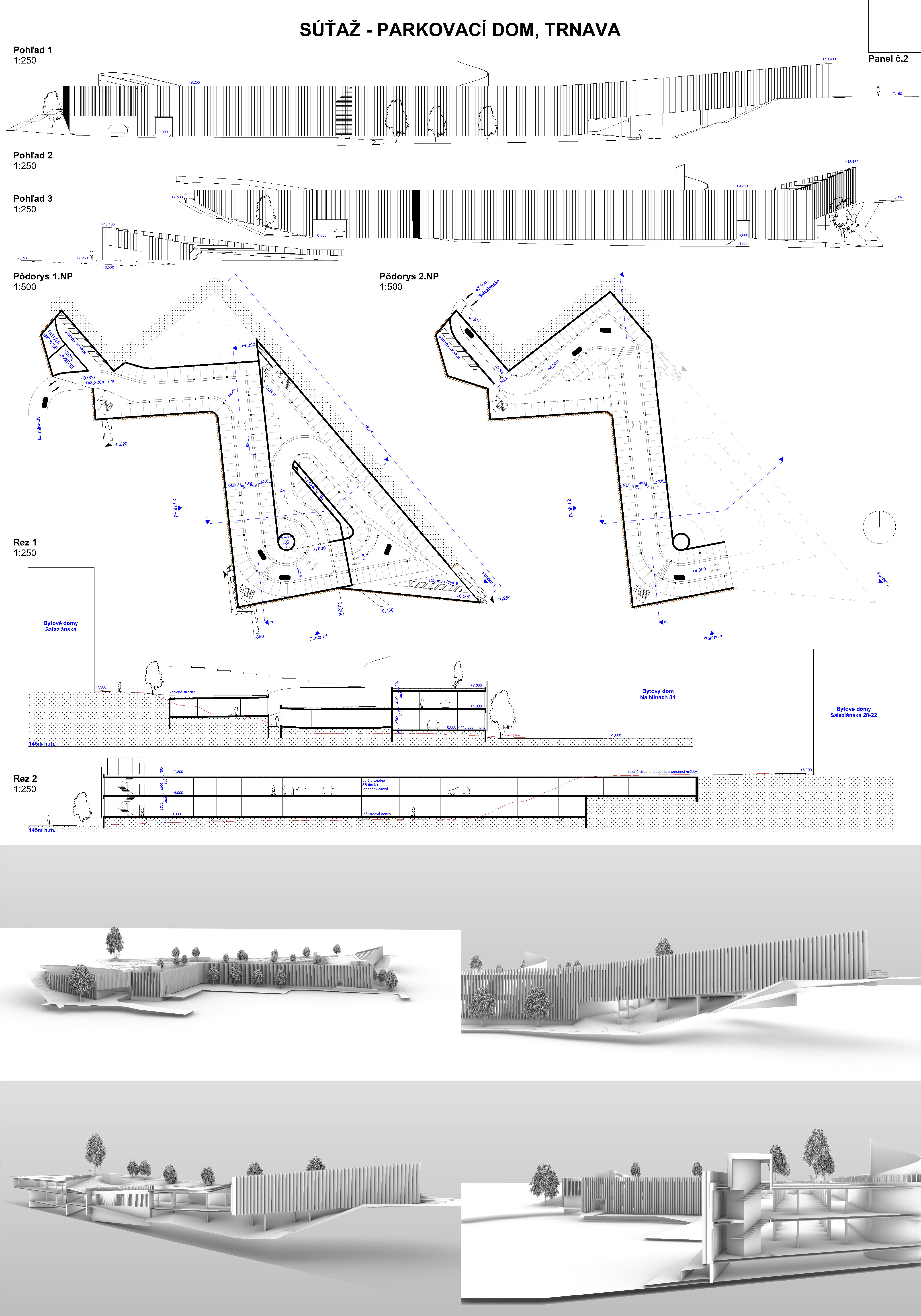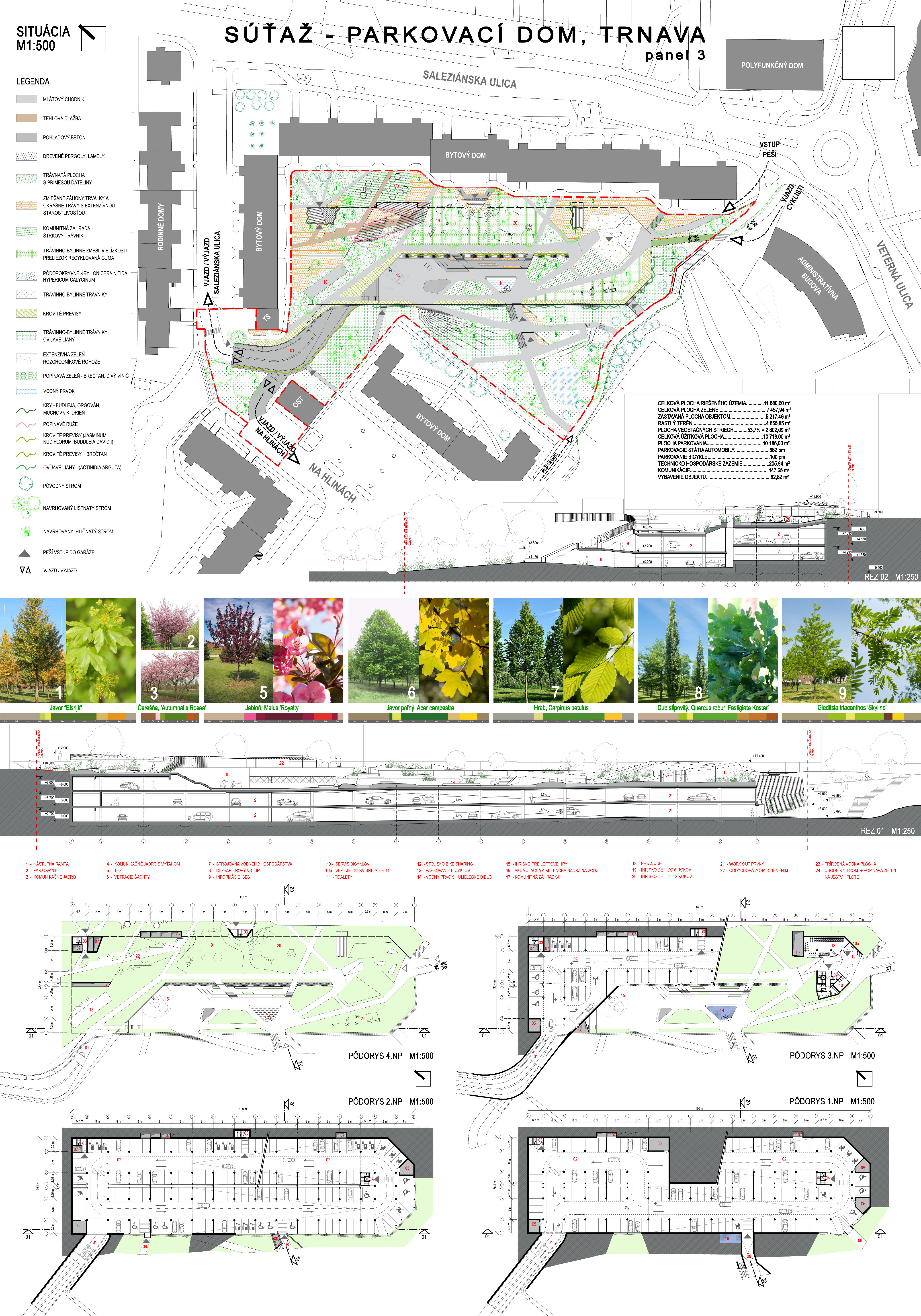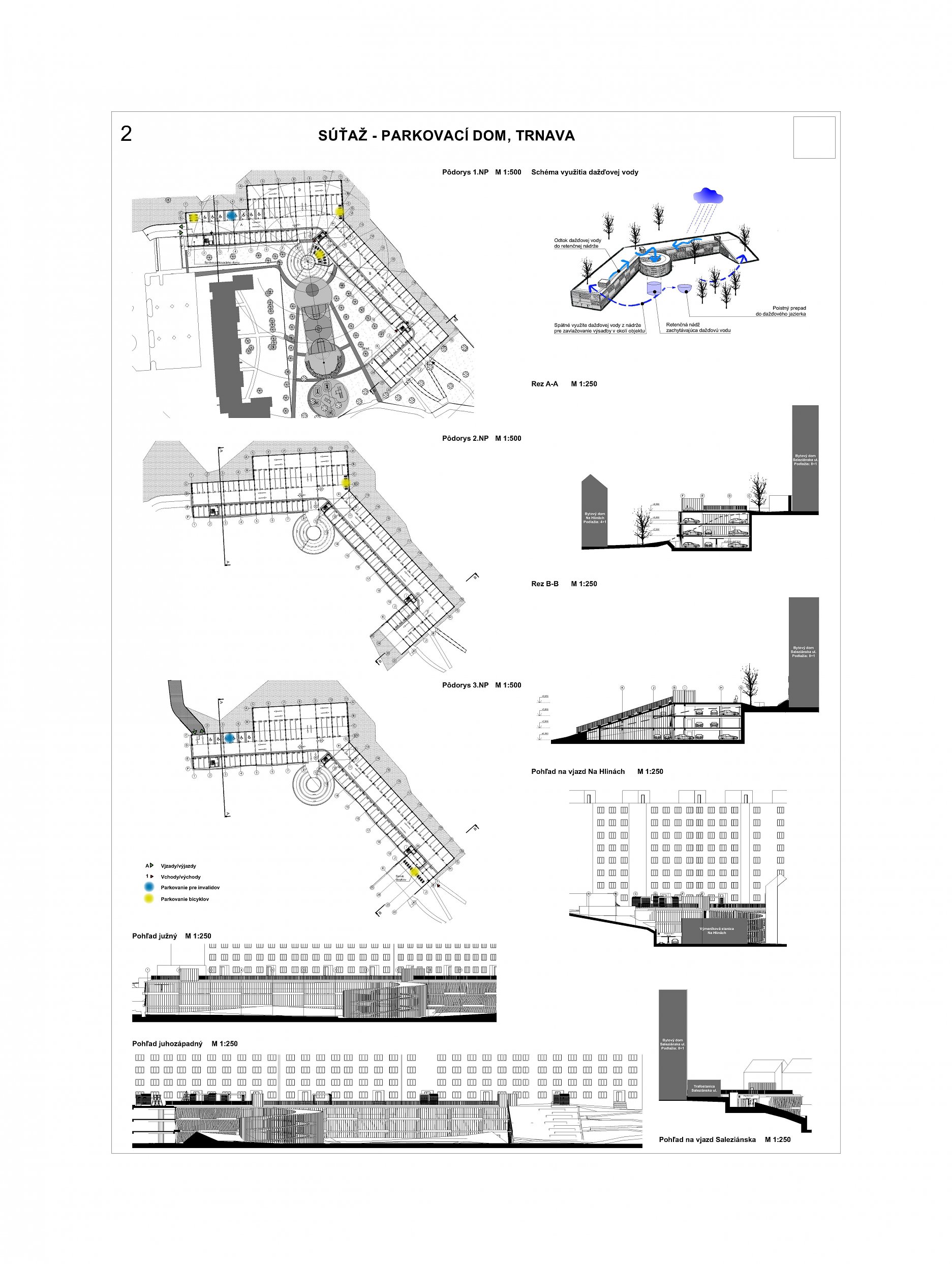 Návrh rieši predmetné územie vytvorením zalomeného parkovacieho domu s vizuálne akcentovanými lamelovými stenami. Kompozícia vytvára masívne schodisko ktoré pôsobí značne formálne. Otázne je pôdorysné riešenie, ktoré svojim tvarom vytvára hlučnú zónu v strede a je otázne z hľadiska ekonomickej efektívnosti - využitia priestoru v zalomených častiach. Využitie iba jedného prístupu zo Saleziánskej ulice obmedzuje možnosti alternatívneho dopravného napojenia a nie je v súlade s požiadavkami súťažných podmienok. Hmota objektu je pomerne výrazne akcentovaná v priestore vnútrobloku, čo vyvolá náročnosť z hľadiska ďalšej údržby a prevádzky. Akceptovať je možné usporiadanie priestoru nad parkoviskom a vytvorenie športovo oddychovej zóny.