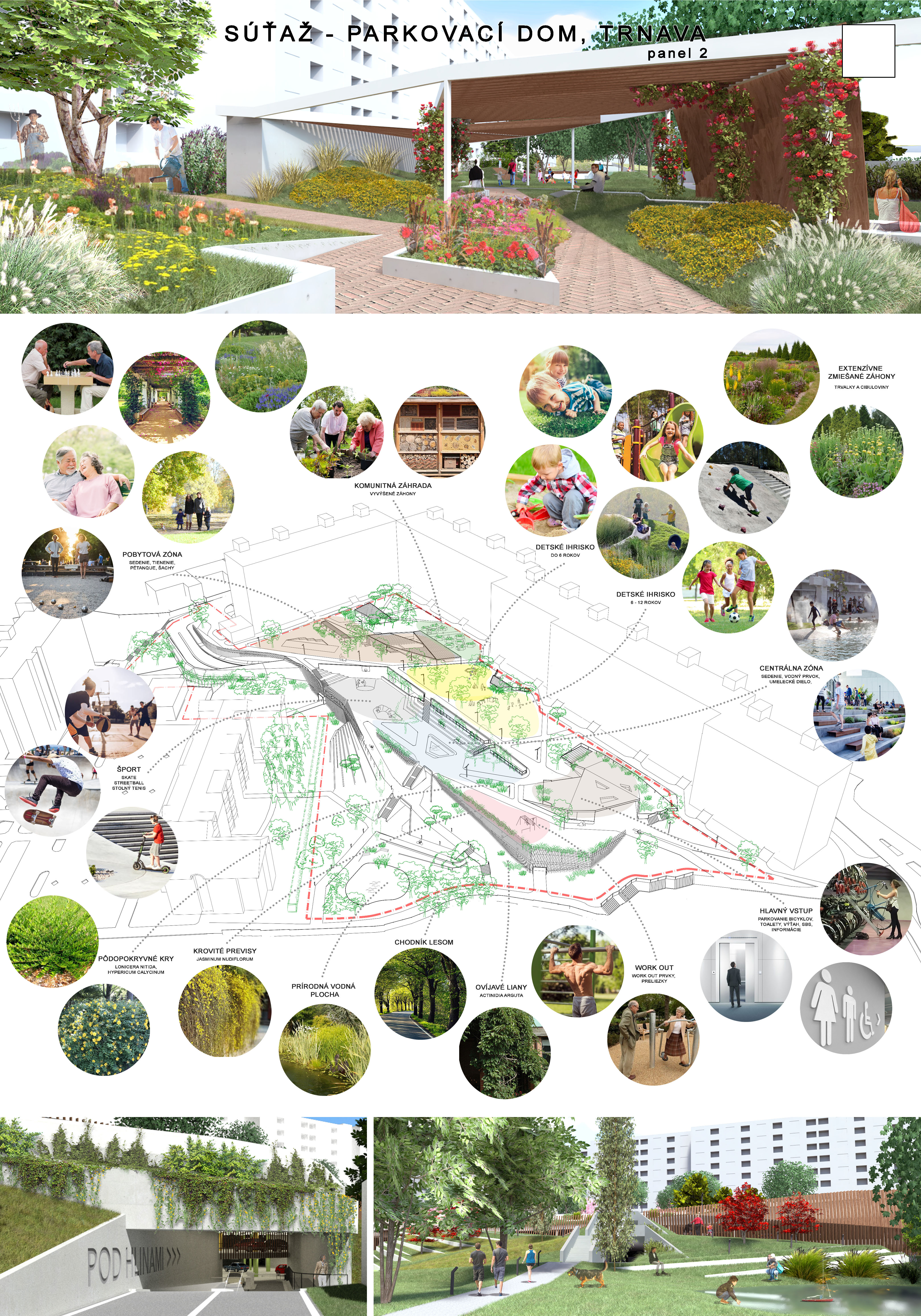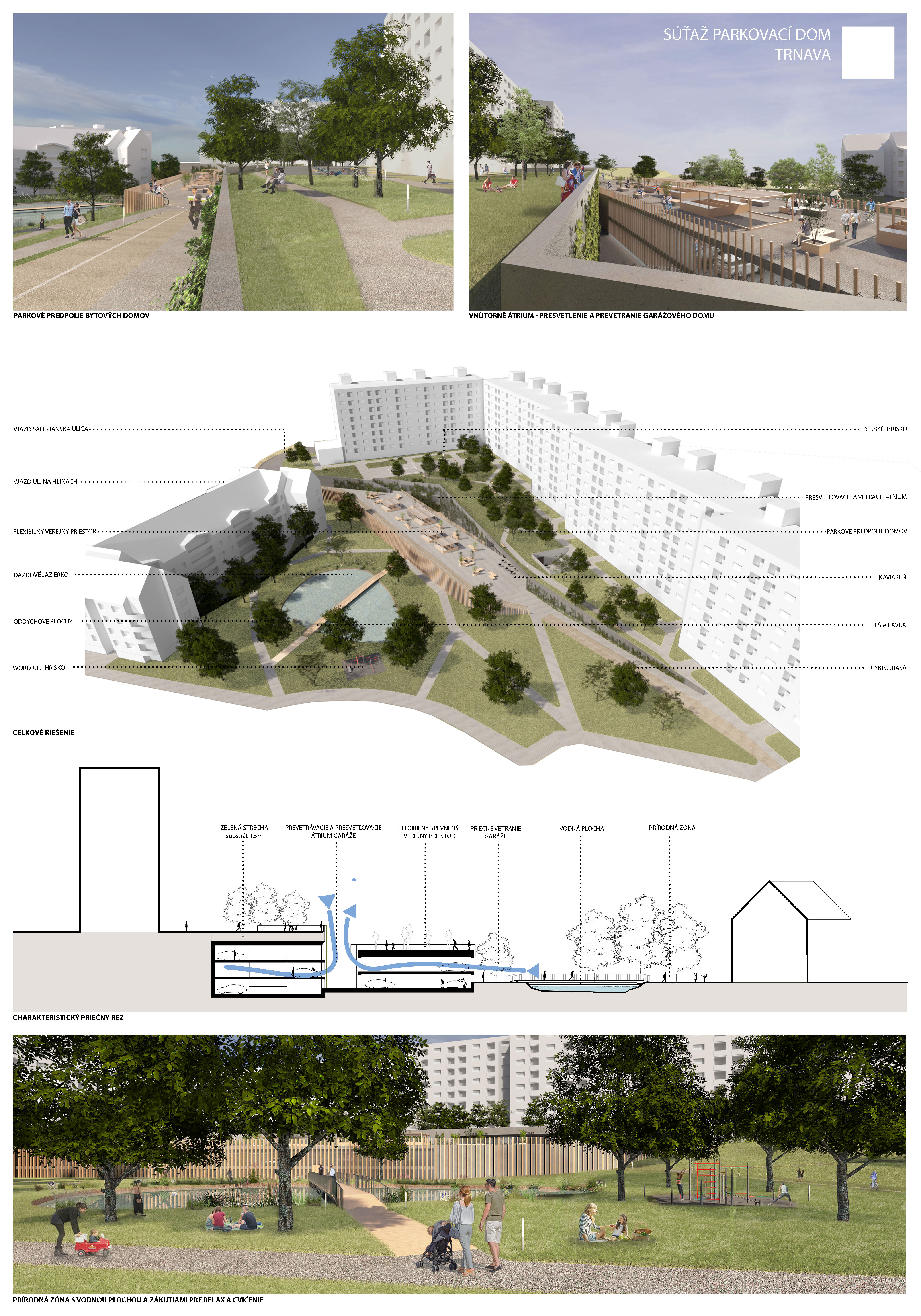 Súťažný návrh vytvára vo vnútrobloku priznaný objekt garáží, vhodne osadený vo vzťahu na existujúci terén. Vlastné pôsobenie objektu je však vzhľadom na pobytový vnútroblok masívne a príliš akcentuje barierové prepojenie dvoch výškových úrovní výraznými schodiskami. Z hľadiska dopadu stavby na kvalitu bývania v danej obytnej zóne nie je predložené riešenie vhodné, vzhľadom na vizuálny dopad, zvýšenie hlučnosti. Návrh do poloverejného priestoru vnútrobloku vnáša nevhodný prvok výraznej promenády pre širšiu verejnosť. Nevhodné je taktiež situovanie niektorých aktivít ako skateparku vzhľadom na hlučnosť a celomestský dosah, situovanie bežeckej trasy sa javí ako klišé.