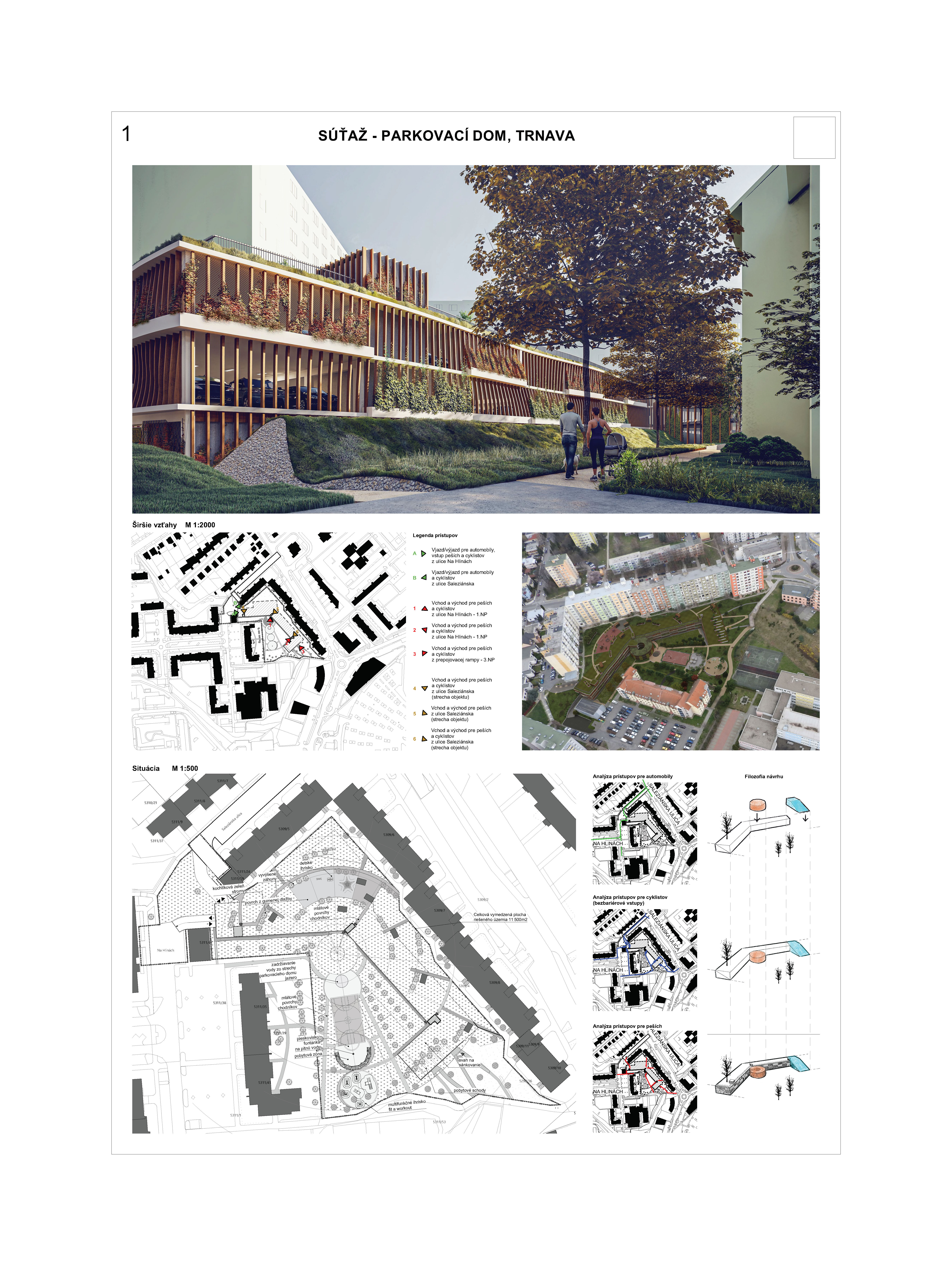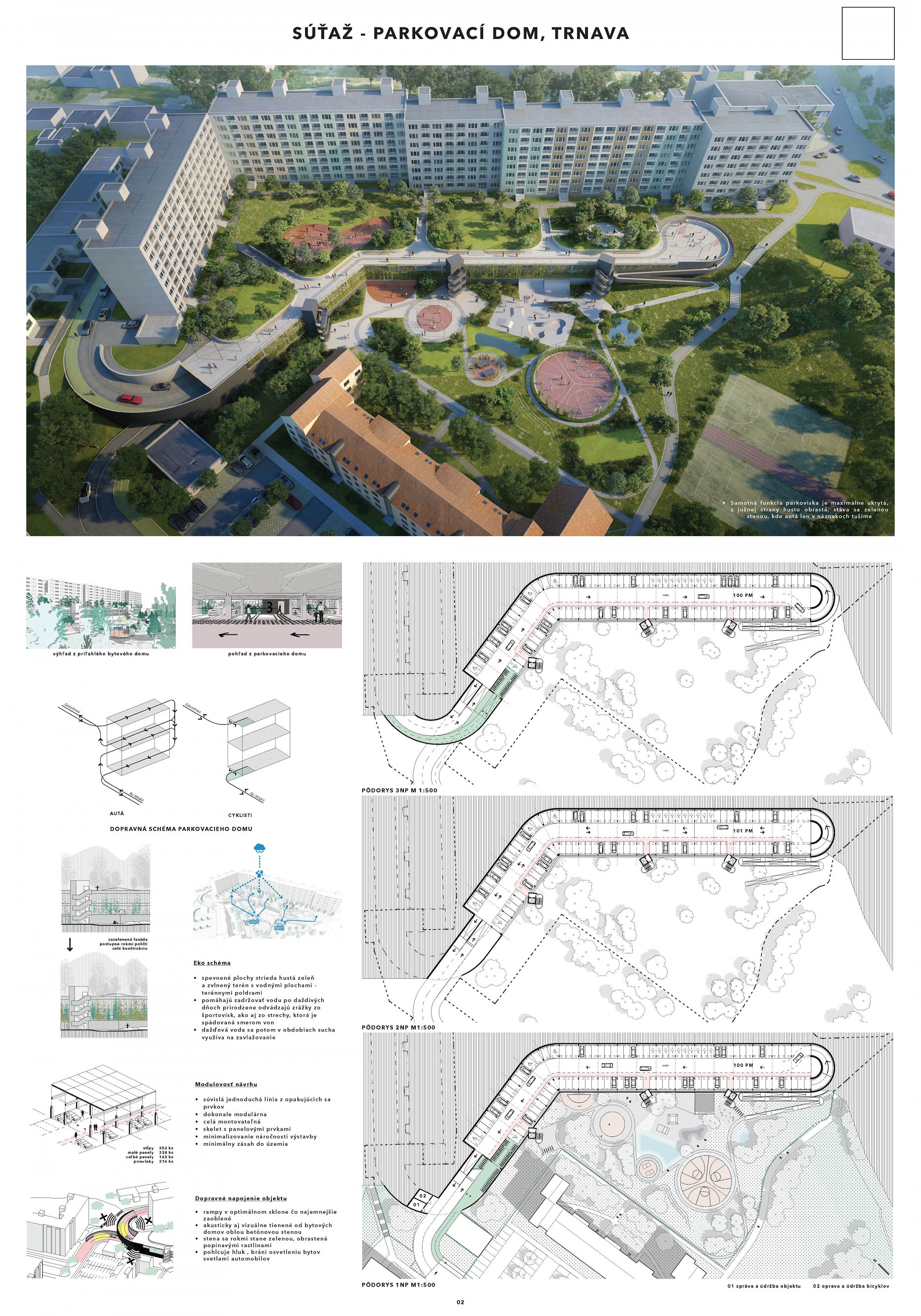 Súťažný návrh zaujímavo pracuje s osadením objektu parkovacieho domu v teréne. Porota oceňuje snahu o rozdelenie objektu do dvoch odskočených úrovní, čím sa znižuje negatívny dopad fasád na okolie a zvyšuje kvalita bývania v danej lokalite. Objekt nepôsobí rušivo, z hľadiska architektonického a ekonomického je posudzovaný kladne. Rovnako kladne je posudzovaná aj cyklotrasa, navrhovaný vodný objekt a práca s dažďovou vodou. Negatíva návrhu, ktoré znemožnili jeho umiestnenie na oceňovaných pozíciach sú technického a funkčného charakteru. V rámci riešenia parkovania je to vytvorenie aj slepej ulice na 1. podlaží, parkovacie státia bez možnosti variability – diskomfort pre užívateľov. Navrhovaná polyfunkcia a priľahlá veľmi masívna spevnená plocha s charakterom promenády, ihrisko priamo pod oknami bytového domu sú považované za rušivé, obmedzujúce komfort obyvateľov vnútrobloku.