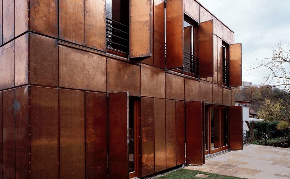 Meď - v priebehu niekoľkých dní v kontakte s atmosférou začne povrch oxidovať a meniť svoju farbu na gaštanovo hnedú. Fasáda v priebehu niekoľkých rokov postupne tmavne a neskôr sa mení na typickú zelenú patinu.