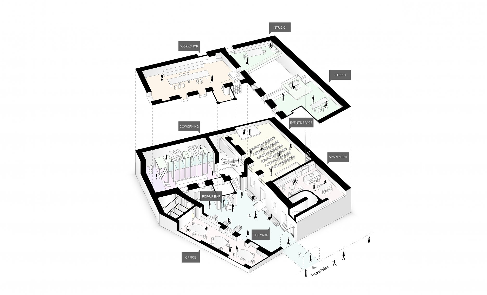 Dynamické pracovné prostredie sa rozvíja na štyroch poschodiach objektu, ktorý je poslednou zachovanou stavbou liehovarského komplexu. Ľahké deliace konštrukcie (z velkej časti recyklované z predchádzajúcich realizácií ateliéru) vložené do pôvodnej stavebnej obálky reagujú na požiadavku flexibilného využita priestoru.
