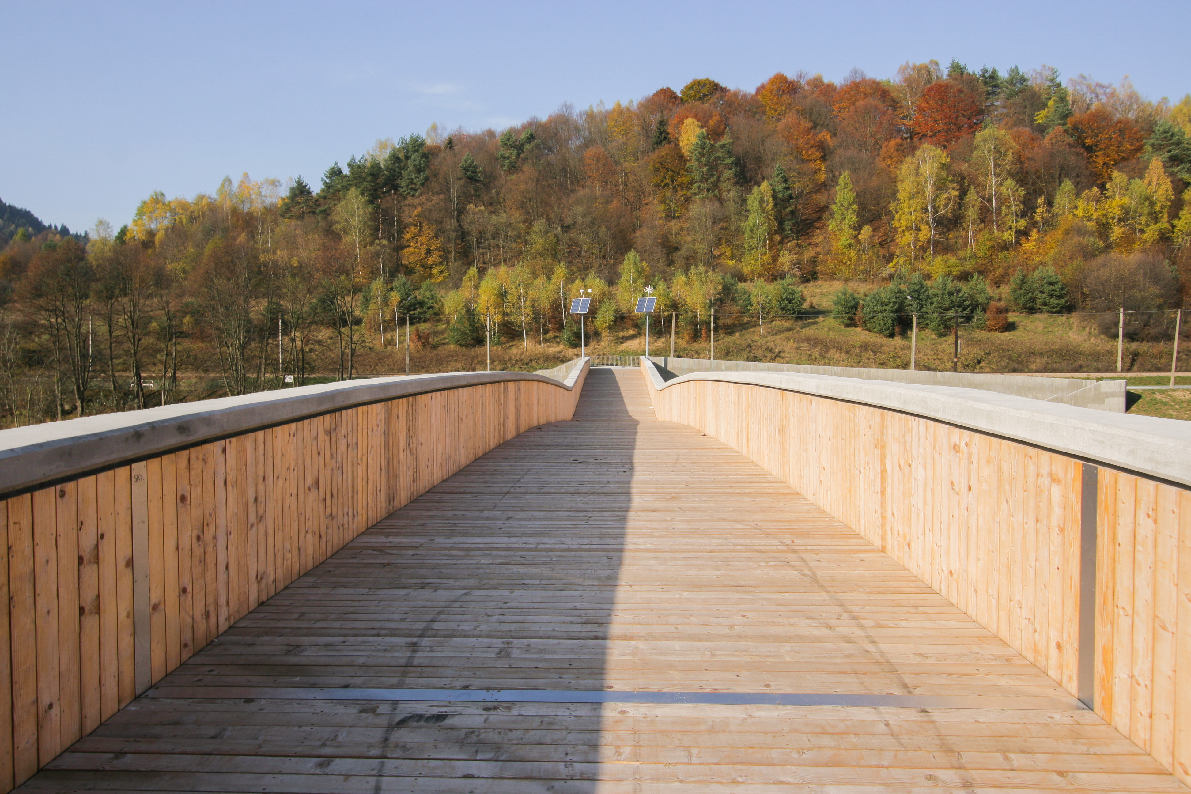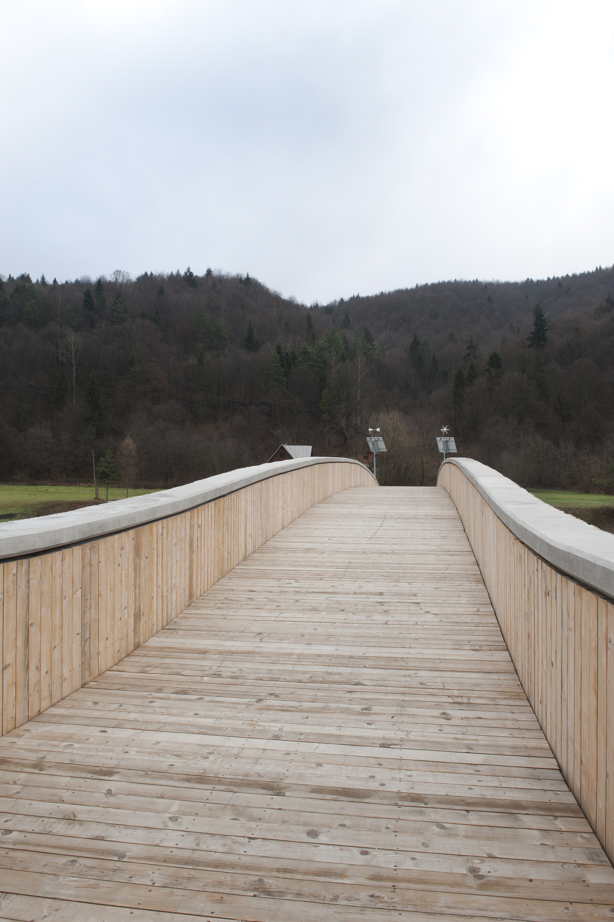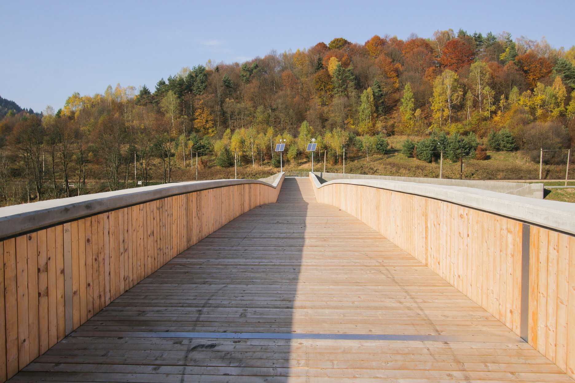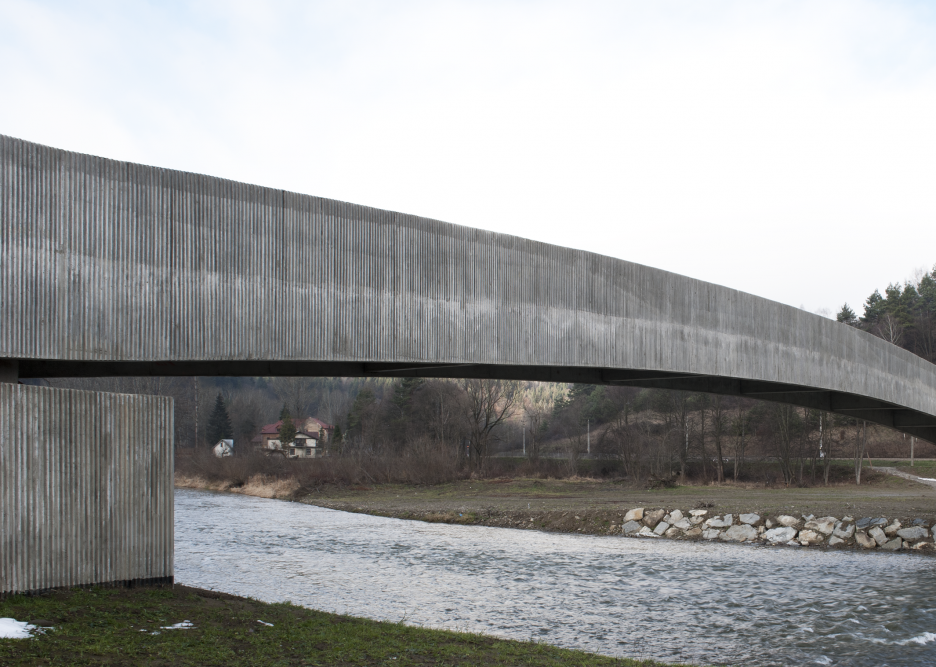 Výtvarný a materiálový koncept je založený na princípe kontrastu. Prekrásne, ale súčasne „drsné“ prírodné prostredie determinuje náš spôsob nazerania na výtvarnú a materiálovú stránku projektu. Kedysi sa mosty stavali z kameňa, dnes je pre nás kameňom pohľadový železobetón. Tento pohľadový železobetón  jeho surovosť a  prirodzená farba vystupuje kontraste so zelenou farbou letného lesa. Na pozadí pestrofarebnej jesennej scenérie tento materiál pôsobí  odlišne a v zime sa miera kontrastu voči okoliu skoro úplne potlačí. Surovosť pohľadového betónu na vonkajšom opláštení mosta je vyvážená množstvom prírodného dreva tvoriaceho jeho vnútorný plášť. Práve s týmto prírodným materiálom je konfrontovaný prechádzajúci človek.