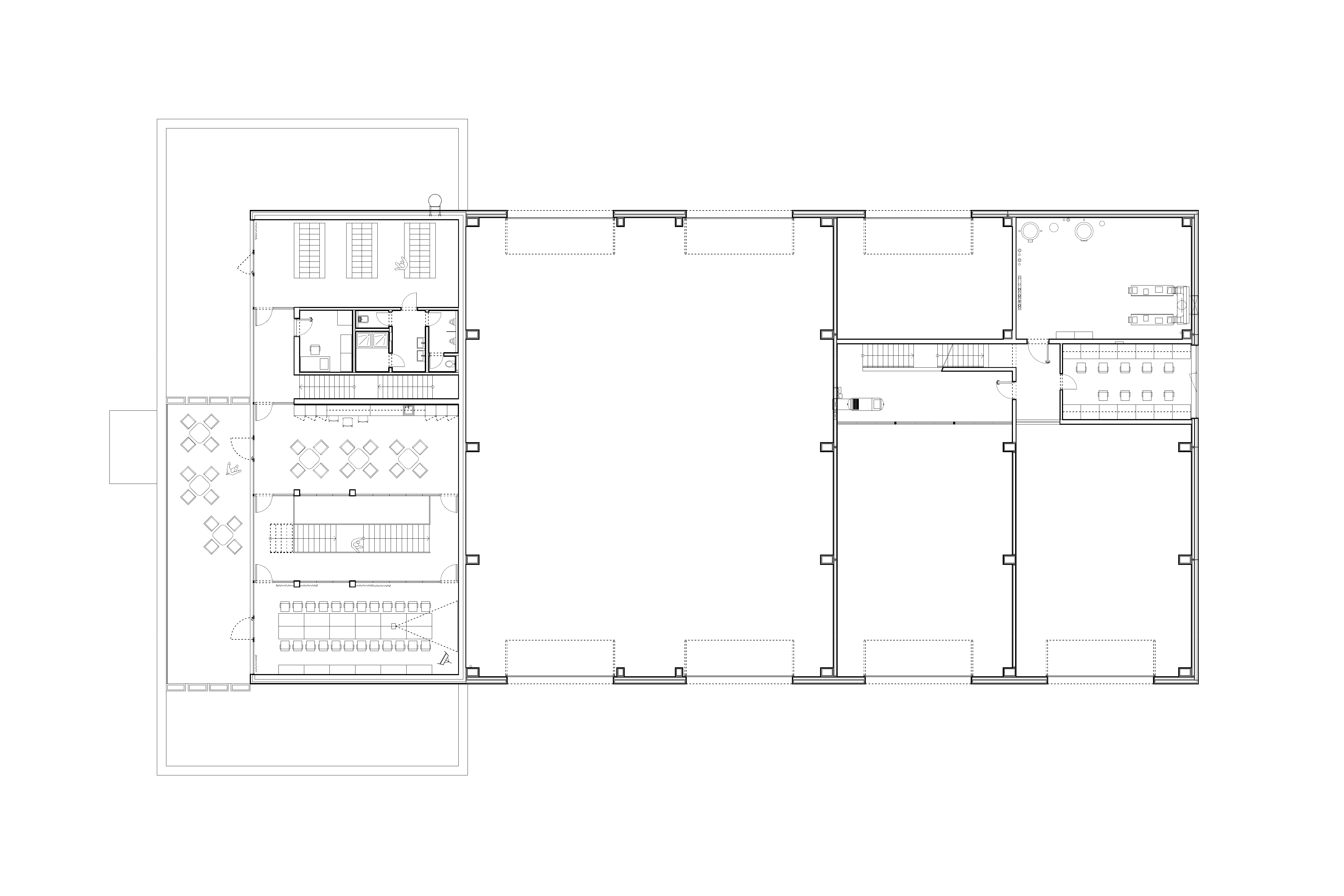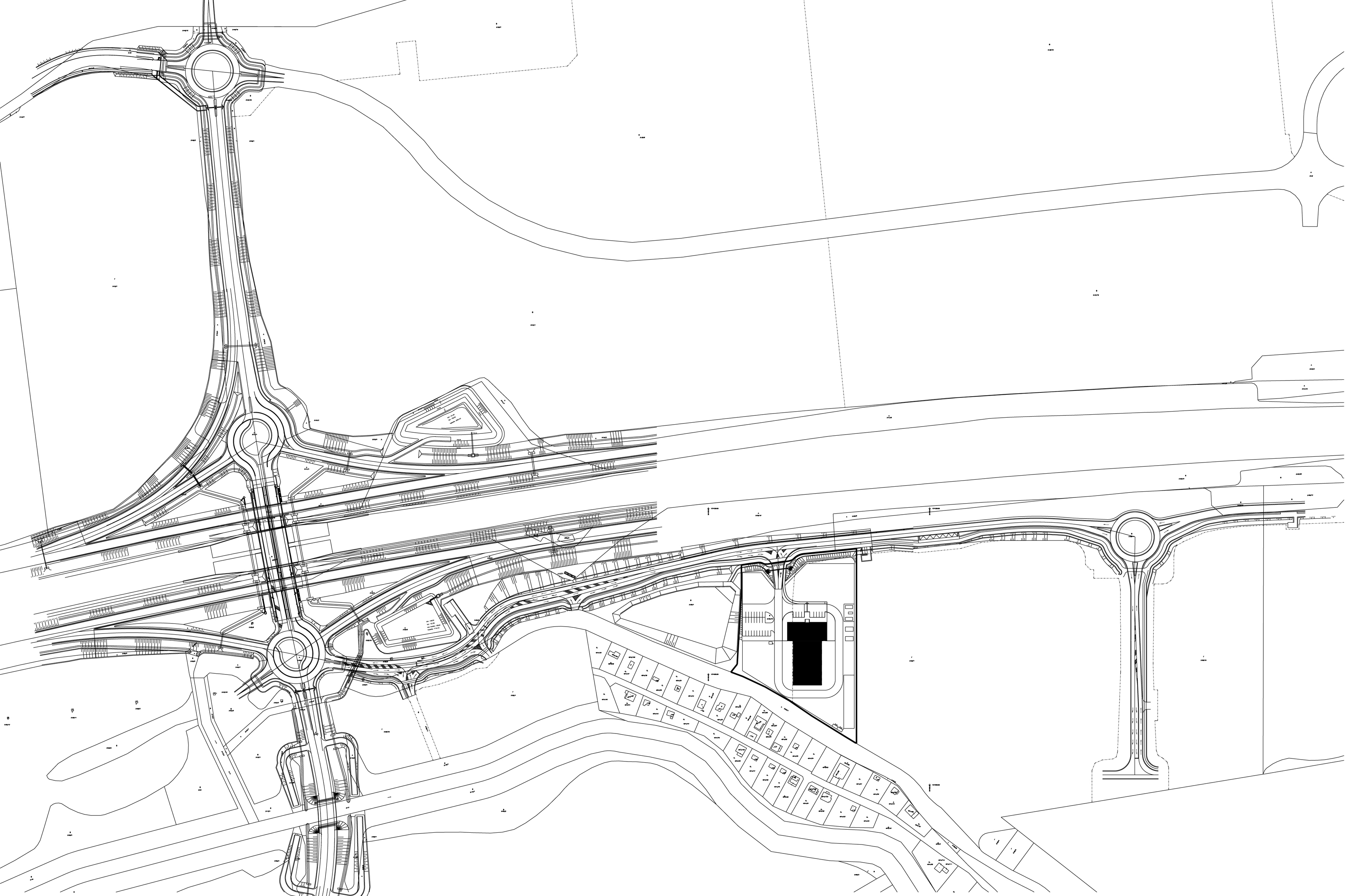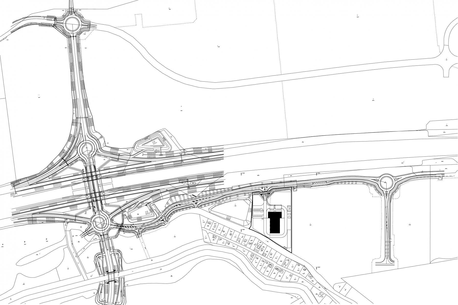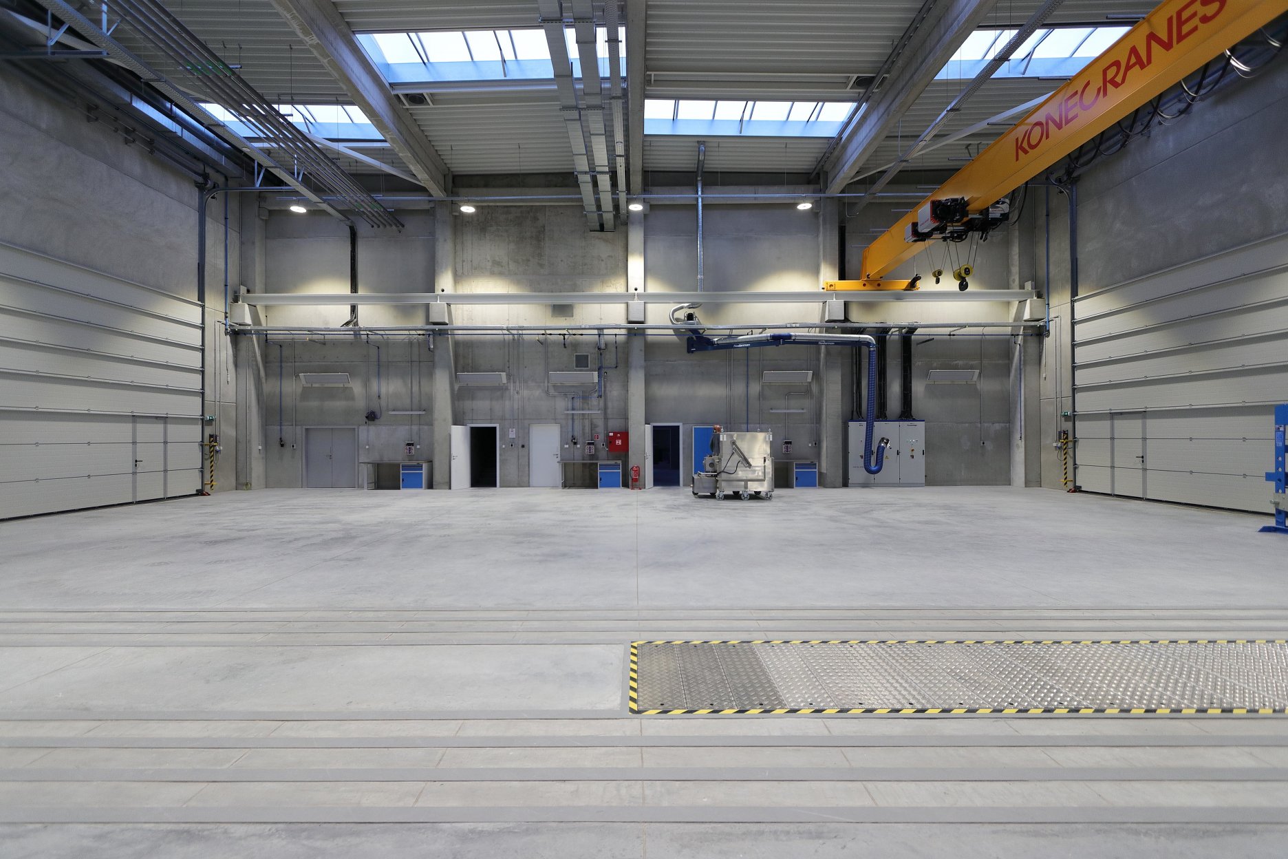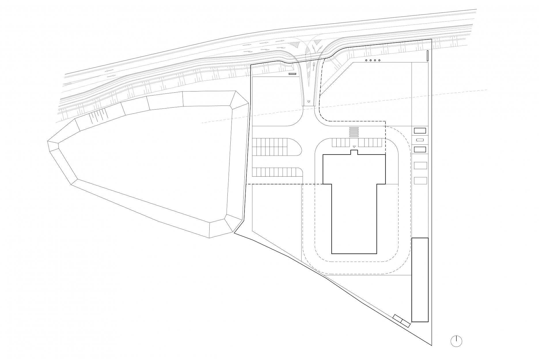 Za líniou prezentovaných strojov je centrálne umiestnená hlavná prevádzková budova s čelnou administratívno-skladovou časťou a obojstranne prejazdným dielenským traktom. Okolo hlavnej prevádzky plynie manipulačný priestor a trasa vnútornej obslužnej komunikácie. Areál je dopravne zokruhovaný.
