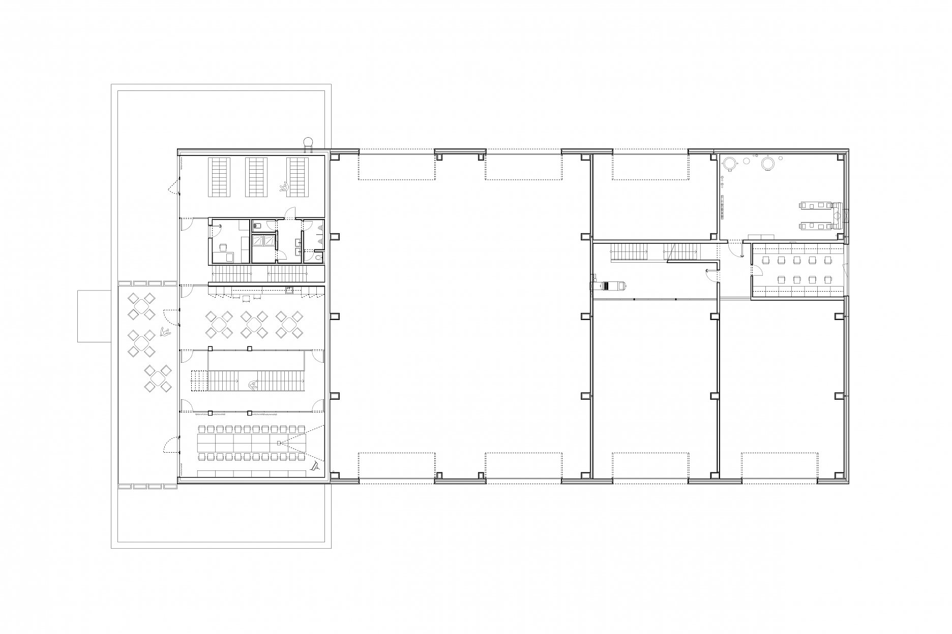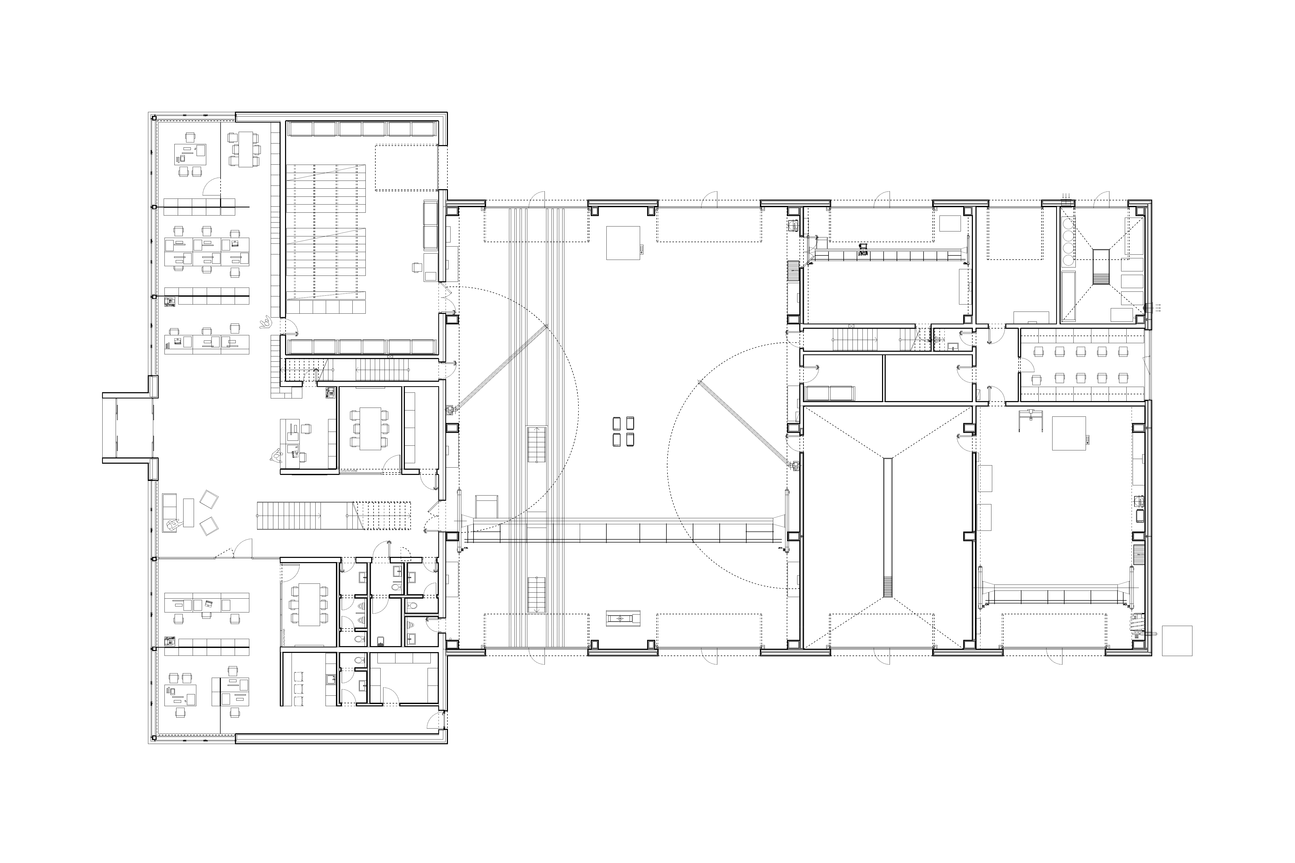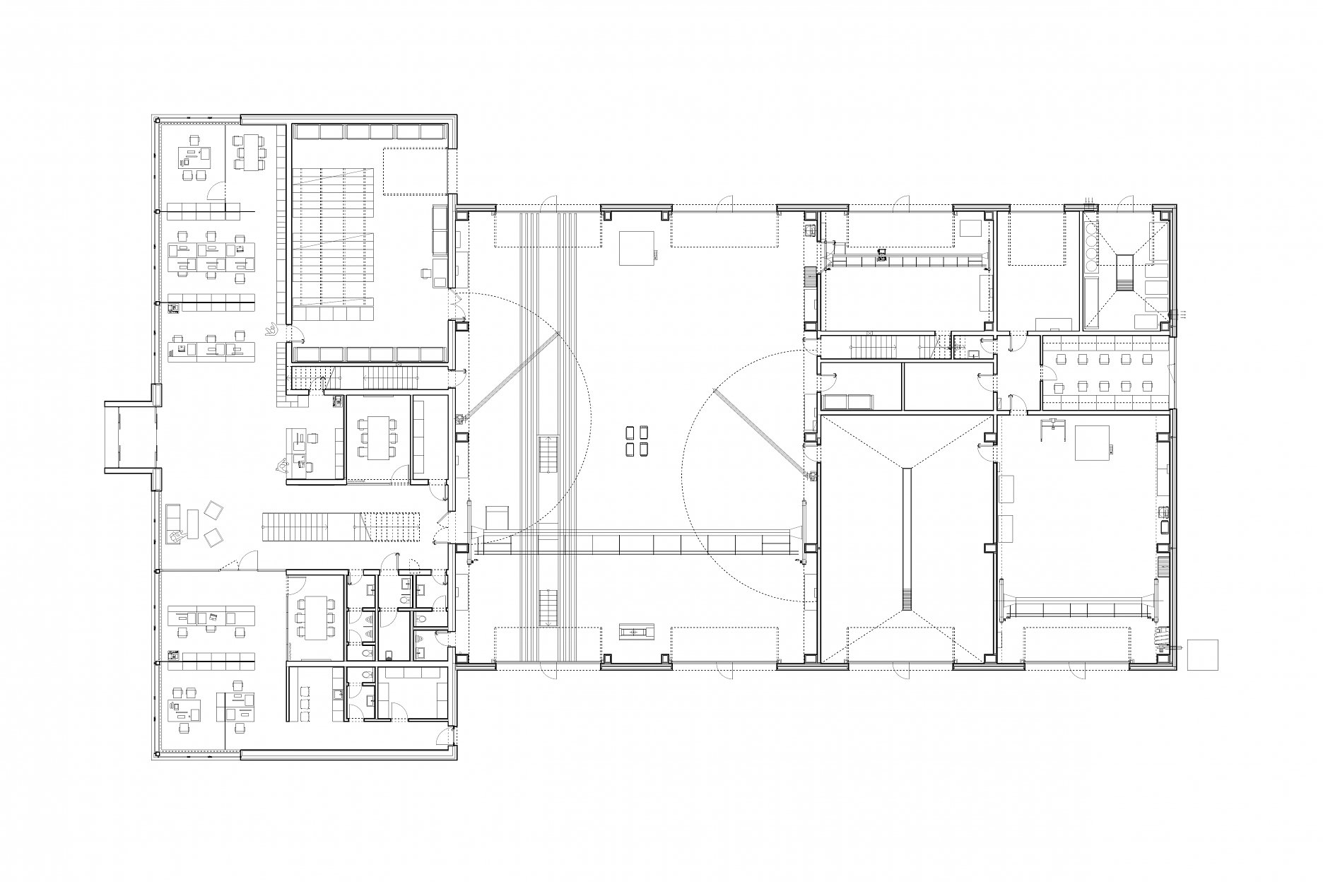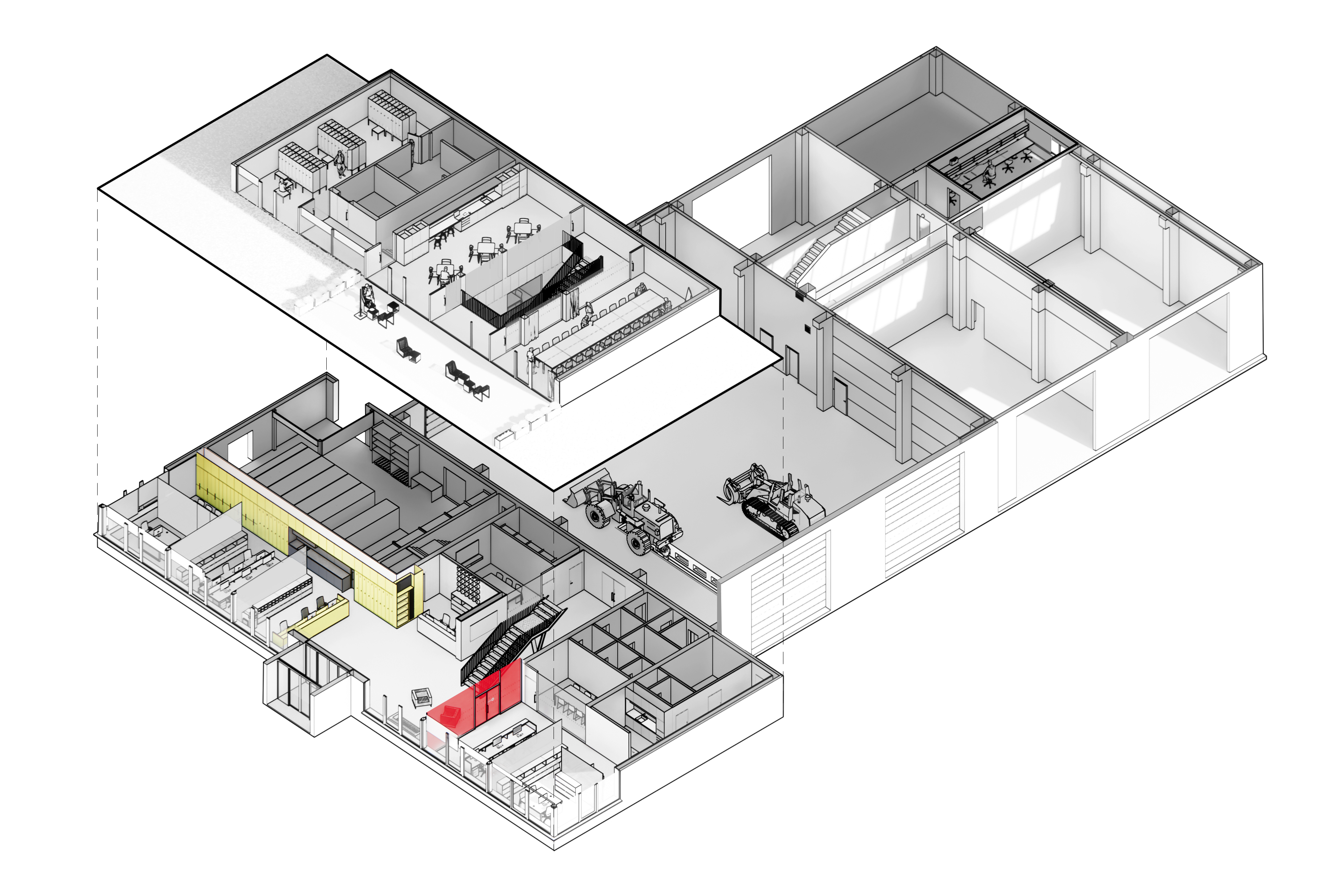 Pri vjazde do areálu, hneď vedľa parkoviska zákazníkov, je dvojpodlažná administratívna časť budovy, s kontaktnými klientskými pracoviskami. Sklad náhradných dielov je vložený medzi dielenskú a administratívnu časť zámerne. Náhradné diely sú distribuované dvoma smermi, do servisných boxov a tiež do priestoru administratívnej budovy - ku klientským pracoviskám predaja náhradných dielov. Centrom dispozície hlavnej prevádzkovej budovy je priestor haly prvého kontaktu. Z nej si návštevník volí cestu priamo ku klientskym pracoviskám servisu a predaja náhradných dielov, alebo do samostatnej prevádzky požičovne stavebných strojov. Za pracoviskami klientskej zóny (front-office) sú lineárne umiestnené ostatné administratívne pracoviská (back-office), vrátane zasadacích miestností, čajových kuchyniek a hygienického zázemia. Uprostred objektu je architektonicky výrazná schodisková hala so strešným svetlíkom a galériou. Poschodie hlavnej budovy obsahuje veľkú zasadaciu miestnosť, kuchynku s jedálňou a veľkou strešnou pobytovou terasou. Na poschodí je dôsledne oddelené hygienické zázemie a šatňa zamestnancov servisu, s vlastným prístupovým schodiskom v smere od servisných boxov.