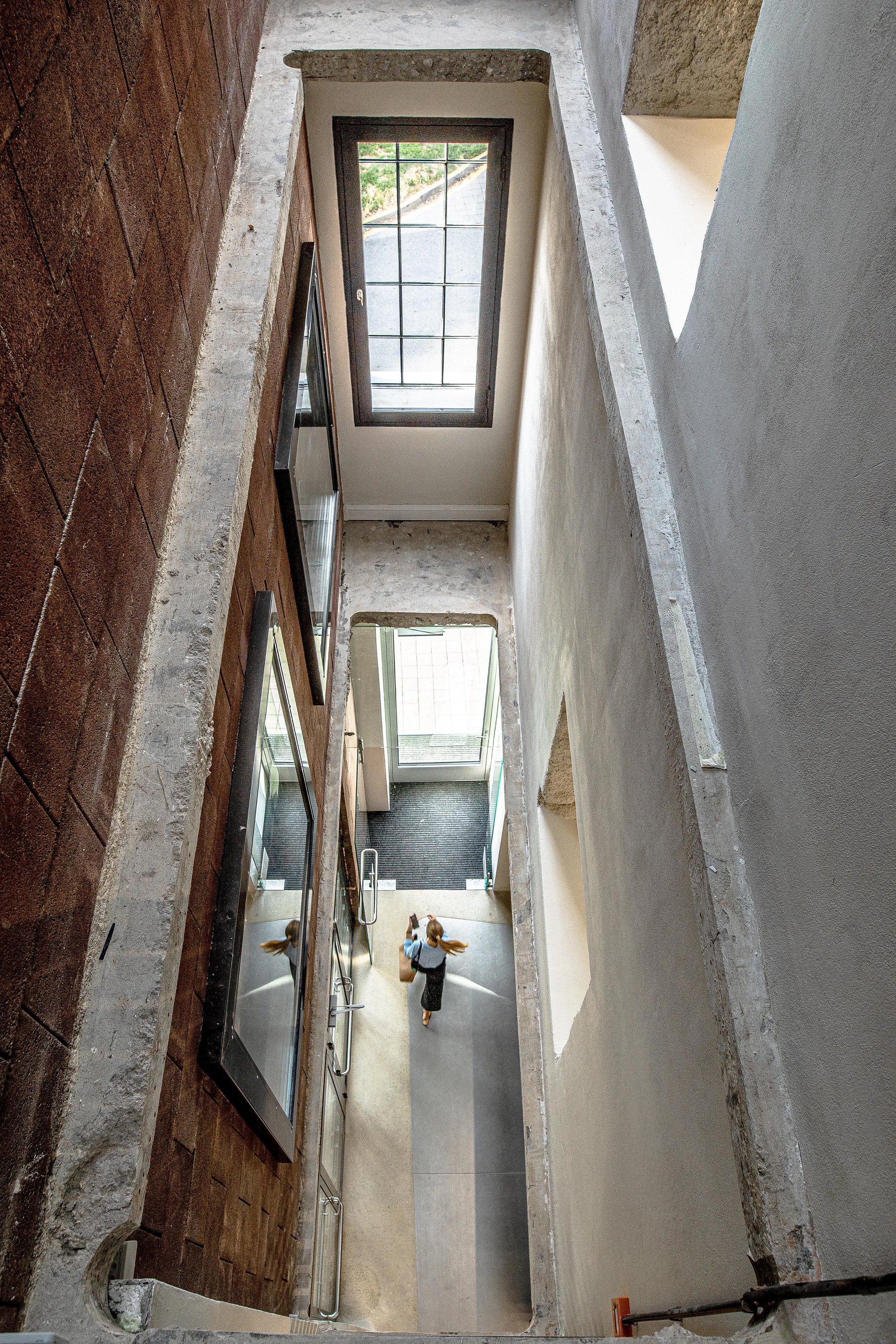 Do budovy vstupujeme přes původní schodišťový trakt, který je akcentován rizalitem na fasádě. Minimální foyer je podpořený výše zmíněným nově probouraným světlíkem přes výšku celé budovy. A láká nahoru do vyšších pater.