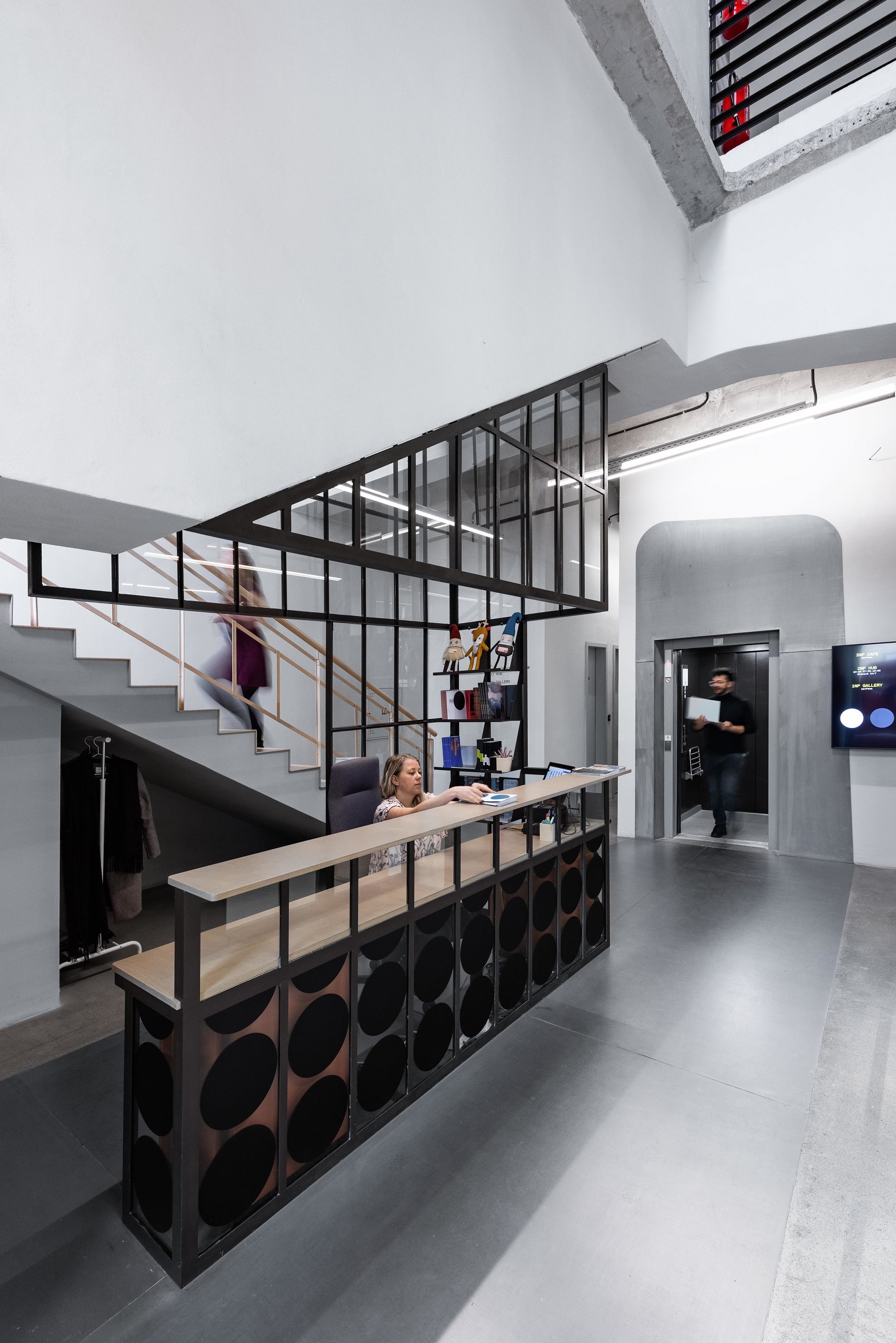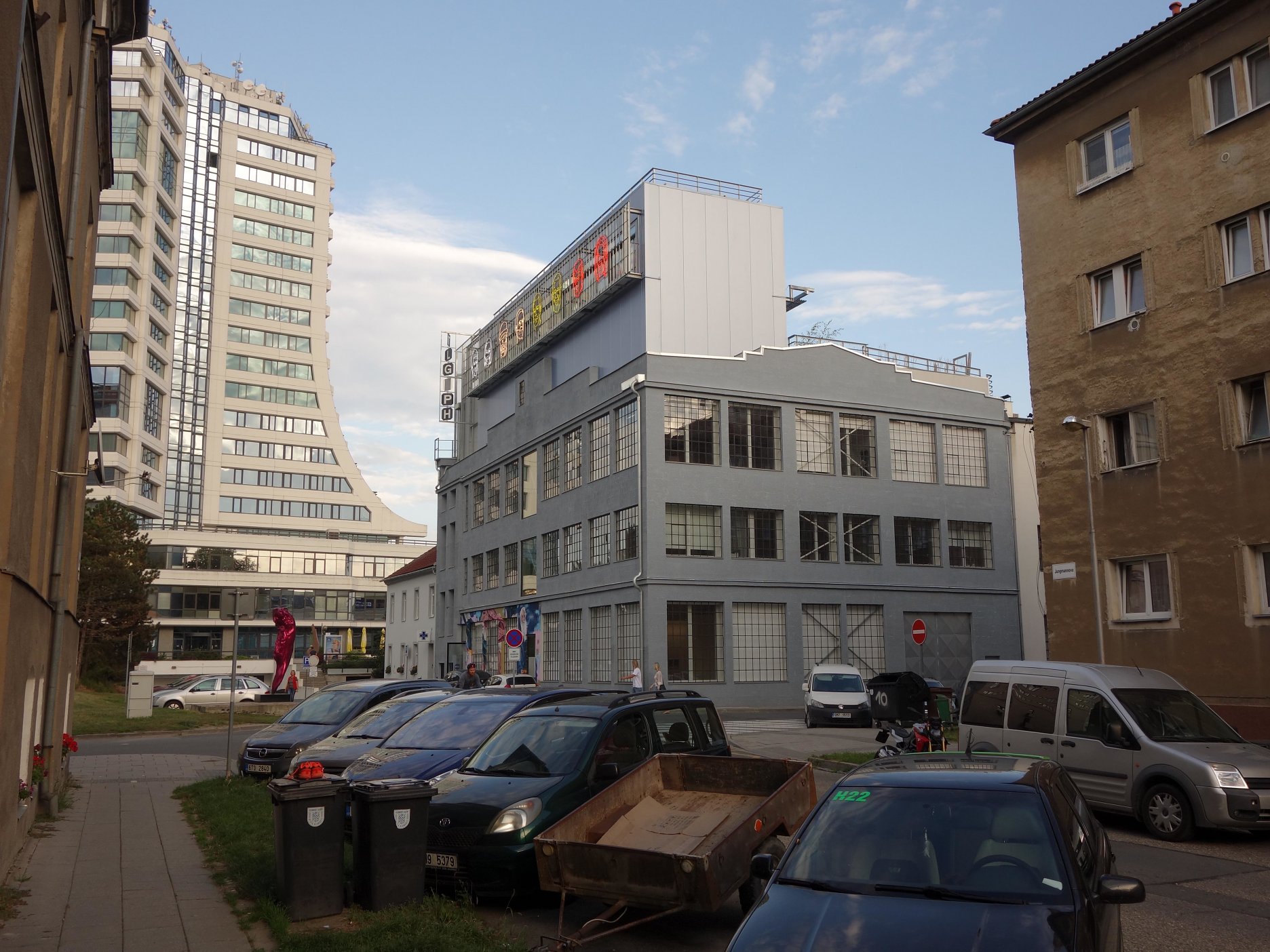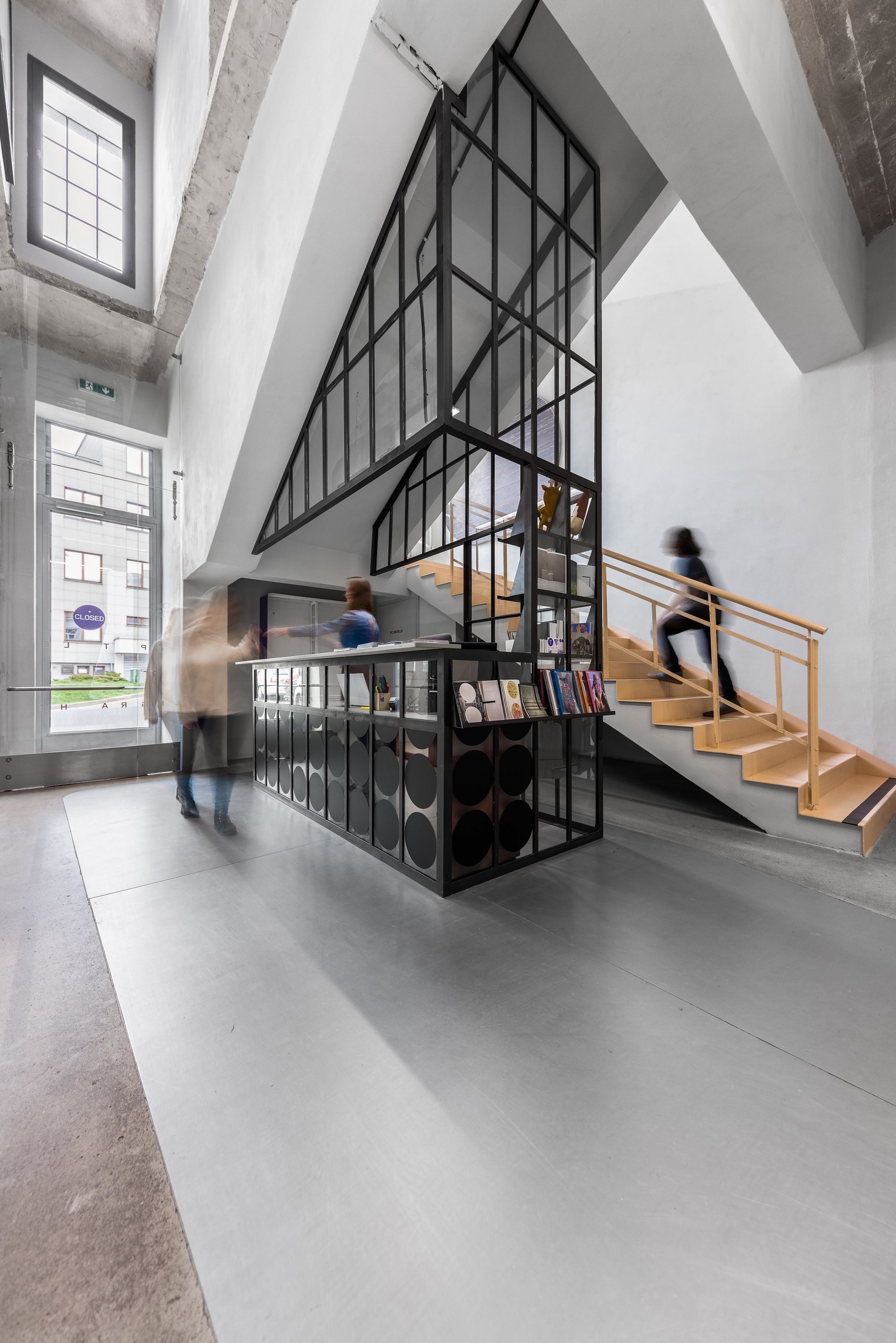 Adaptace skeletové budovy pro nový program nebyla jednoduchá – program byl větší než budova, nepodařilo se koupit vedlejší malý dům a zároveň nebylo možné překročit počet modulů určených pro galerii. Původní objekt je zvenku památkářsky zachován. Etážová výroba – to jsou schodiště a podlaží – původní princip. Komprimovali jsme zázemí do jednoho a půl modulu. Přesunuli jsme výtah a ke schodišti přibyl světlík v půlmodulu. Do domu je vložena stěna „žiletka“ z červených těžkých akustických cihel. Ta je viditelná, neomítnutá, ta odděluje schodiště a nový provoz na patrech.