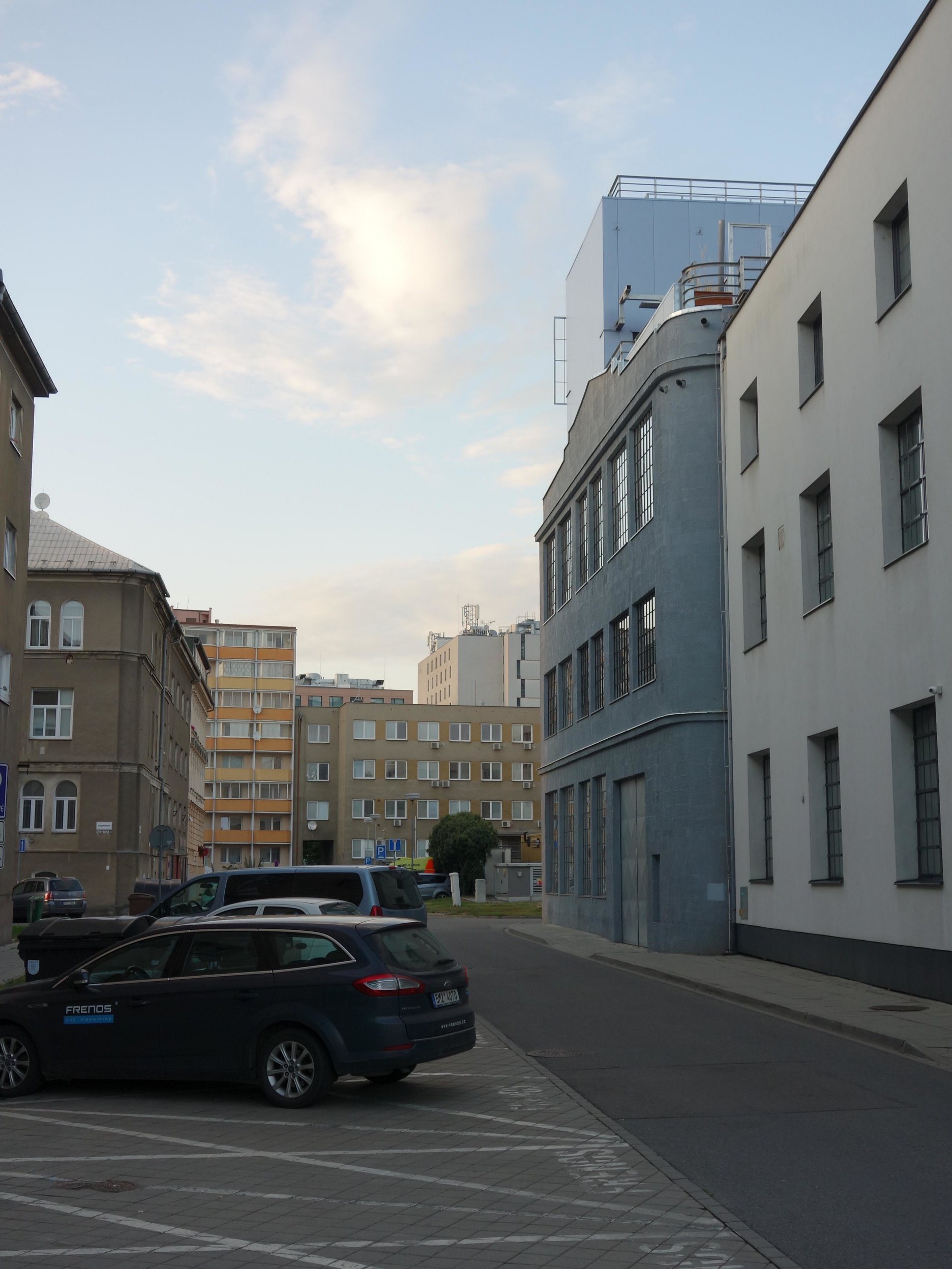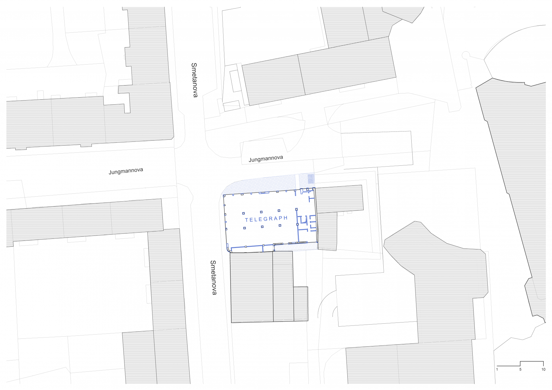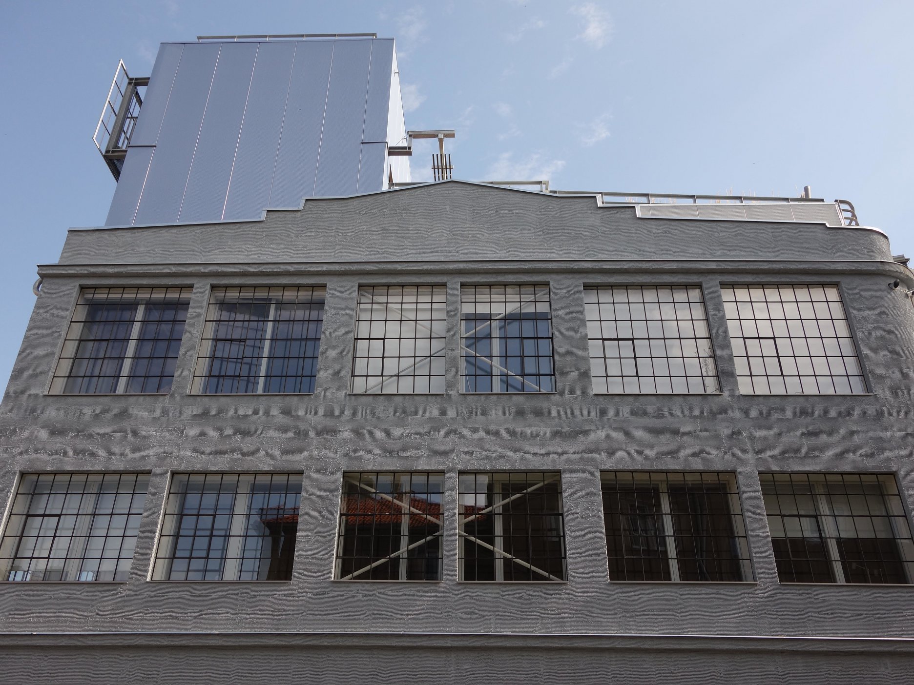 Adaptace skeletové budovy pro nový program nebyla jednoduchá – program byl větší než budova, nepodařilo se koupit vedlejší malý dům a zároveň nebylo možné překročit počet modulů určených pro galerii. Původní objekt je zvenku památkářsky zachován. Etážová výroba – to jsou schodiště a podlaží – původní princip. Komprimovali jsme zázemí do jednoho a půl modulu. Přesunuli jsme výtah a ke schodišti přibyl světlík v půlmodulu. Do domu je vložena stěna „žiletka“ z červených těžkých akustických cihel. Ta je viditelná, neomítnutá, ta odděluje schodiště a nový provoz na patrech.