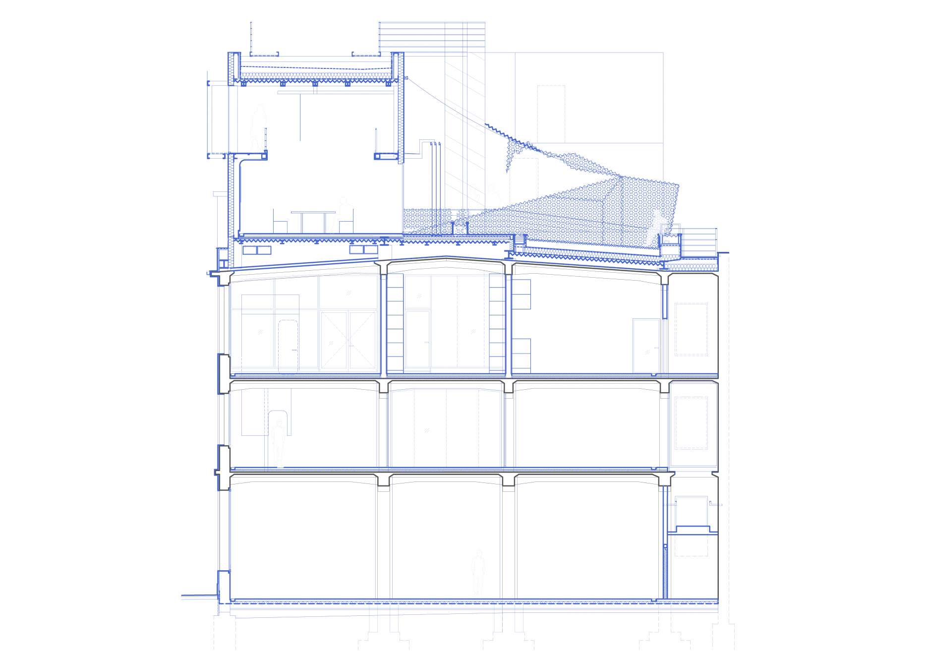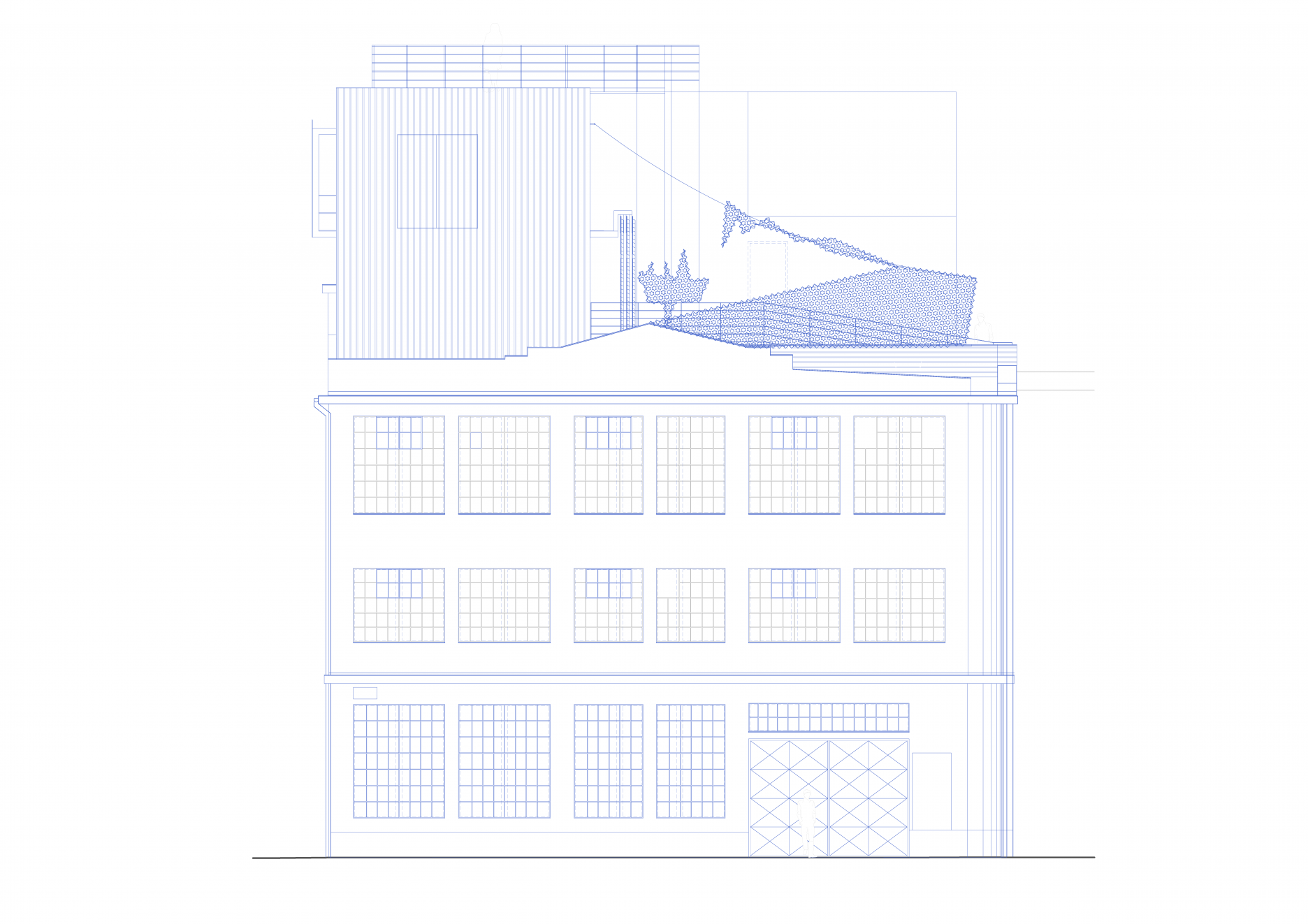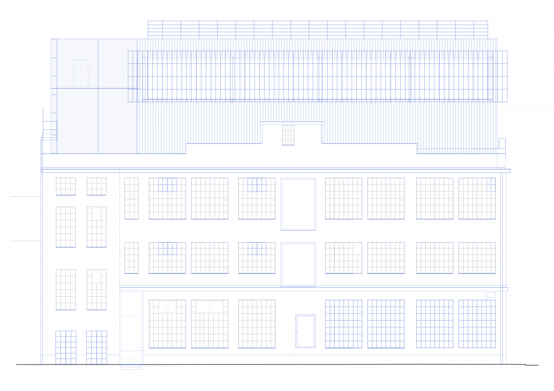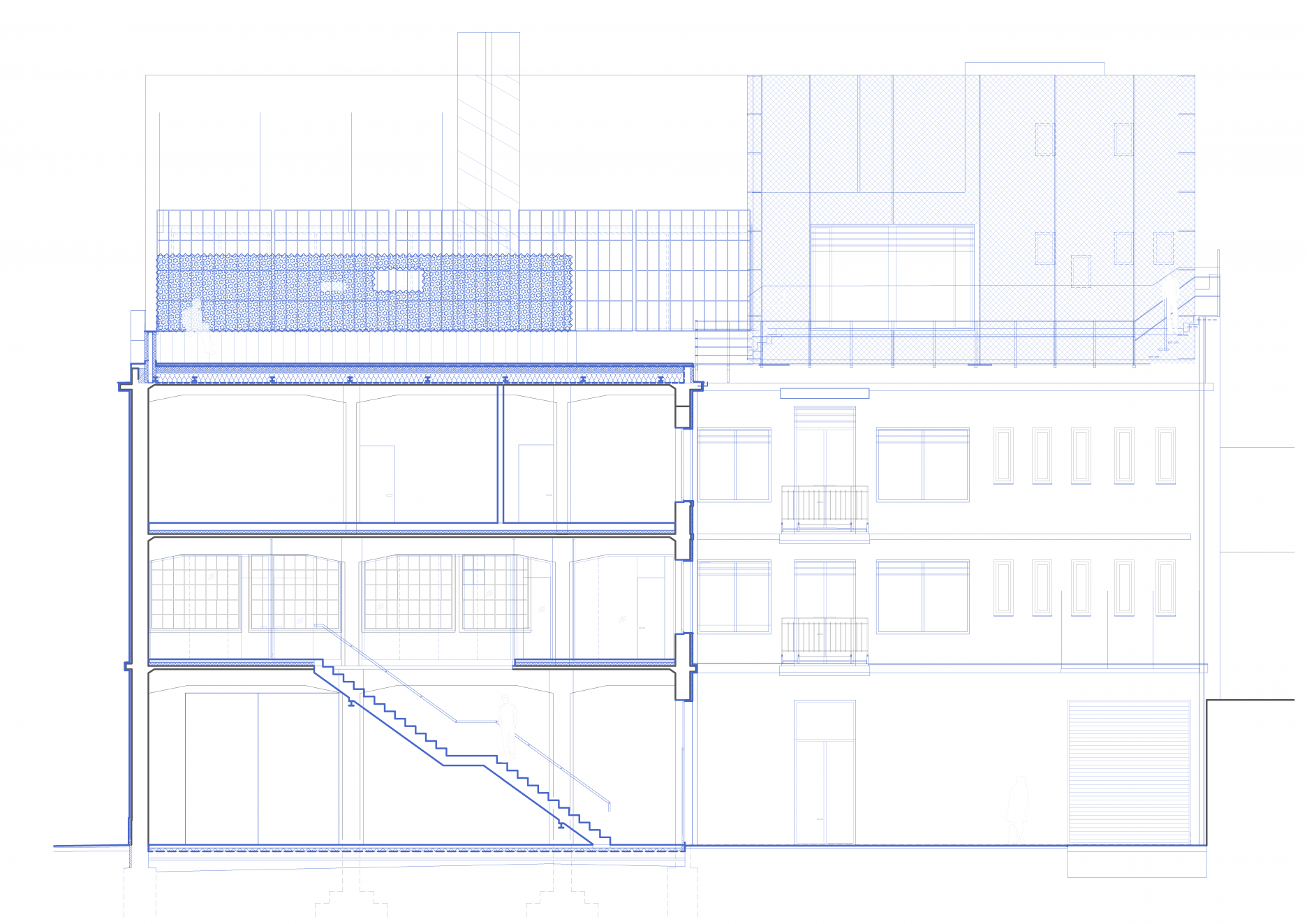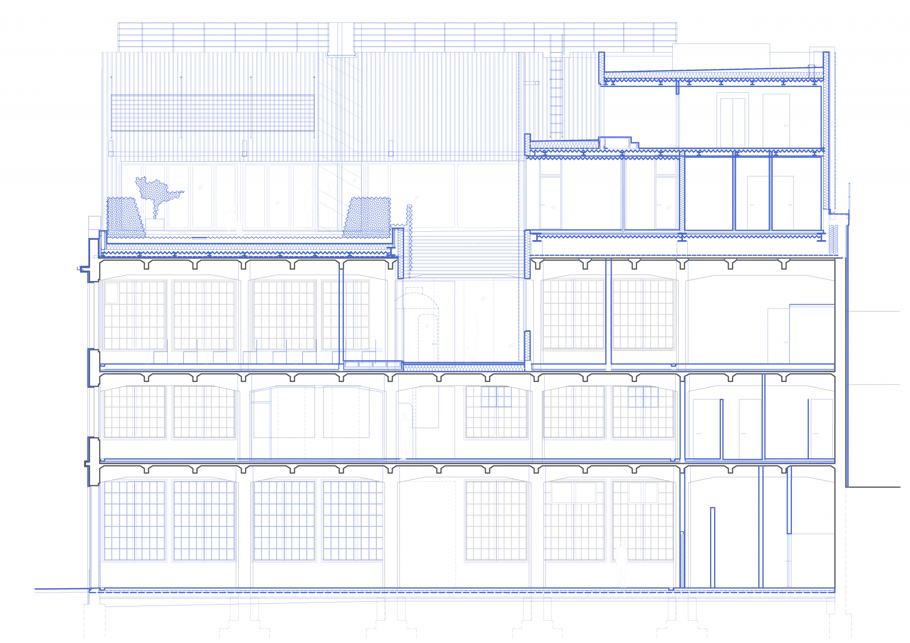 Historický skelet v spojení a ľahkou oceľovou nadstavbou. Otvorená dispozícia s priehľadmi cez celý objekt, vloženie vertikálnych spojení, nové otvorené átrium spájajúce kaviareň so strešnou záhradou… Nová funkčná náplň s galériou, coworkingom, a kaviarňou.