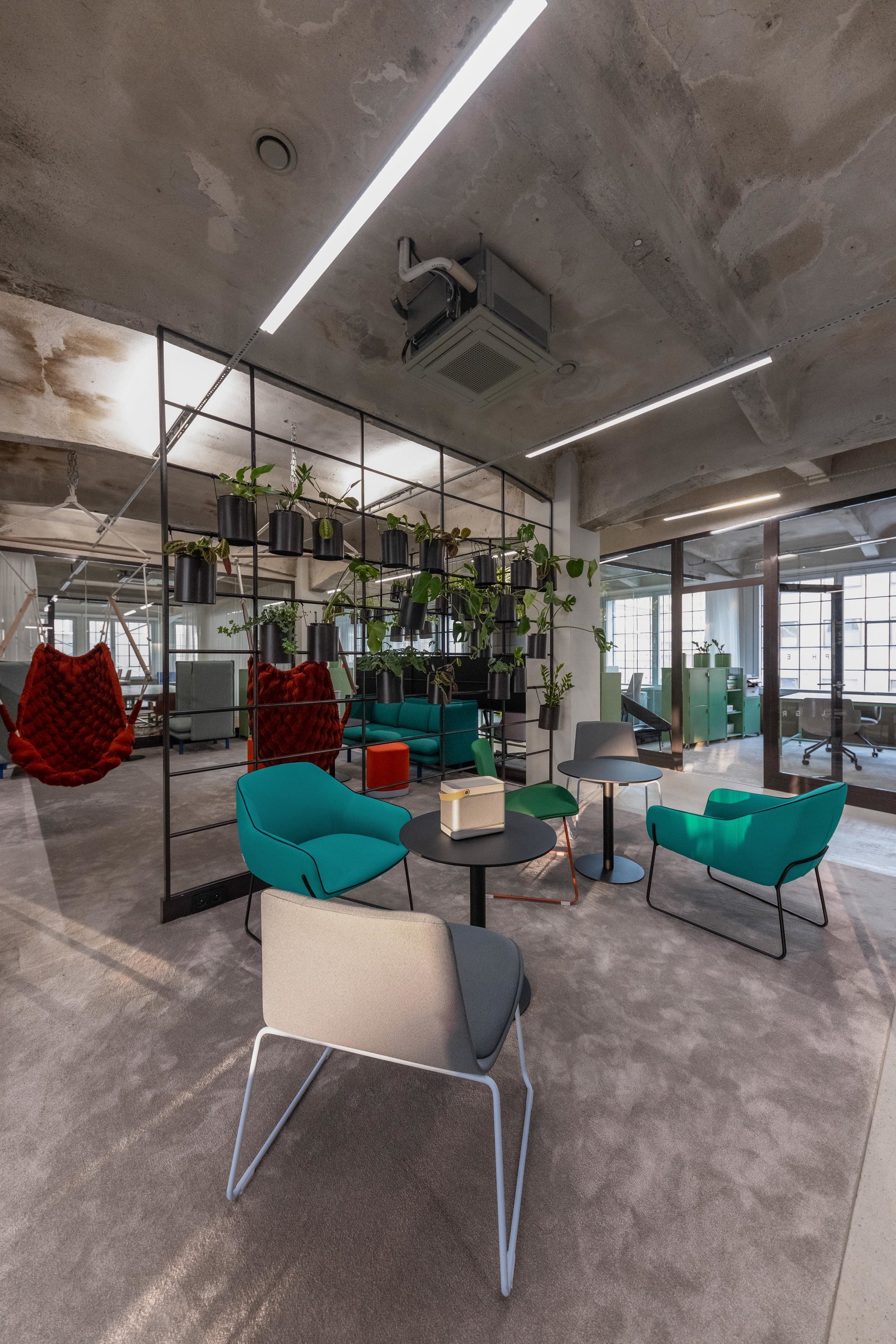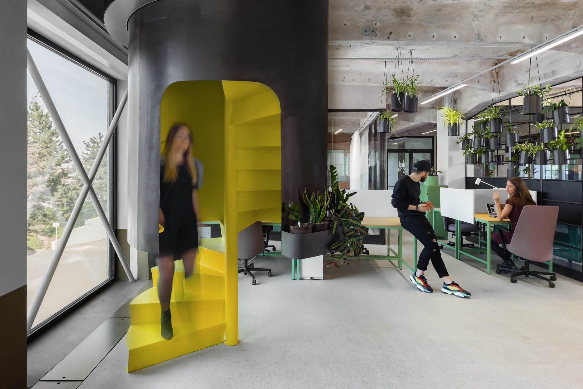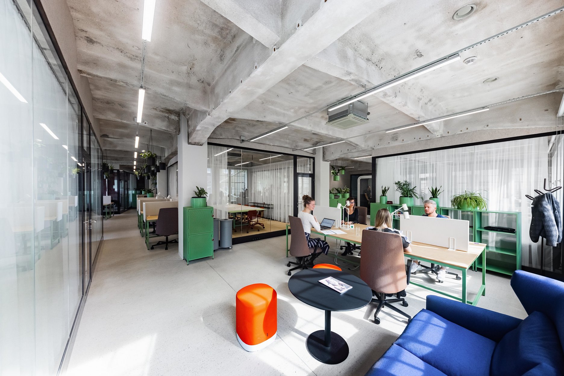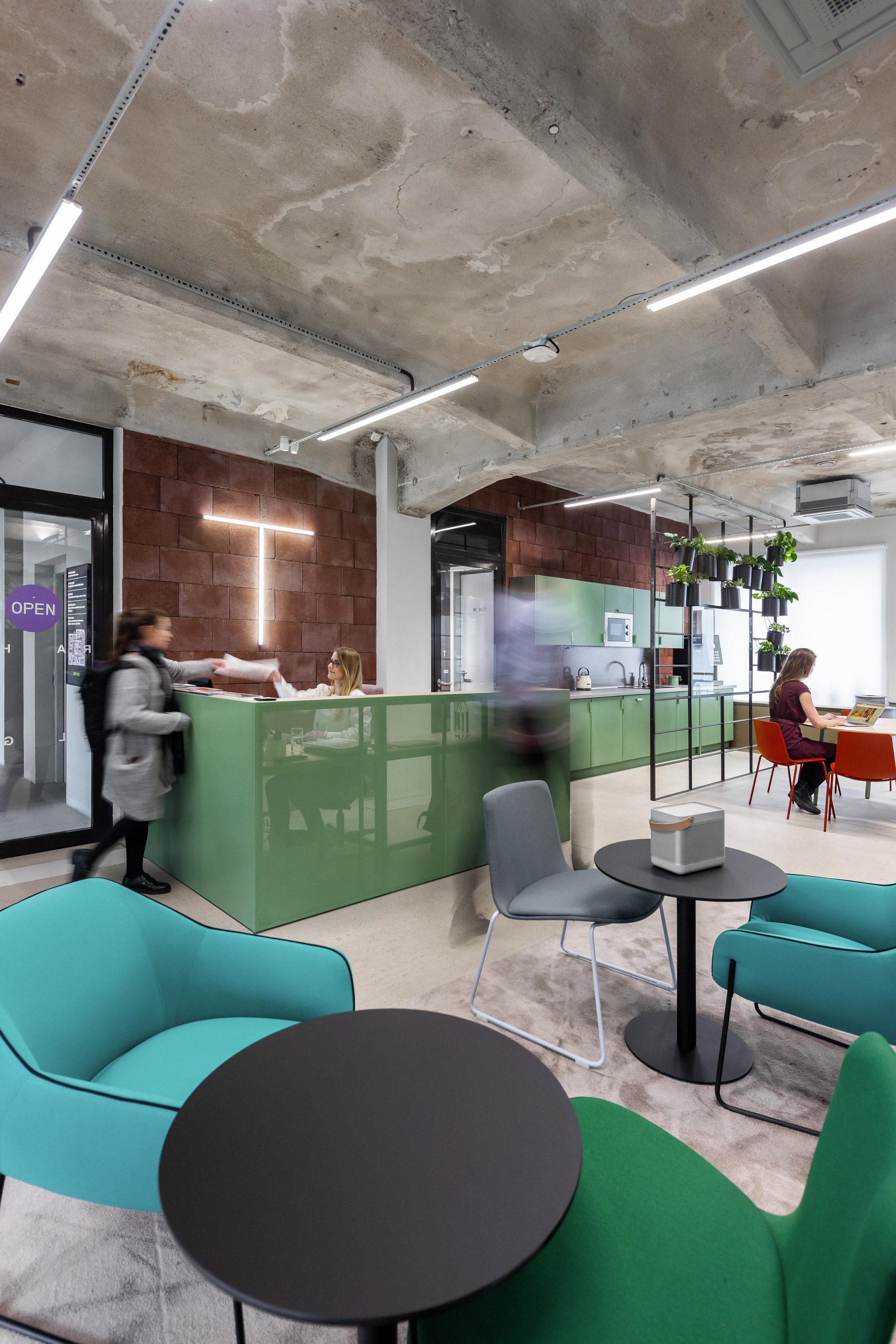 Coworkingové centrum je hybrid mezi zcela otevřenou kancelářskou krajinou a samostatnými kancelářemi. Mix umožňuje pestrost situací, tj.kvalitní kancelářský provoz. Půdorys je po obvodu prosvětlen ze tří stran. V hloubce dispozice je chillout zóna a zasedací místnost. Vnitřní schodiště je propojení coworku a kavárny v 3. NP. Prostor je komponován skeletem a průběžnými liniemi světel.