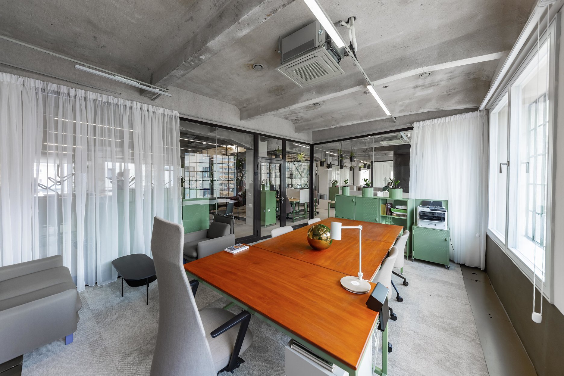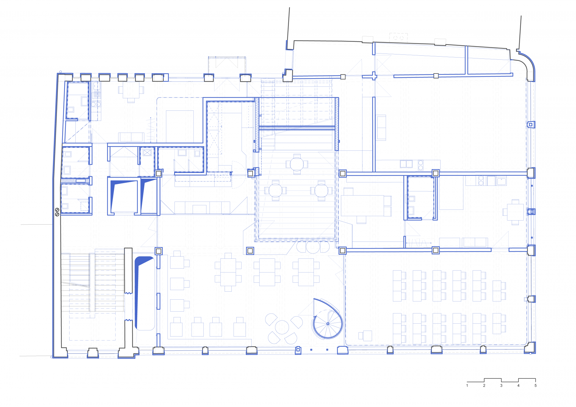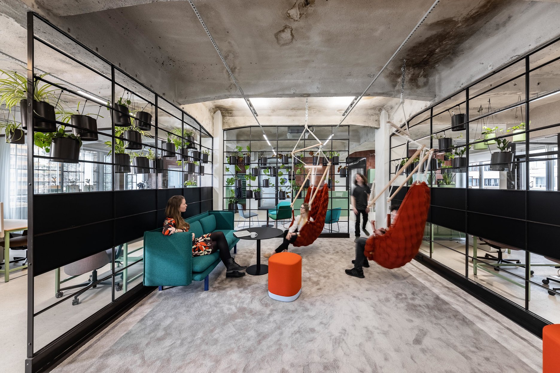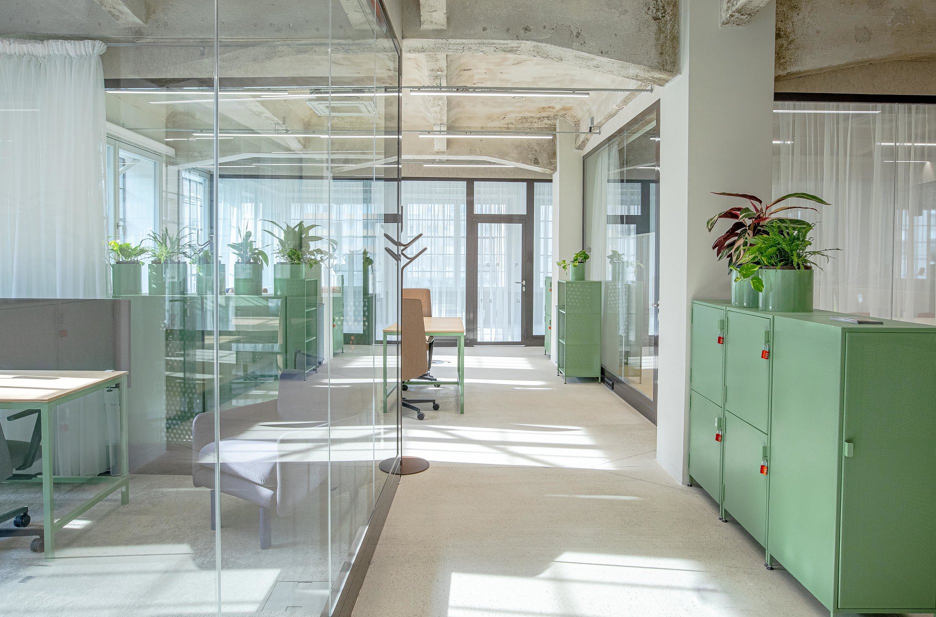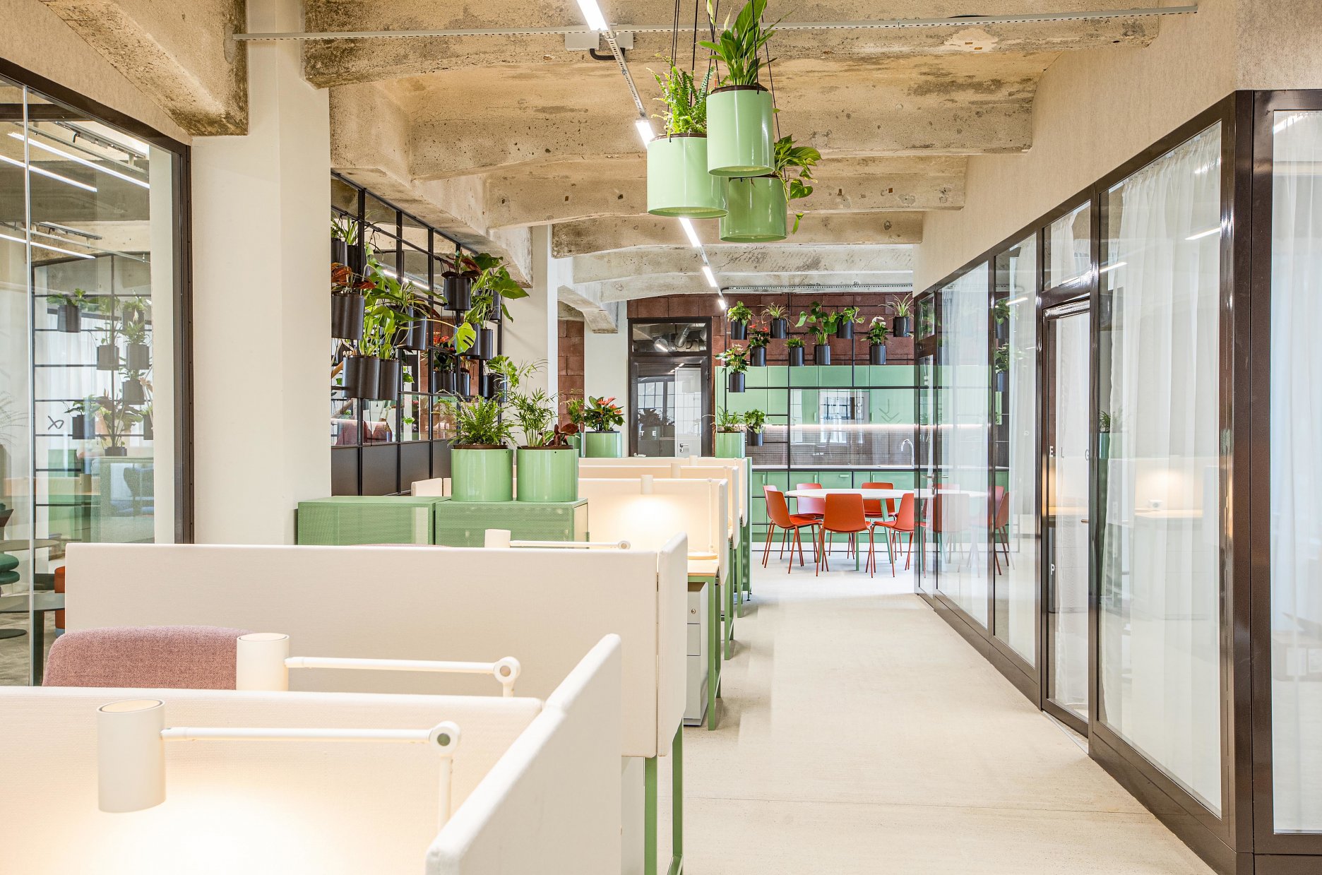 Coworkingové centrum je hybrid mezi zcela otevřenou kancelářskou krajinou a samostatnými kancelářemi. Mix umožňuje pestrost situací, tj.kvalitní kancelářský provoz. Půdorys je po obvodu prosvětlen ze tří stran. V hloubce dispozice je chillout zóna a zasedací místnost. Vnitřní schodiště je propojení coworku a kavárny v 3. NP. Prostor je komponován skeletem a průběžnými liniemi světel.