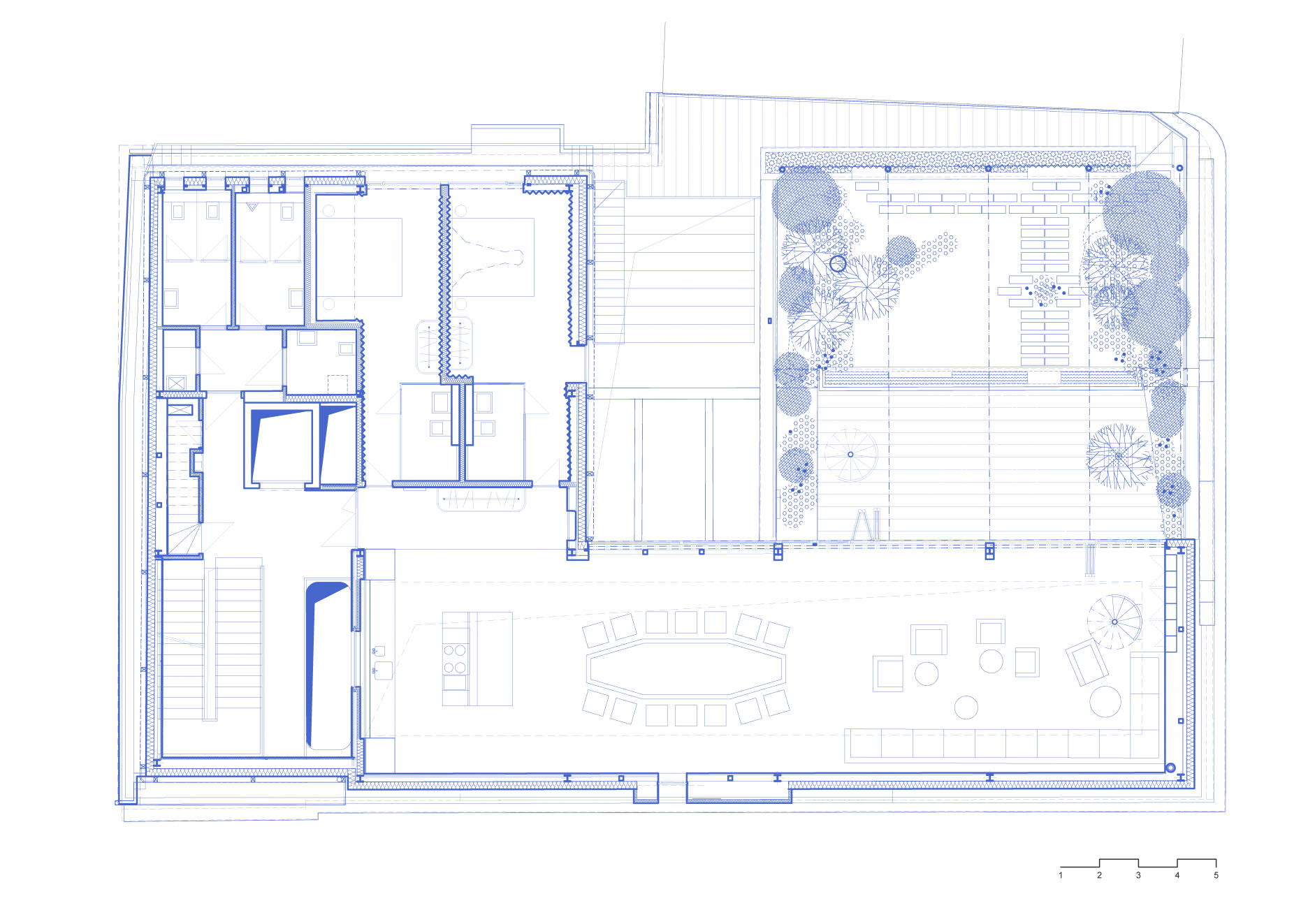 Celá nástavba je jiný svět. Původní dům – střih – nástavba. Dole kvalitní prostředí pro práci a občerstvení vs. kvalitní prostředí pro slavností pobyt a dobrou party. Jakoby extrakt zásadních momentů z typologie vily.