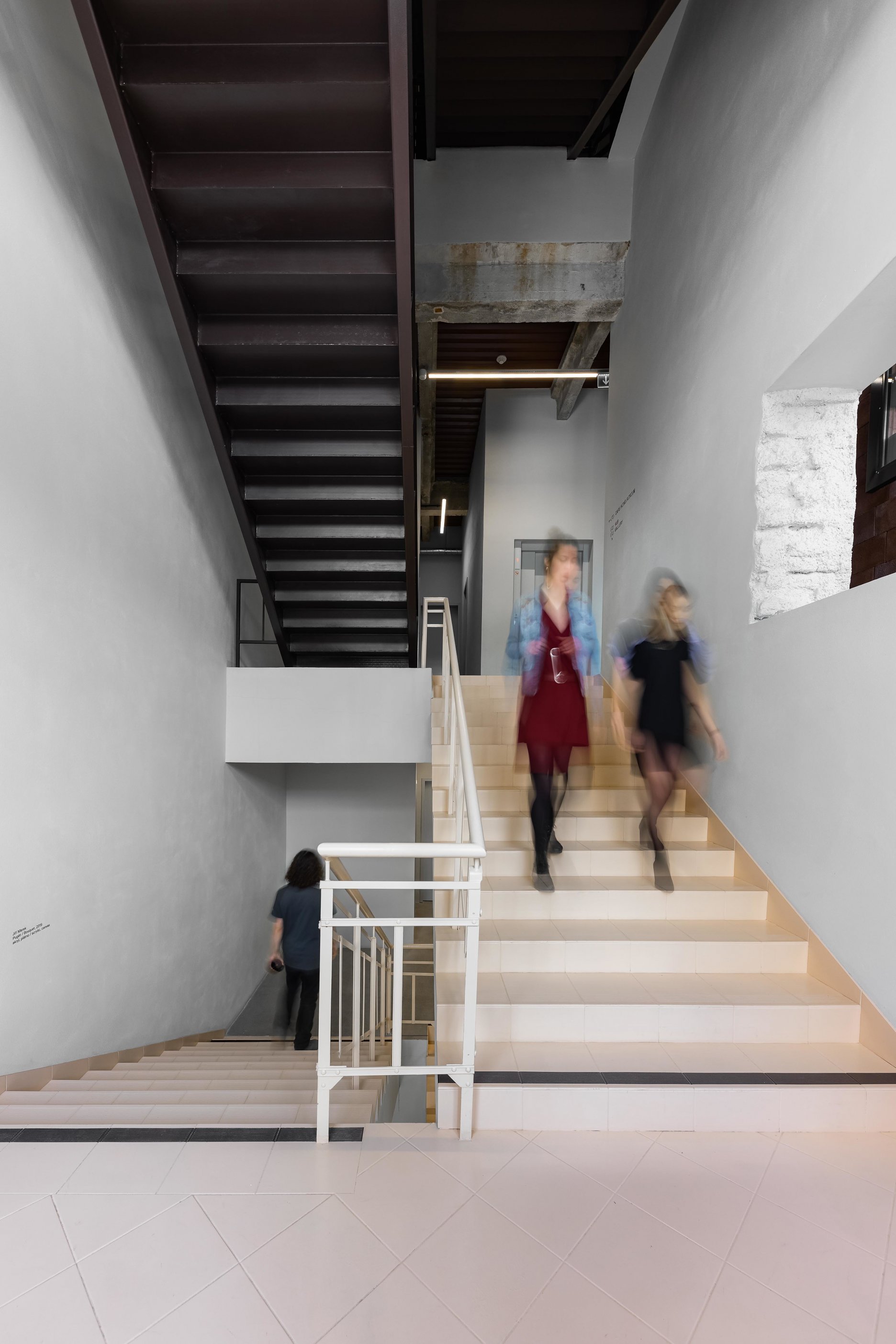 Galerie v 1.NP = nová technologie. Už tu nejsou stroje, ale kurátorsky silné výstavy s náročným architektonickým pojetím. Otryskaný (očištěný) skelet byl doplněn univerzálním roštem pro světla a paravany.