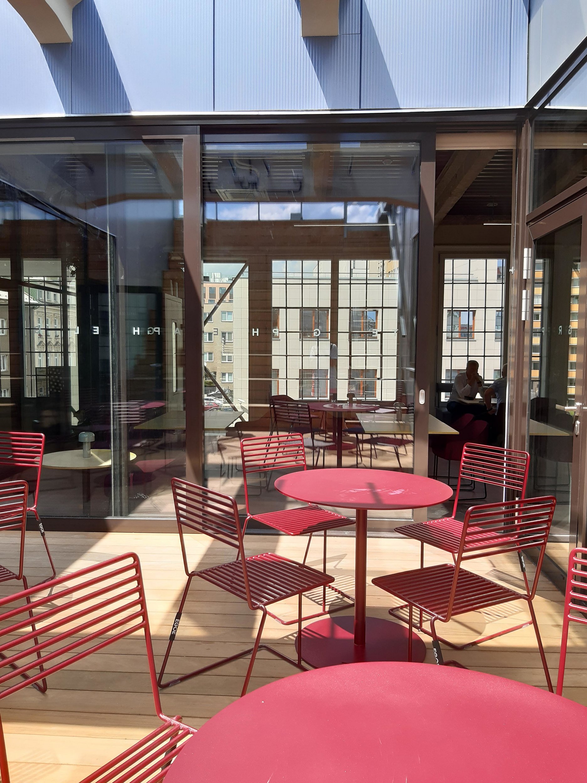 Stoly jsou tvarované jako ponky, knihovny jako skříňky v šatnách pro dělníky. Barevnost ze základních odstínů je v barvách soustruhů, frézek… Základní fabrikantská zelená, modrá jako na jeřábu, oranžová jako na rukojeti kladiva… Soubor zrcadel odkazuje k ochranným sklům na strojích, které chrání před odletujícími jiskrami. Nově použité materiály na toto navazují – trapézový plech, vroubkovaná guma původně určená pro dopravníkové pásy (vroubky k unášení sypkého materiálu jsou zde ozdobou).