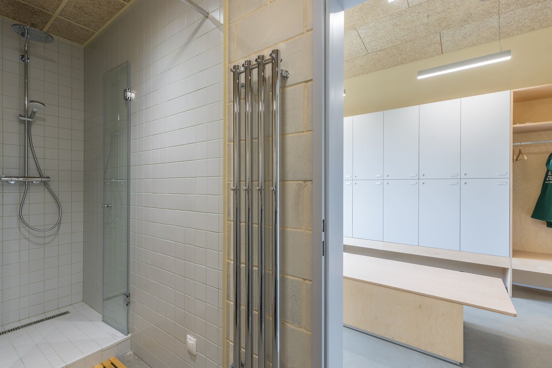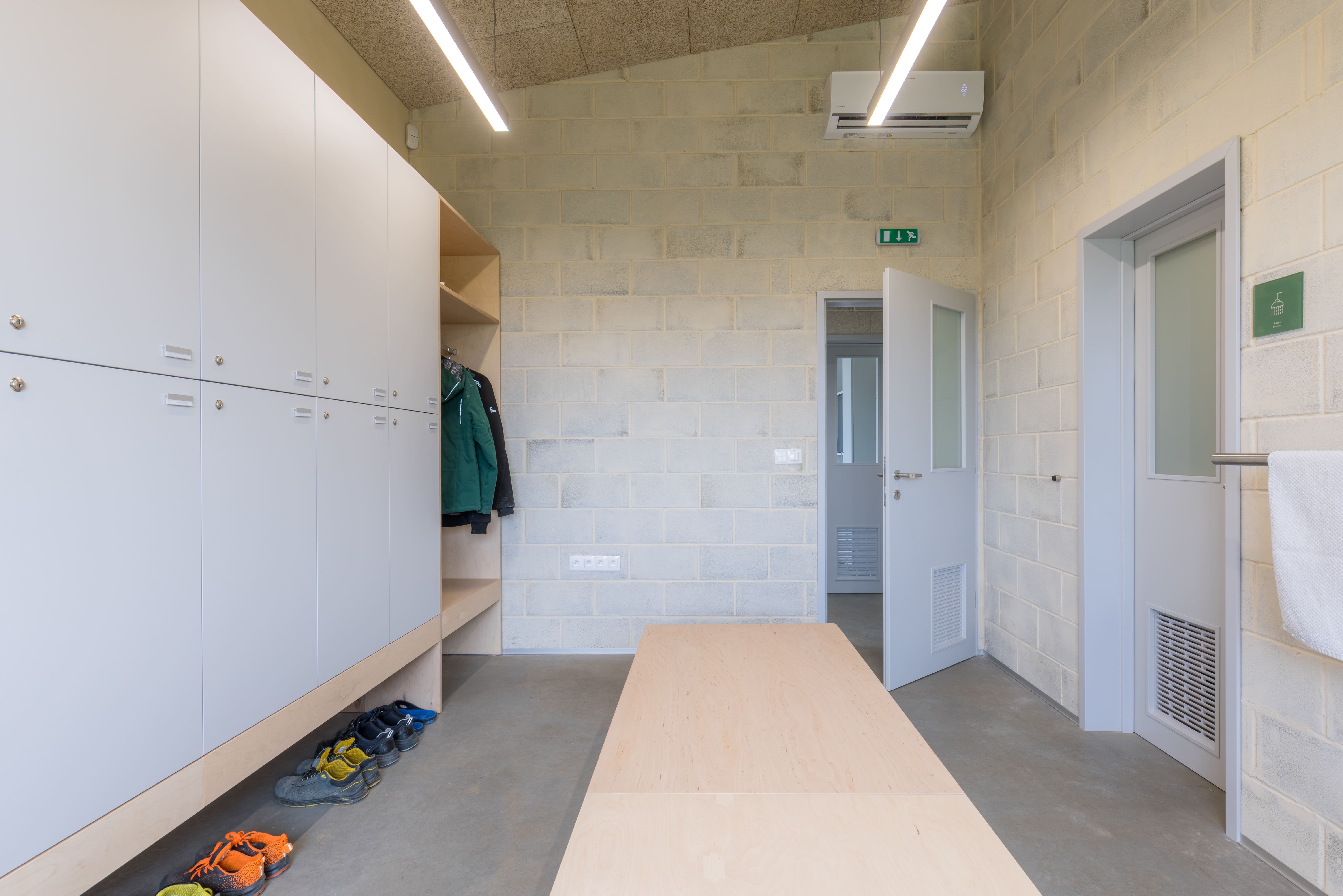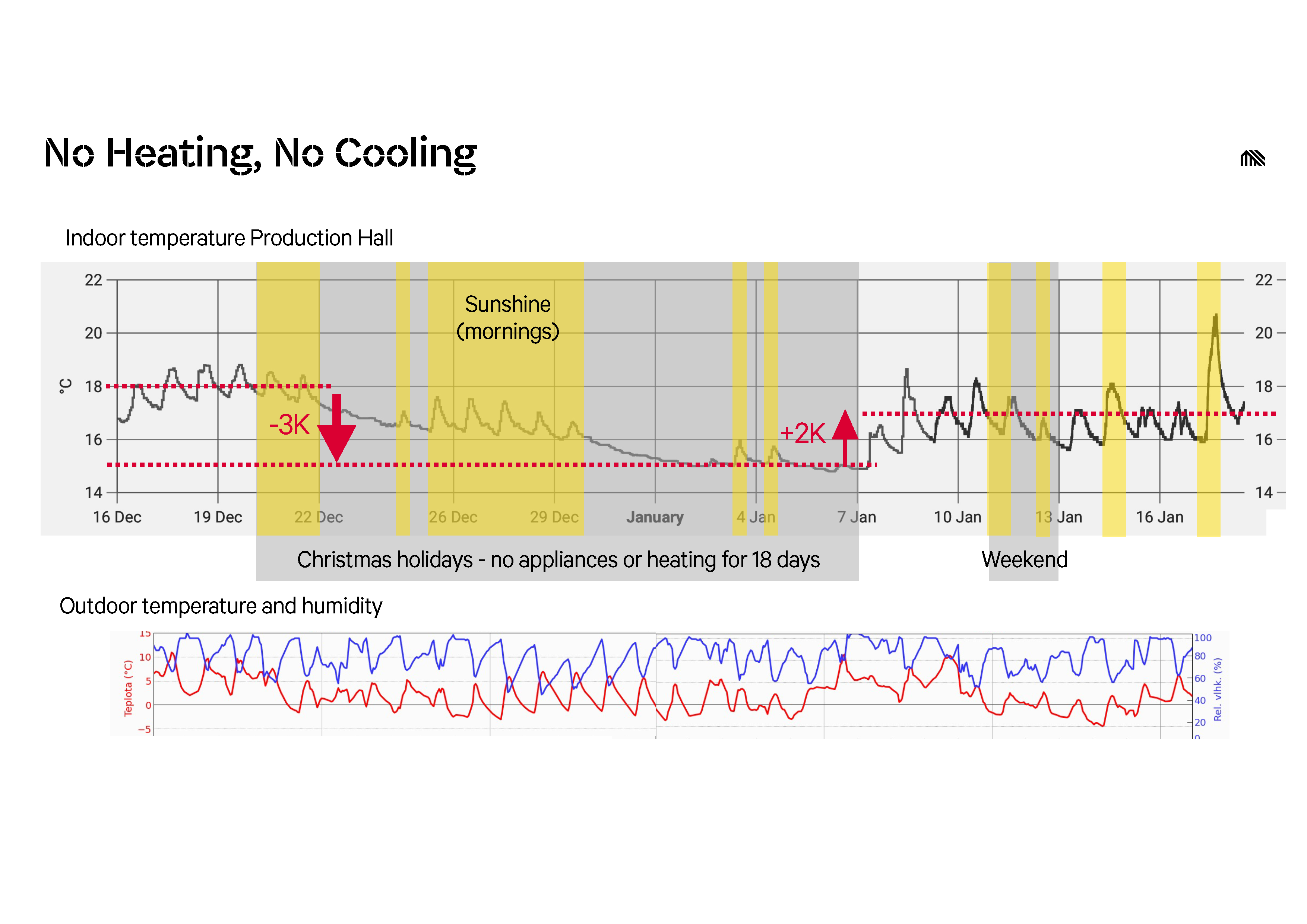 Výrobný priestor je vďaka tepelnoizolačným vlastnostiam obálky a vysokej vzduchotesnosti (BDT 0,14 1/h) temperovaný iba vnútorným prebytočným teplom zo strojov, bez potreby aktívneho kúrenia a chladenia. Tepelný komfort v letných mesiacoch zabezpečuje pasívne nočné vetranie a ochladzovaním cez otvorené okenné otvory.