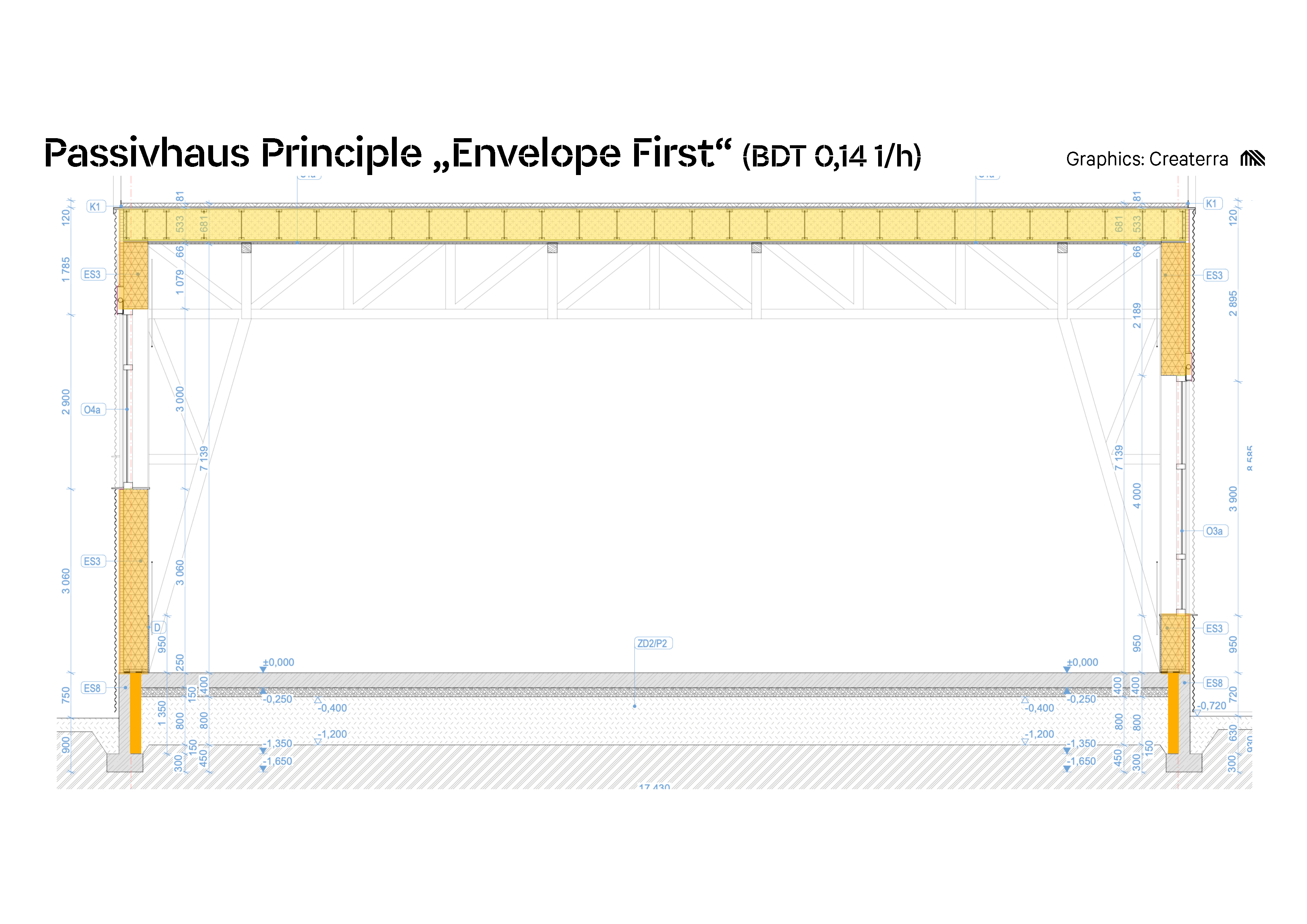 Základy stavby sú koncipované tak, aby boli priamo prepojené s tepelnou stabilitou zeme bez ďalšej tepelnej izolácie, čo prispieva k energetickej efektívnosti budovy.